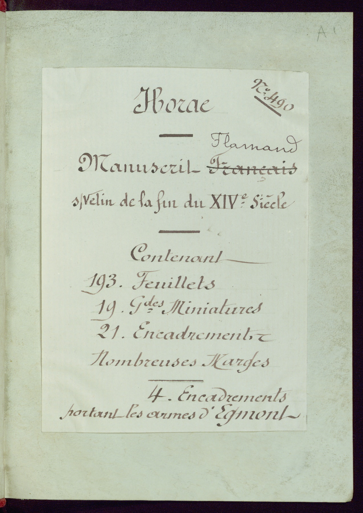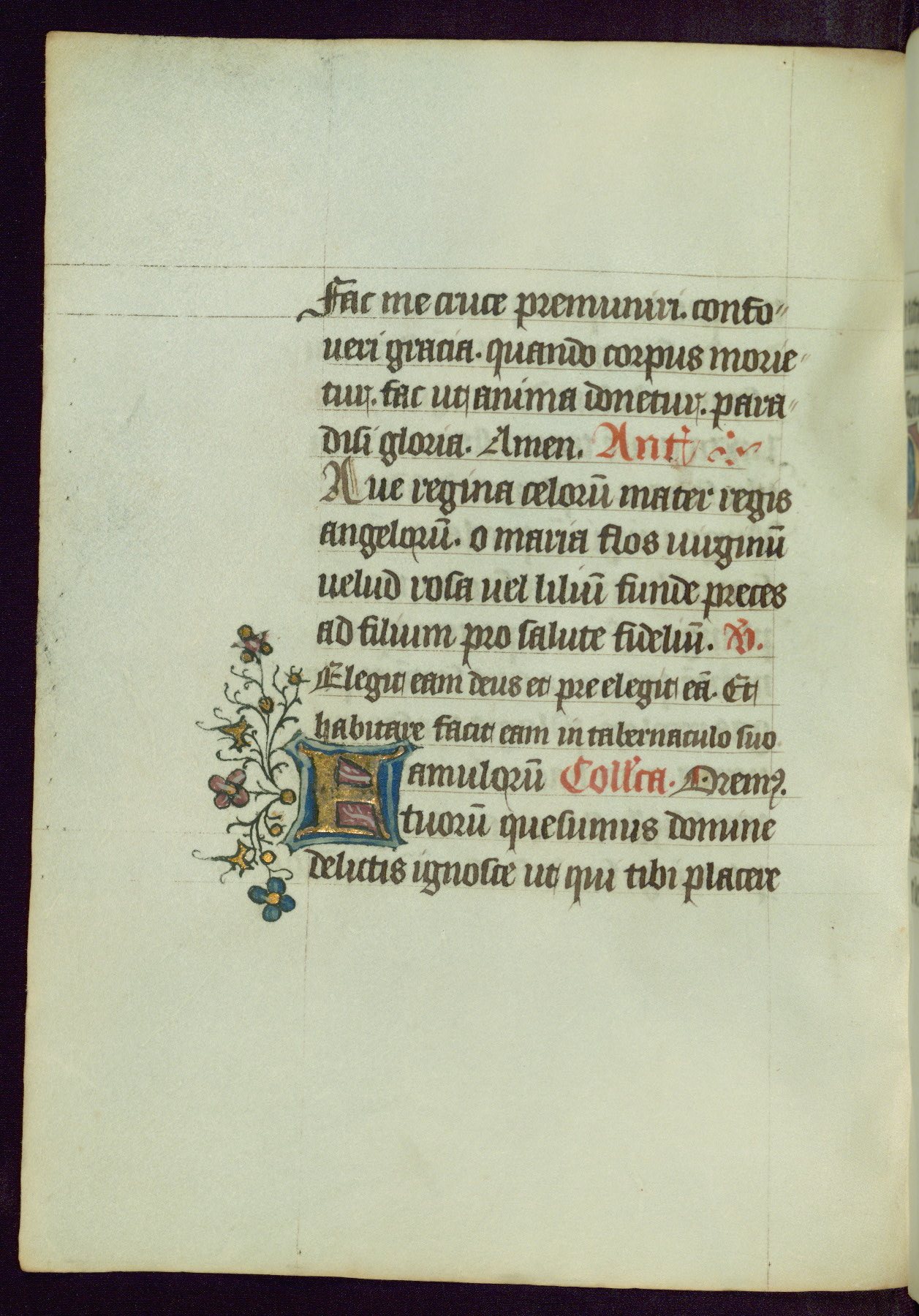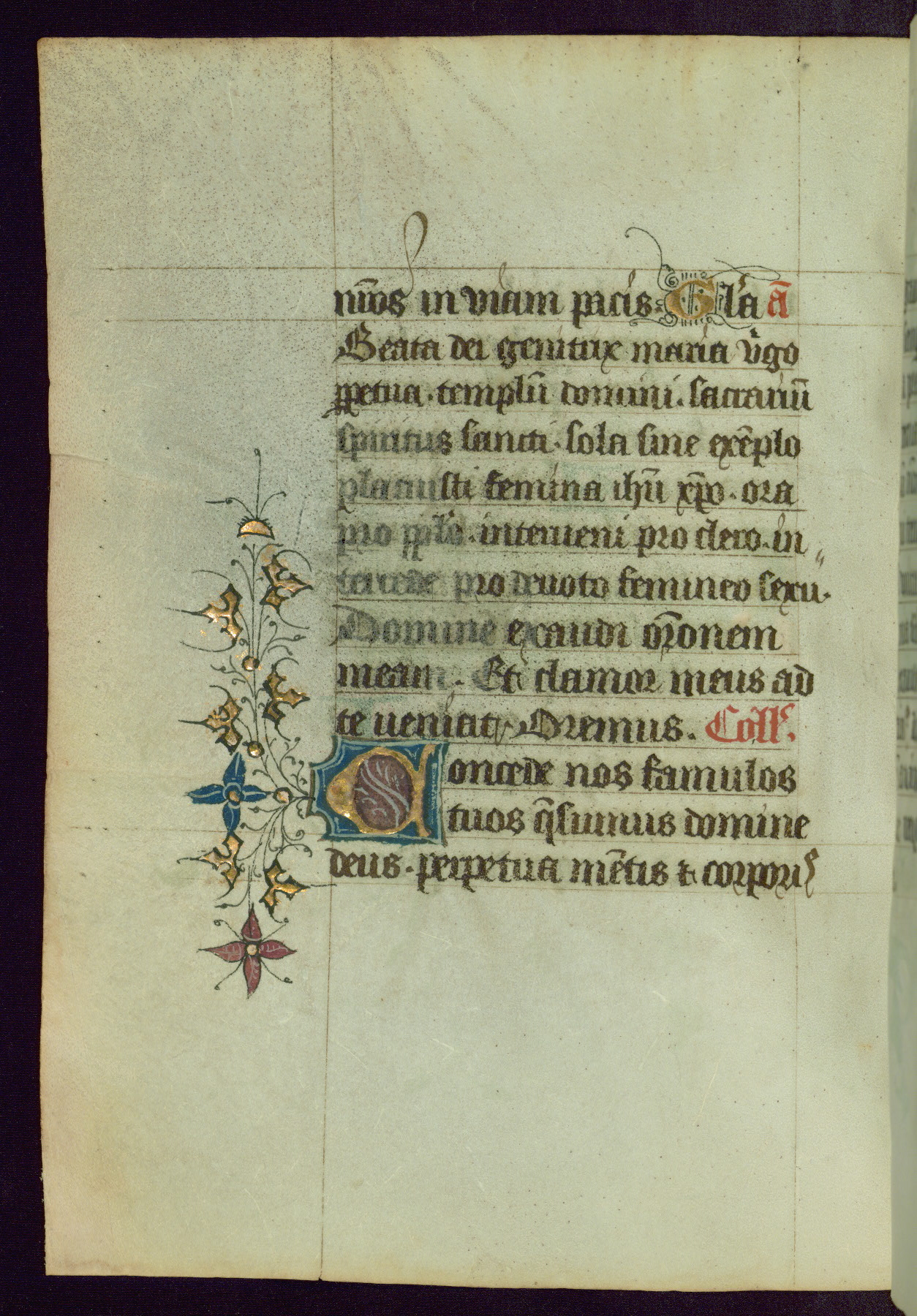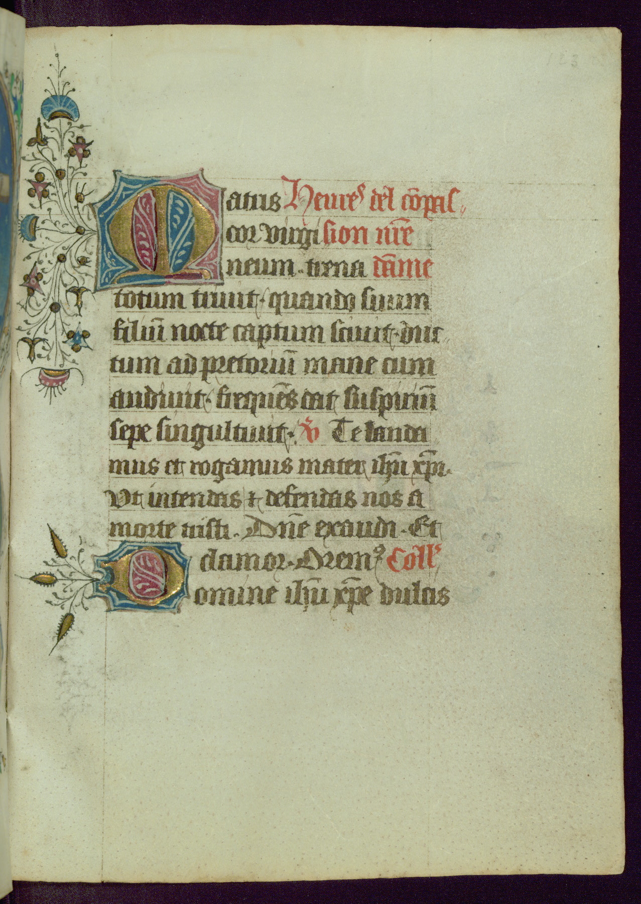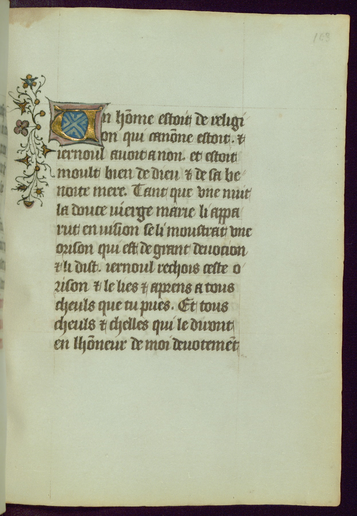 This Book of Hours was completed ca. 1450, illuminated by the Master of Ghent Privileges and associates. The first owner is depicted in the border of fol. 13v as well as arms of the Egmont family of Guelders, found in the margins nearby. On front flyleaf iir, a note indicates that the manuscript was given by Francois de Bonge to an unidentified recipient in memory of a close friend. While many prayers are in Latin, there is a strong presence of French found in rubrics, headings, and several narratives (tales of a canon's dream sequence, the salvation of a nun, and directives for prayers that would result in a vision of the Virgin three days before the supplicant's death) paired with prayers and devotions in Latin.
