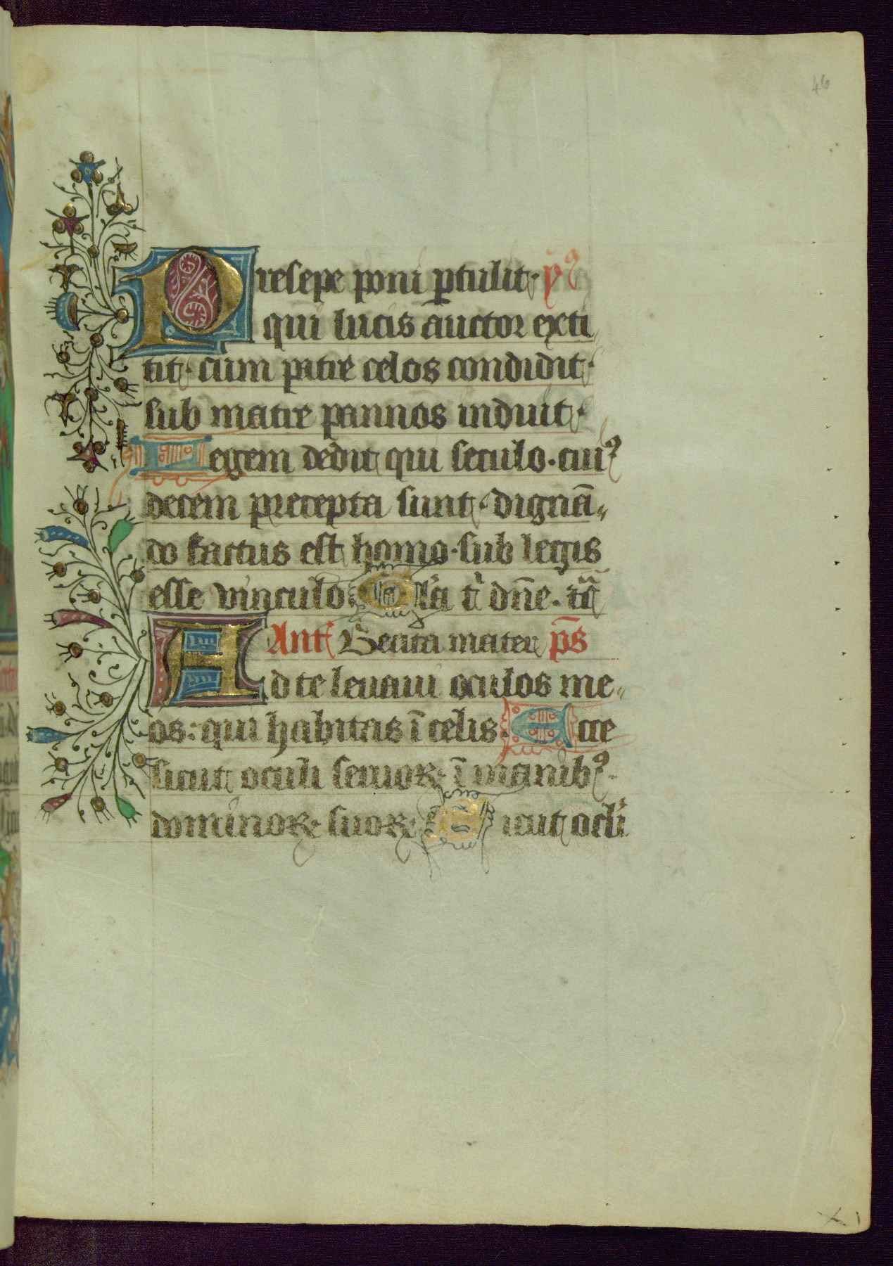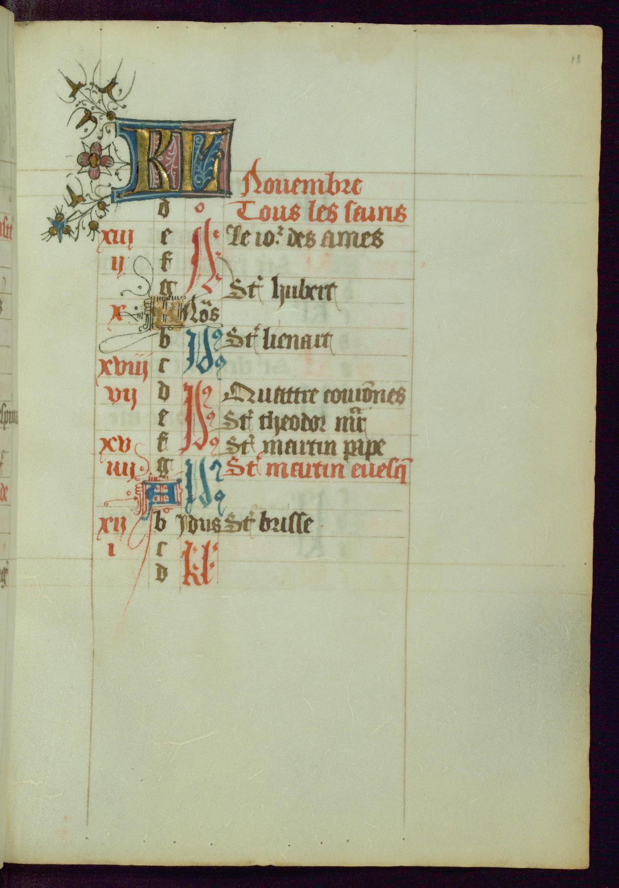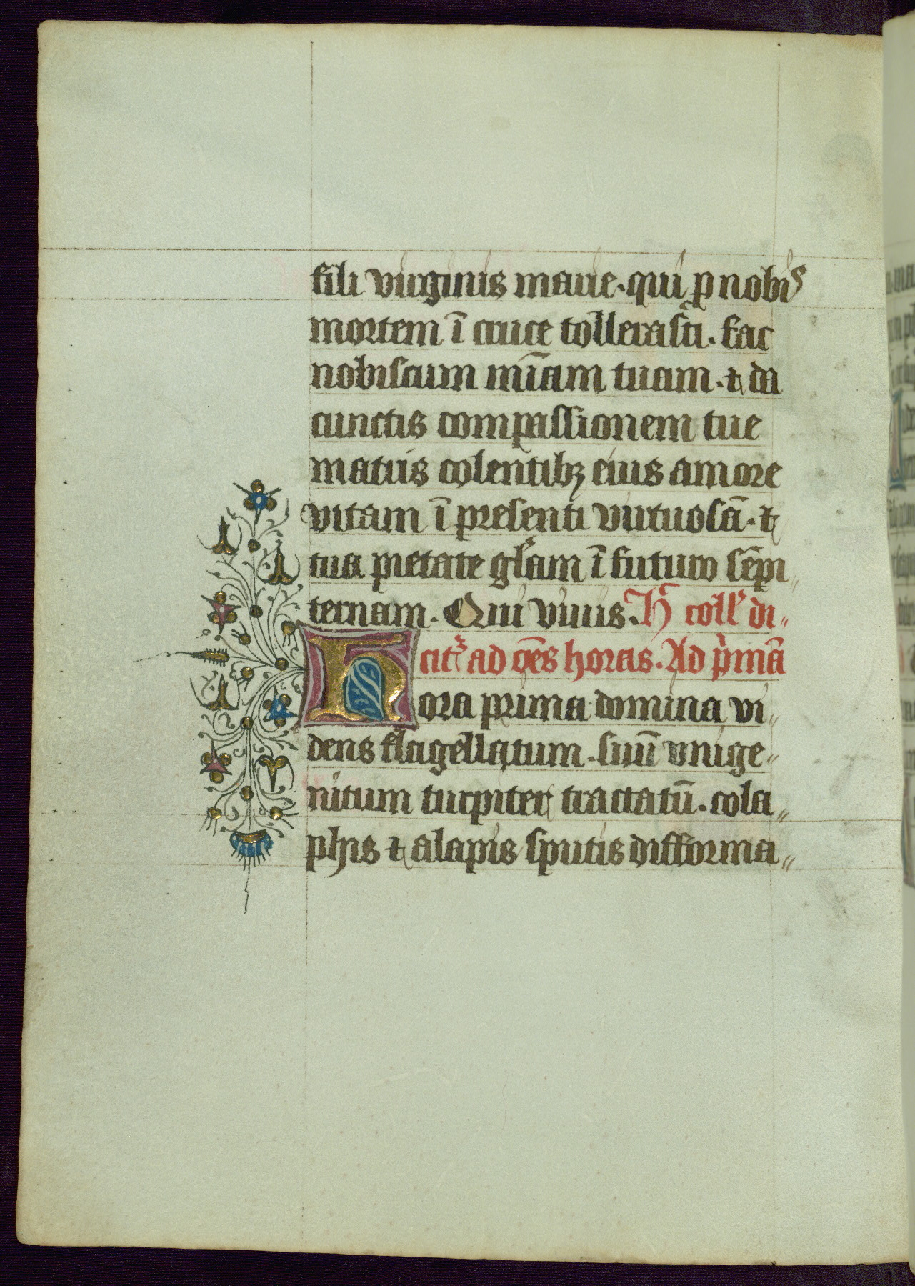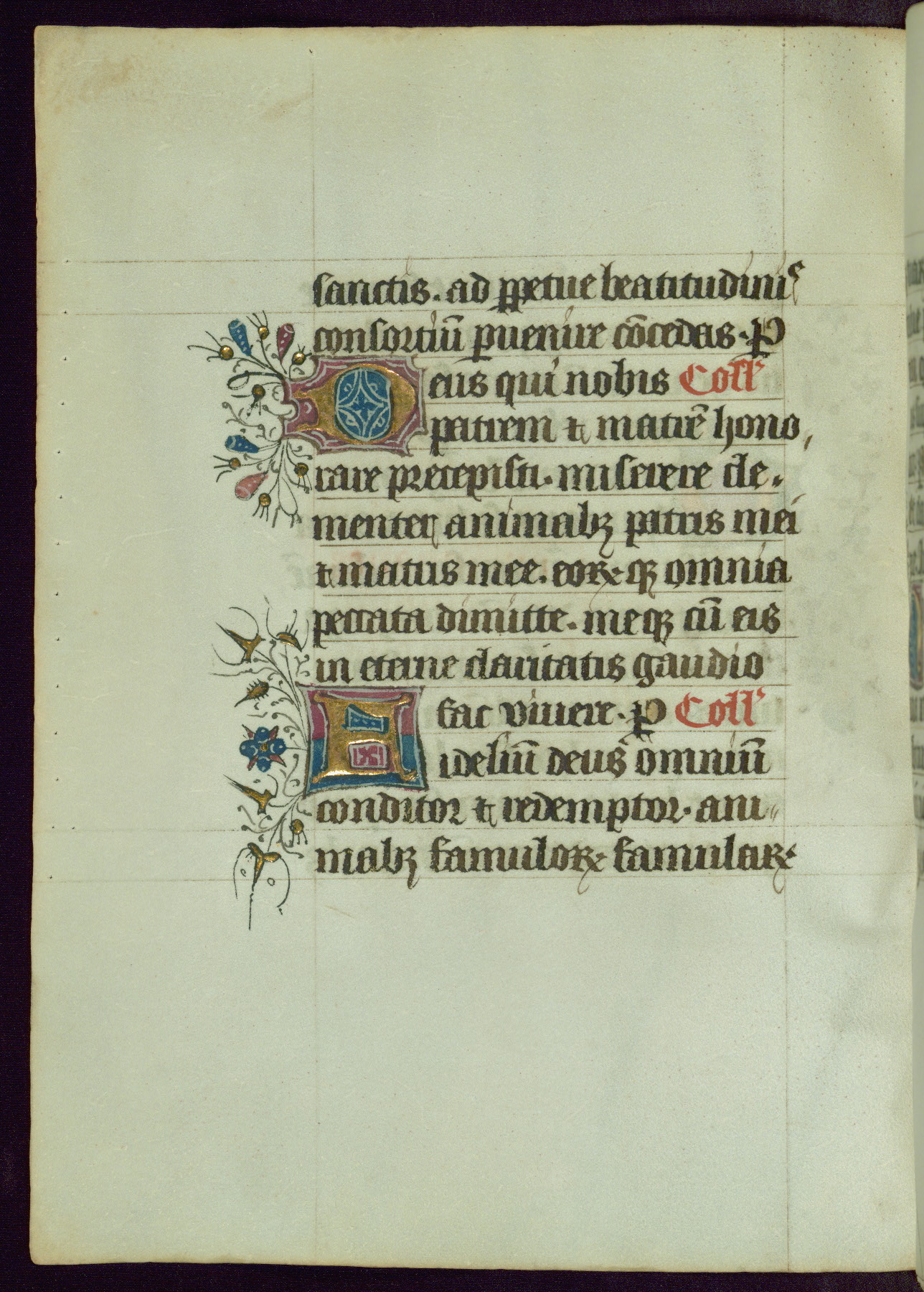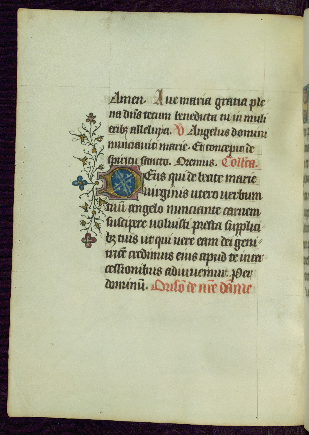 This Book of Hours was completed ca. 1450, illuminated by the Master of Ghent Privileges and associates. The first owner is depicted in the border of fol. 13v as well as arms of the Egmont family of Guelders, found in the margins nearby. On front flyleaf iir, a note indicates that the manuscript was given by Francois de Bonge to an unidentified recipient in memory of a close friend. While many prayers are in Latin, there is a strong presence of French found in rubrics, headings, and several narratives (tales of a canon's dream sequence, the salvation of a nun, and directives for prayers that would result in a vision of the Virgin three days before the supplicant's death) paired with prayers and devotions in Latin.