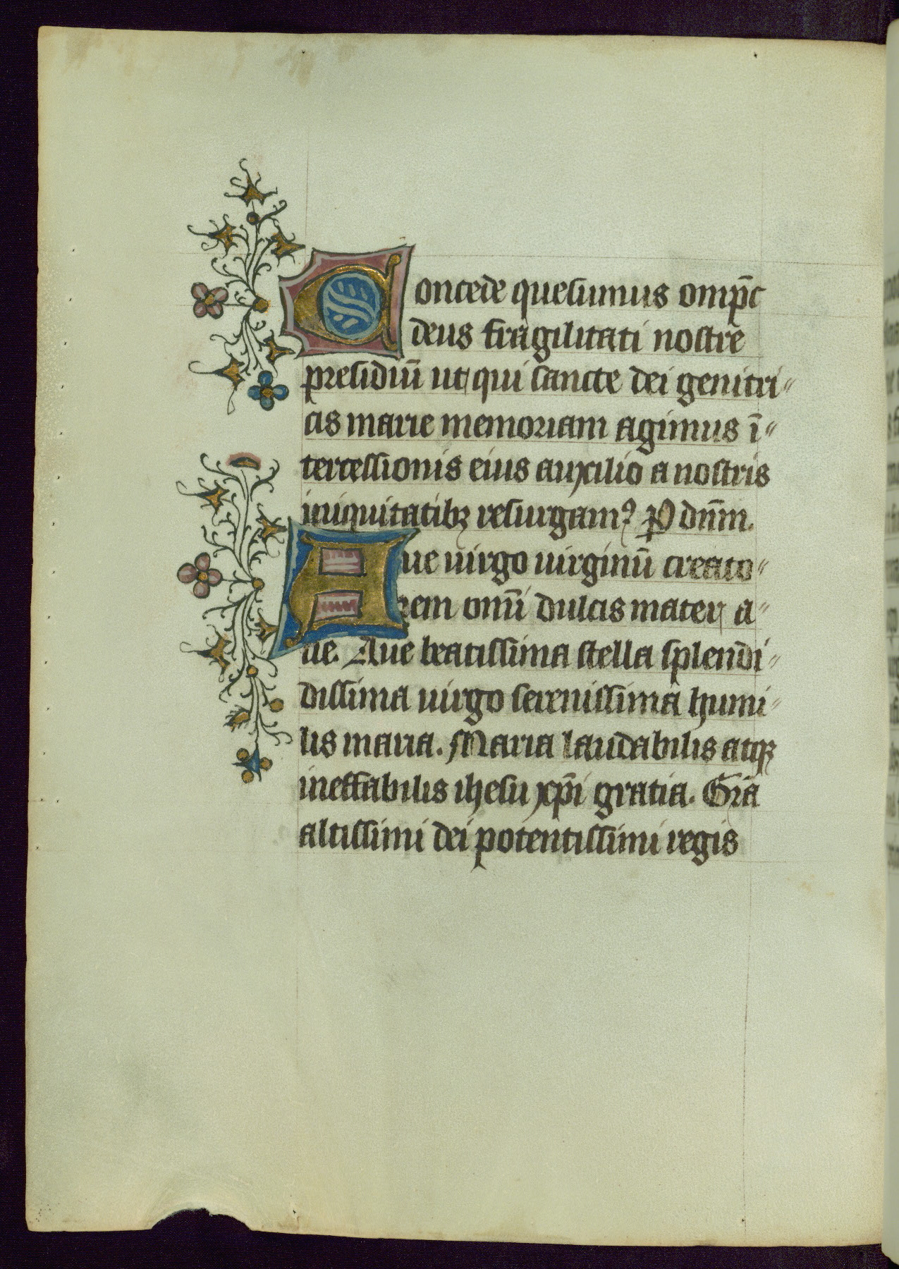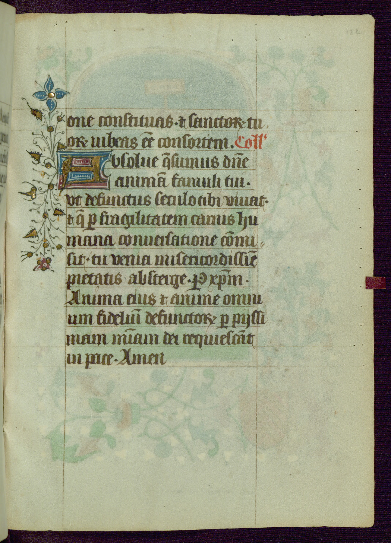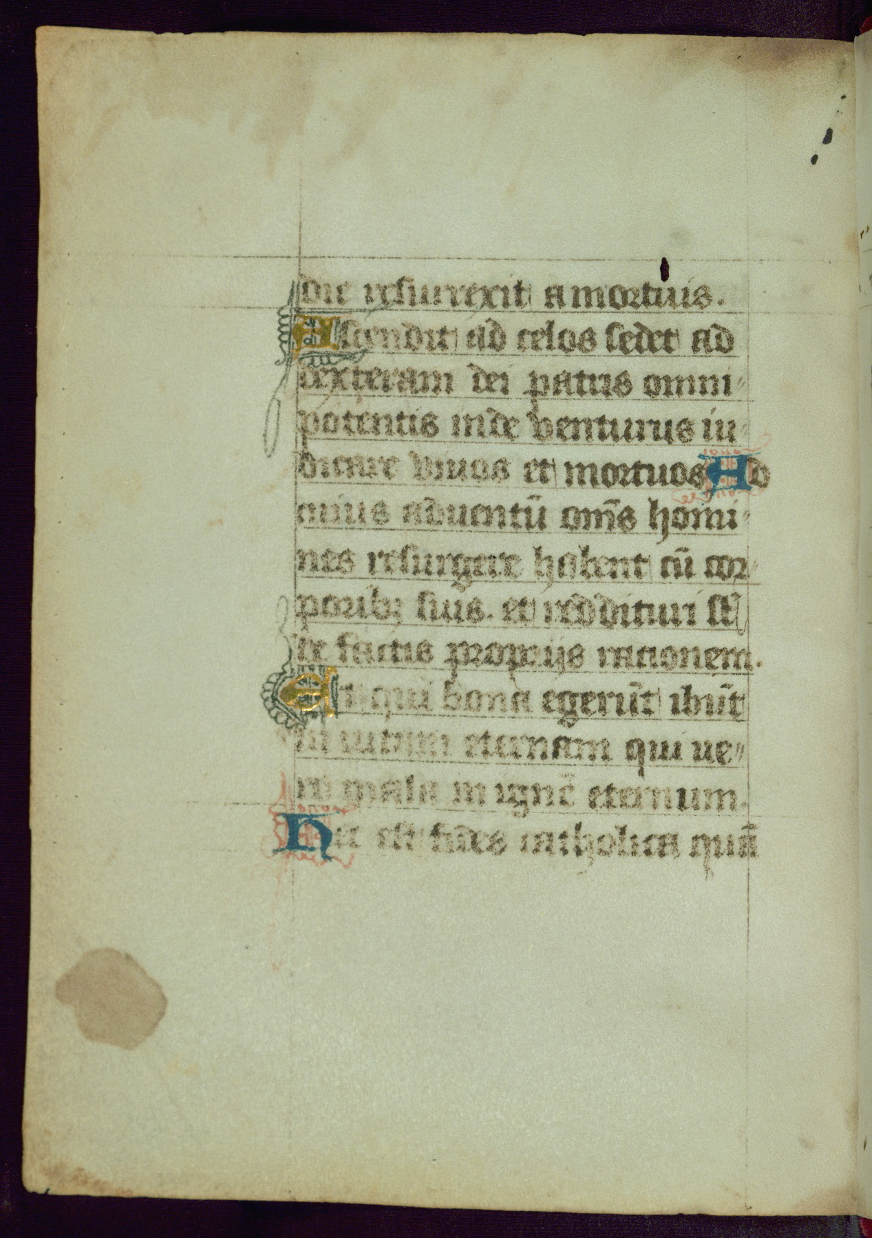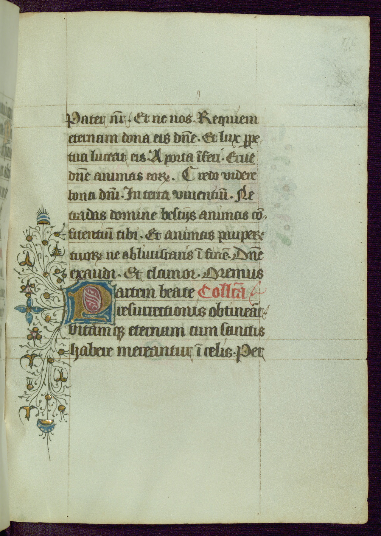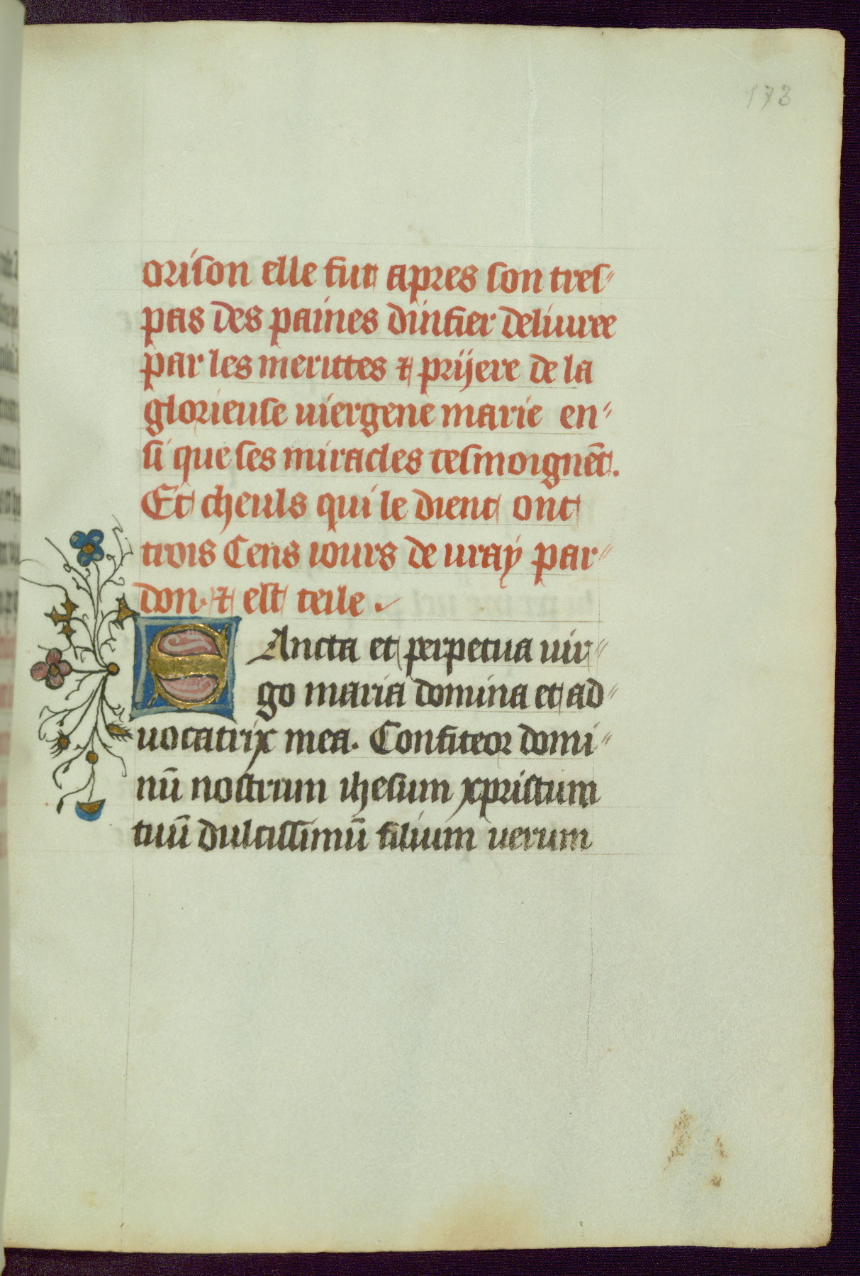 This Book of Hours was completed ca. 1450, illuminated by the Master of Ghent Privileges and associates. The first owner is depicted in the border of fol. 13v as well as arms of the Egmont family of Guelders, found in the margins nearby. On front flyleaf iir, a note indicates that the manuscript was given by Francois de Bonge to an unidentified recipient in memory of a close friend. While many prayers are in Latin, there is a strong presence of French found in rubrics, headings, and several narratives (tales of a canon's dream sequence, the salvation of a nun, and directives for prayers that would result in a vision of the Virgin three days before the supplicant's death) paired with prayers and devotions in Latin.