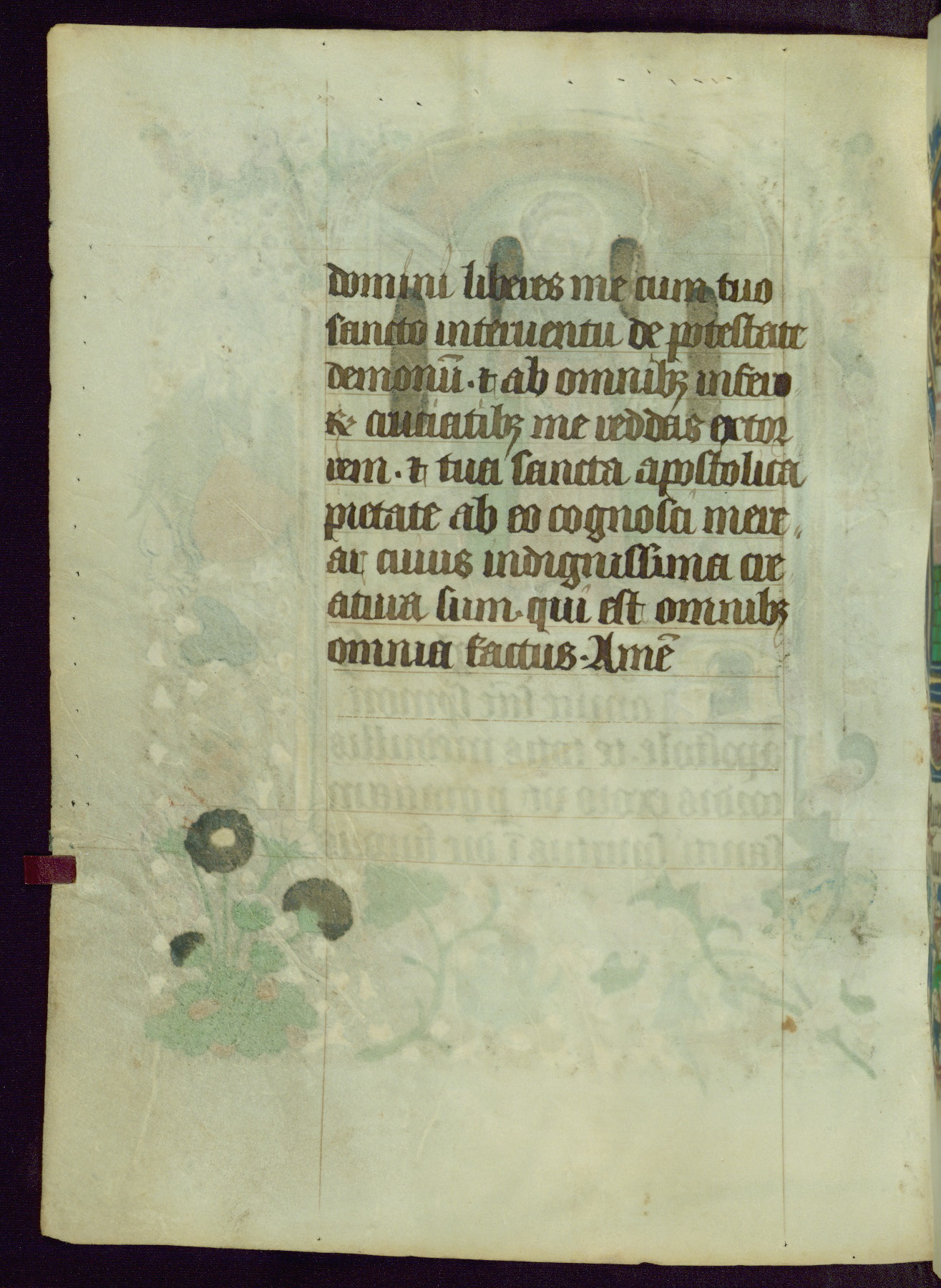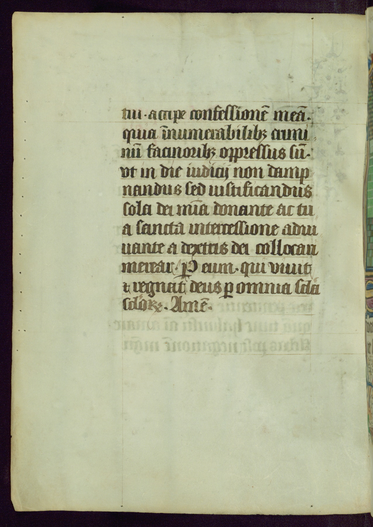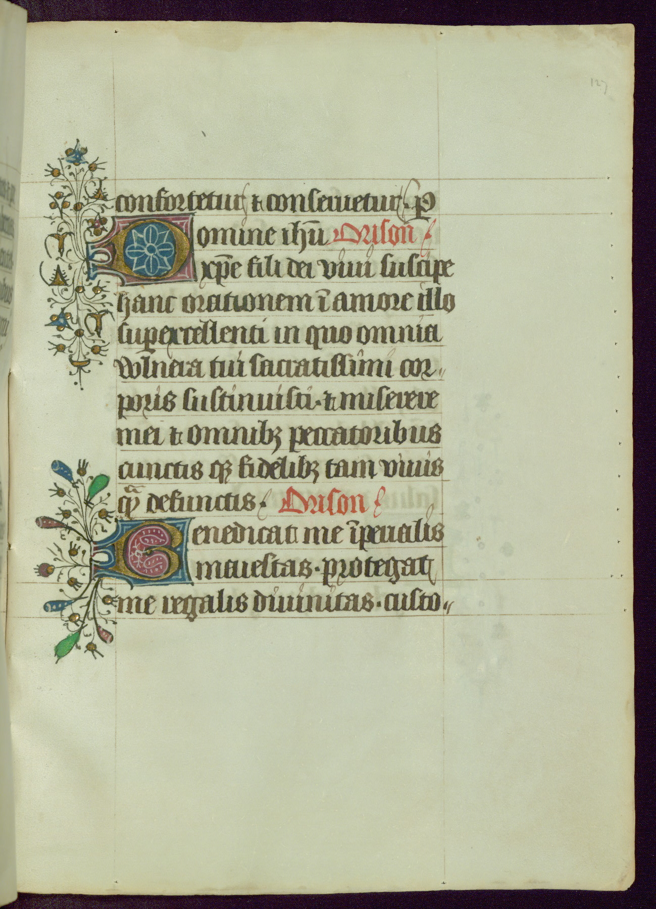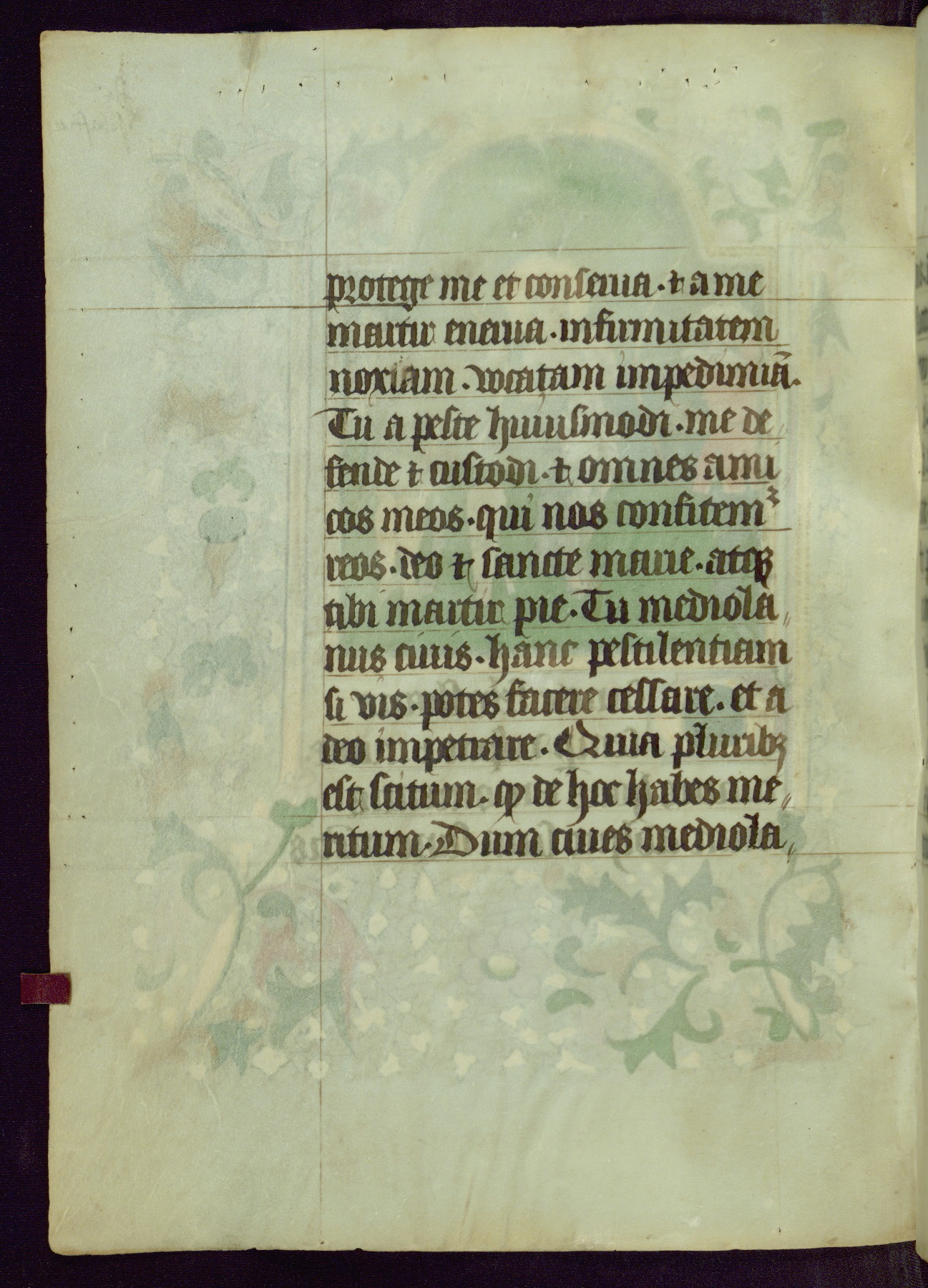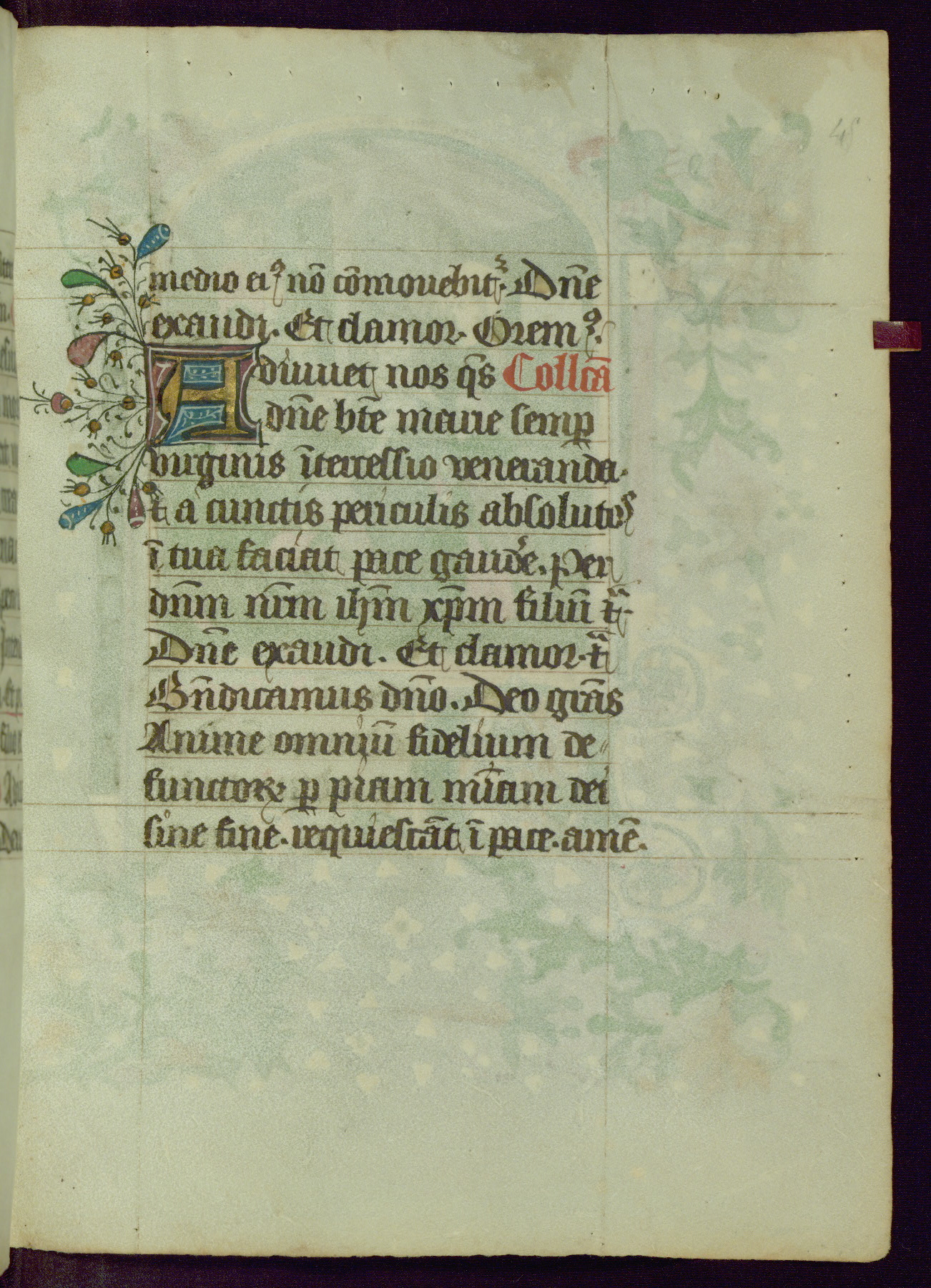 This Book of Hours was completed ca. 1450, illuminated by the Master of Ghent Privileges and associates. The first owner is depicted in the border of fol. 13v as well as arms of the Egmont family of Guelders, found in the margins nearby. On front flyleaf iir, a note indicates that the manuscript was given by Francois de Bonge to an unidentified recipient in memory of a close friend. While many prayers are in Latin, there is a strong presence of French found in rubrics, headings, and several narratives (tales of a canon's dream sequence, the salvation of a nun, and directives for prayers that would result in a vision of the Virgin three days before the supplicant's death) paired with prayers and devotions in Latin.