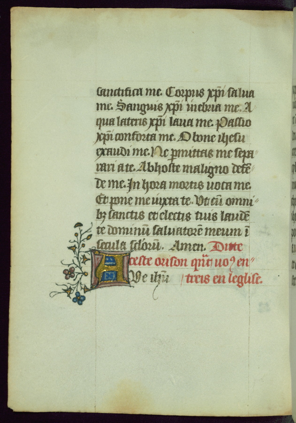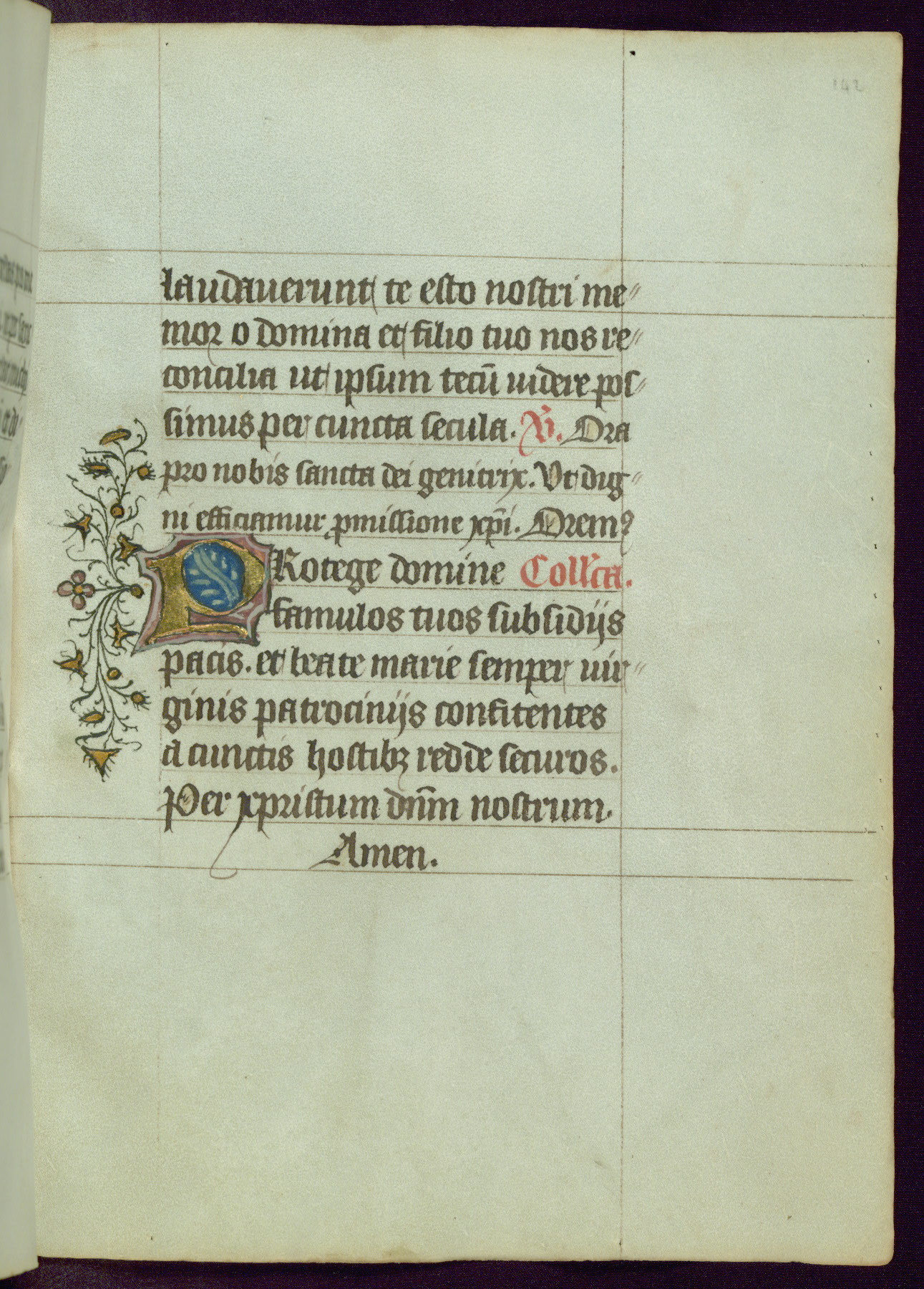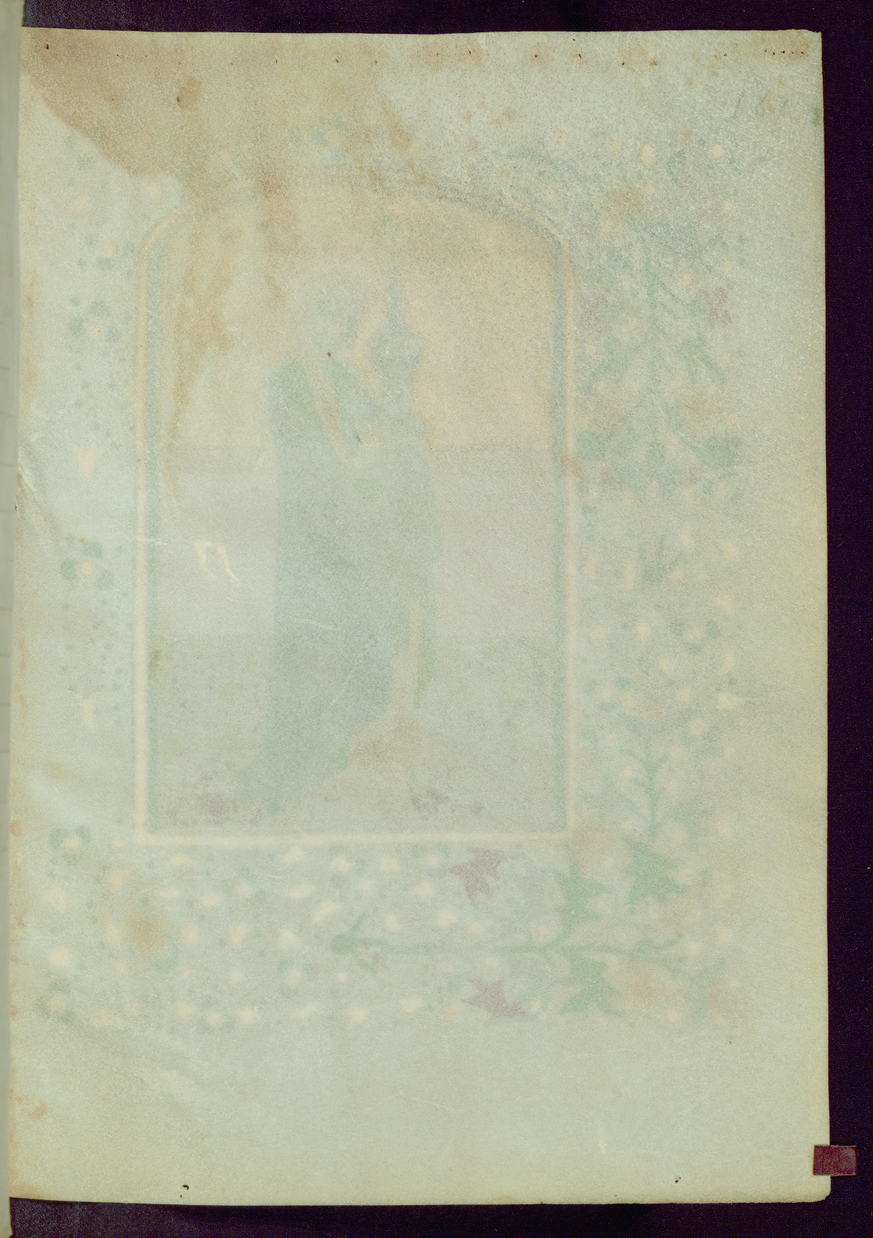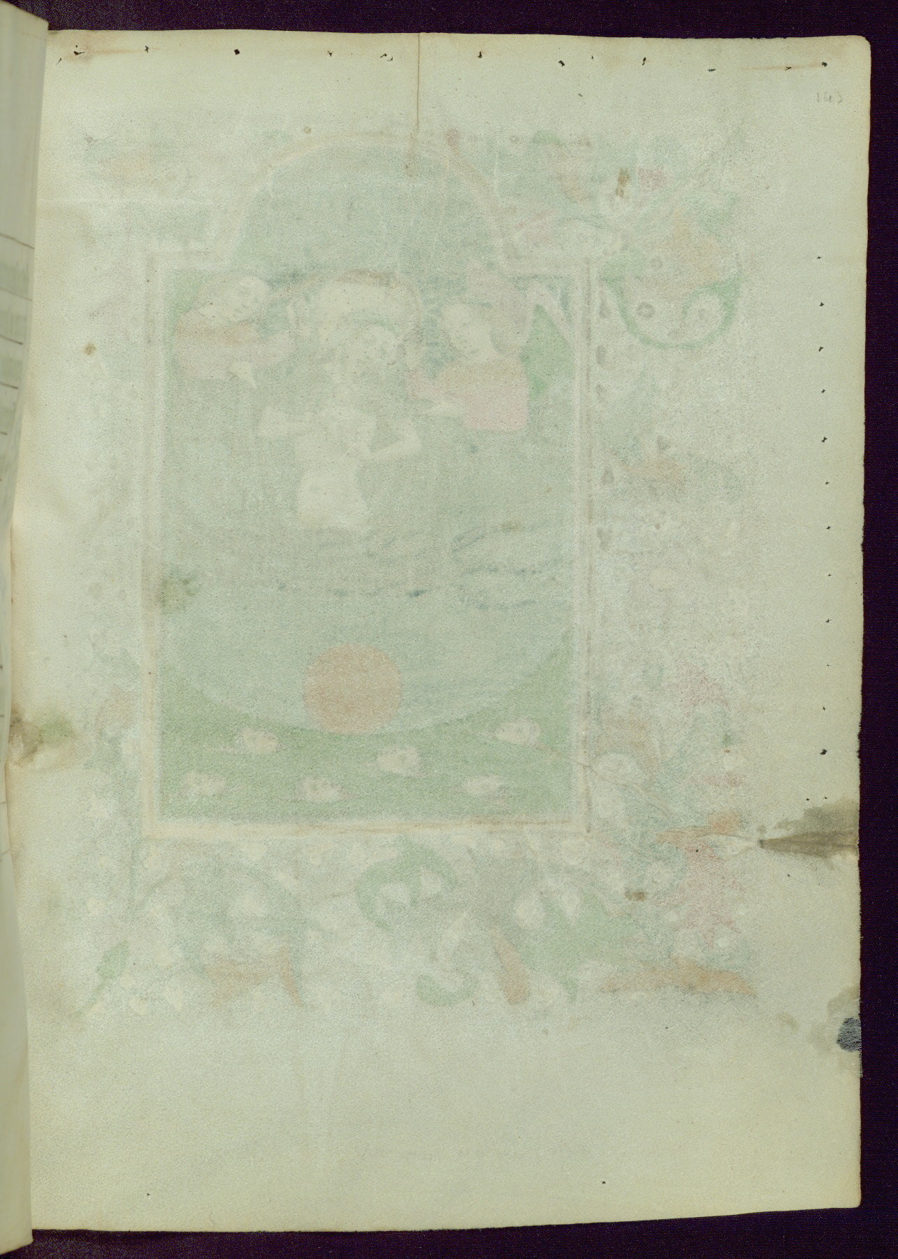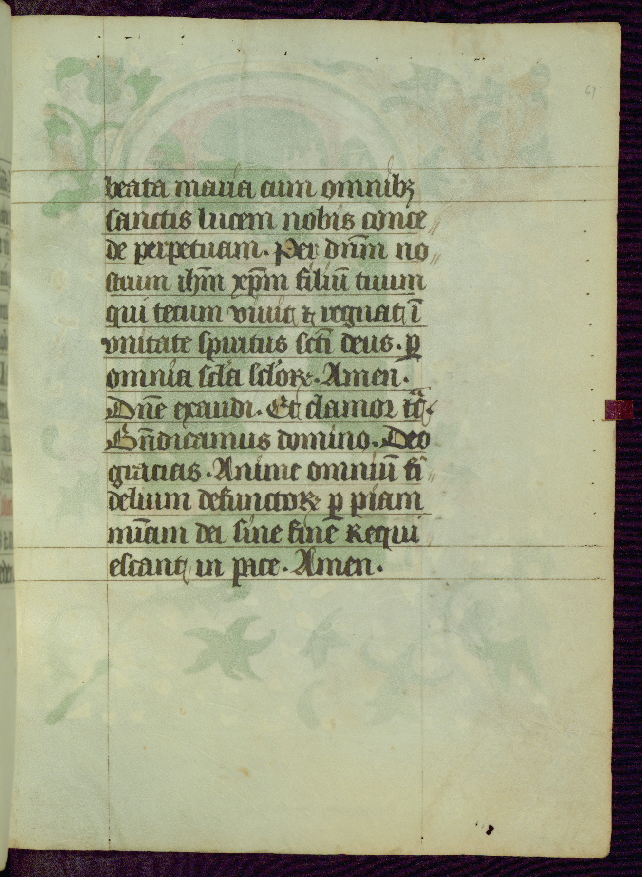 This Book of Hours was completed ca. 1450, illuminated by the Master of Ghent Privileges and associates. The first owner is depicted in the border of fol. 13v as well as arms of the Egmont family of Guelders, found in the margins nearby. On front flyleaf iir, a note indicates that the manuscript was given by Francois de Bonge to an unidentified recipient in memory of a close friend. While many prayers are in Latin, there is a strong presence of French found in rubrics, headings, and several narratives (tales of a canon's dream sequence, the salvation of a nun, and directives for prayers that would result in a vision of the Virgin three days before the supplicant's death) paired with prayers and devotions in Latin.