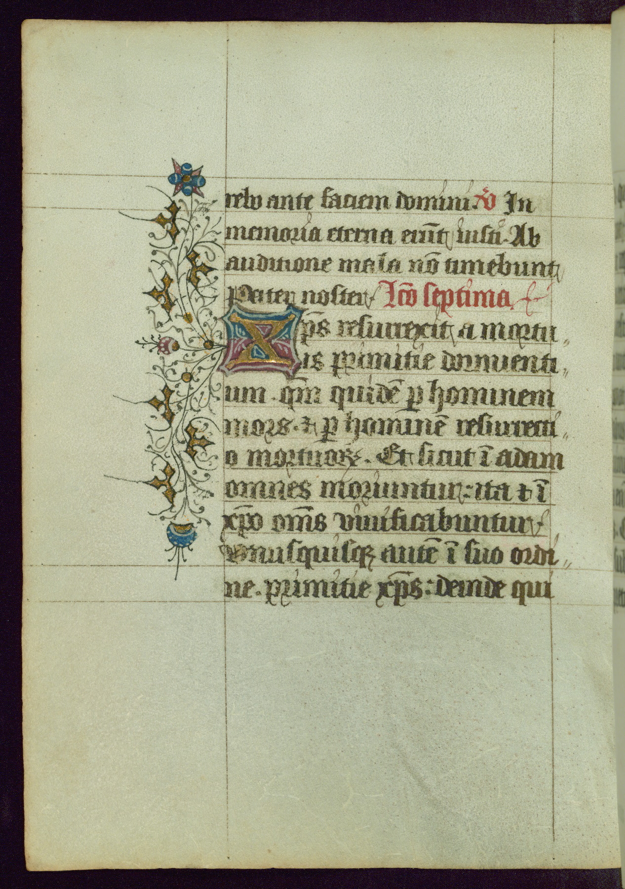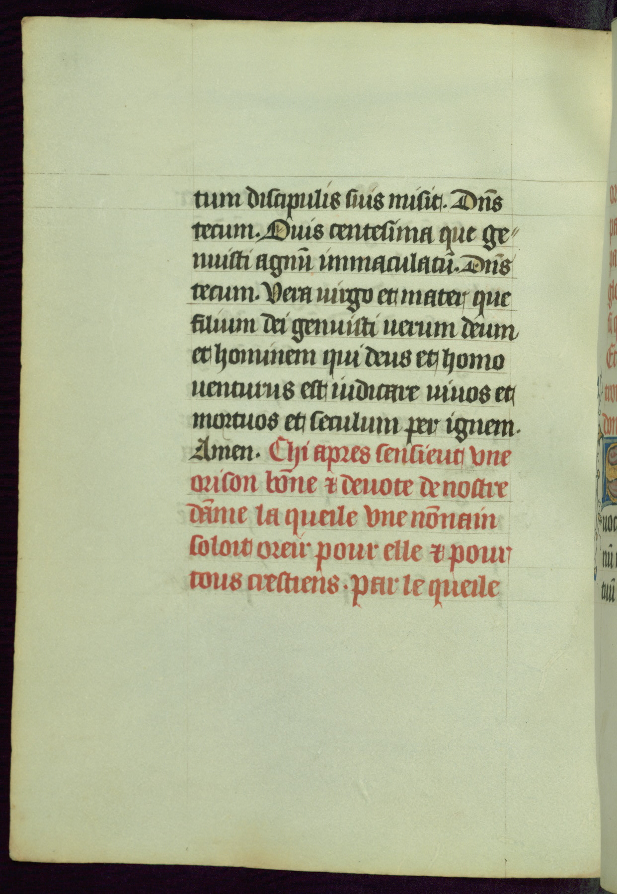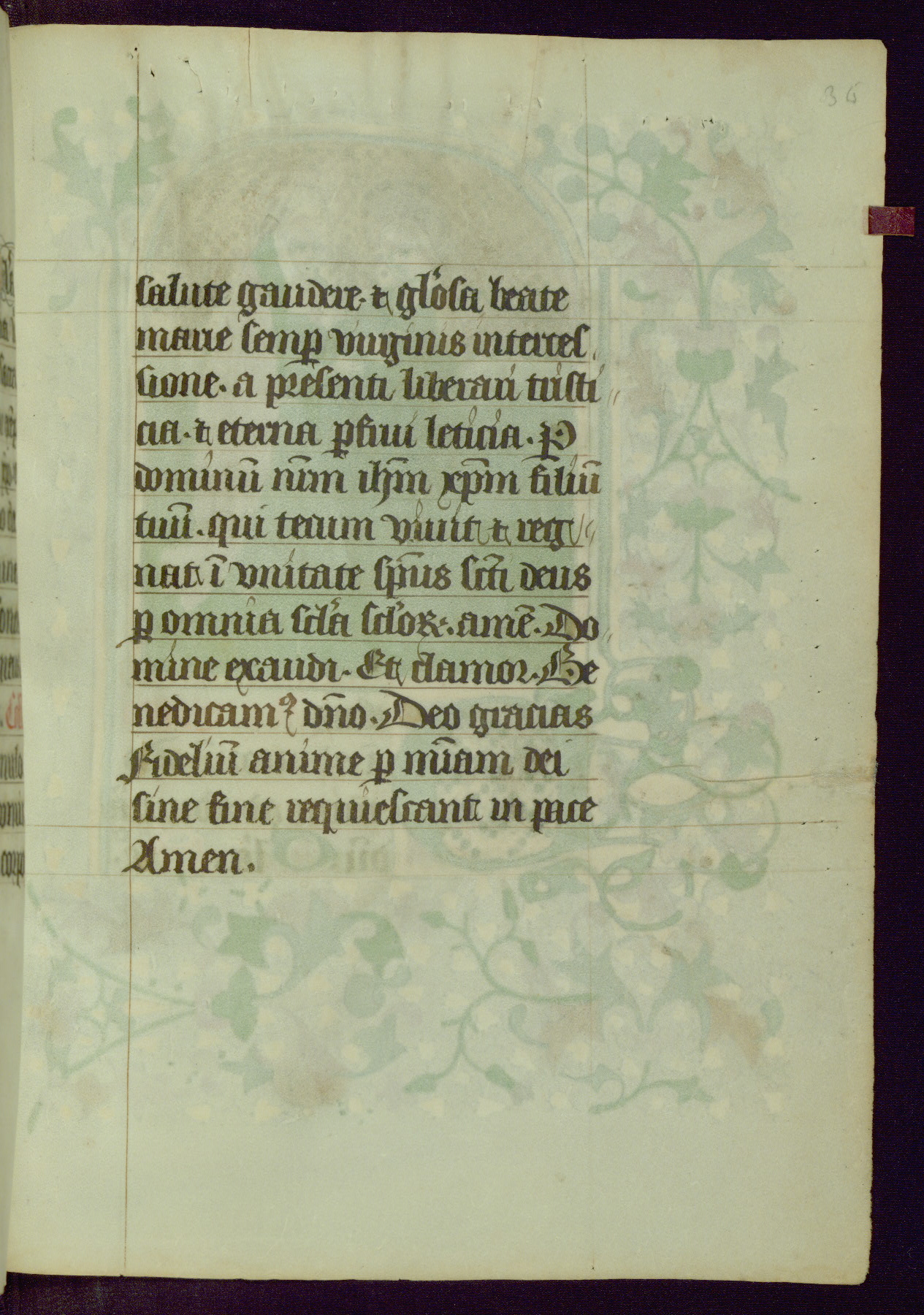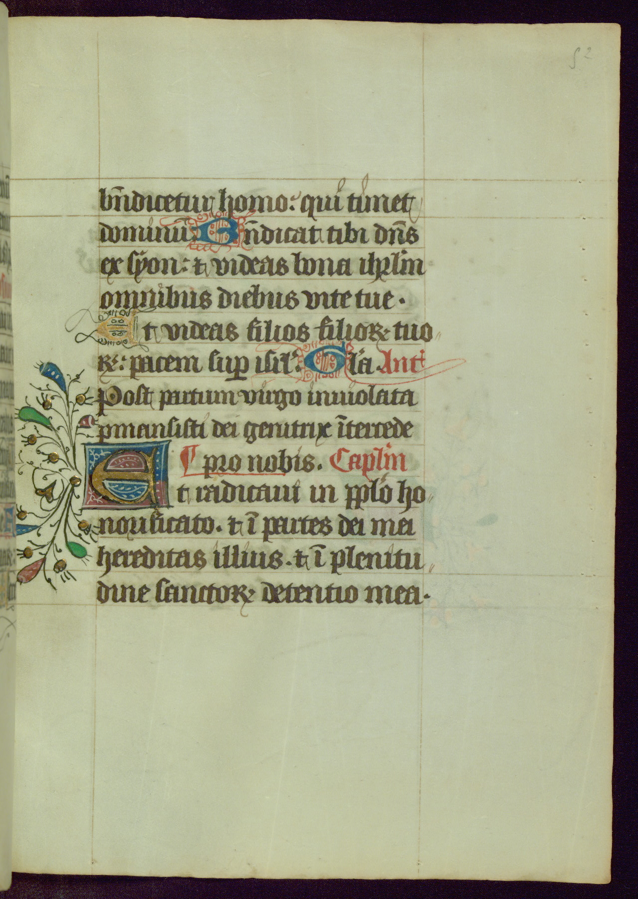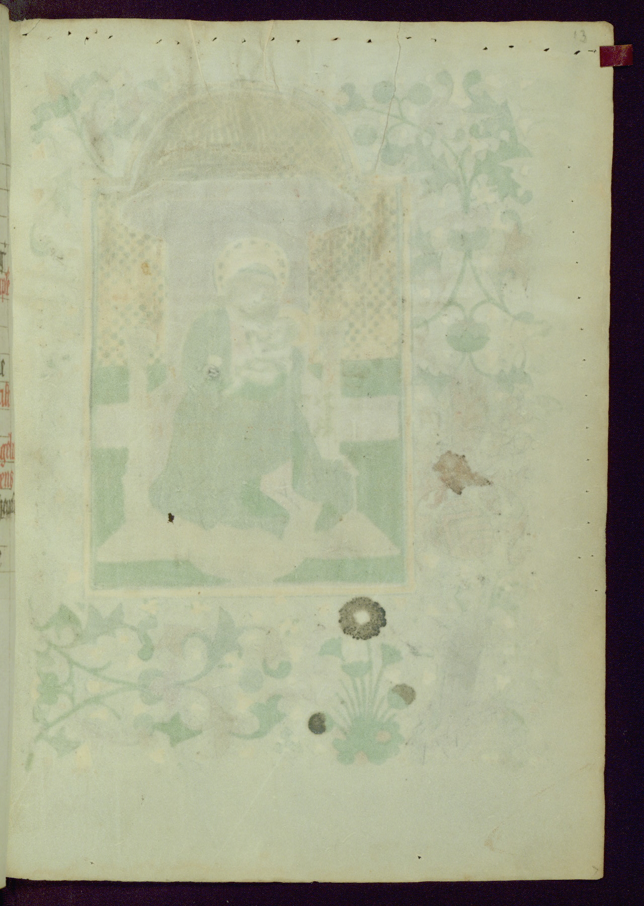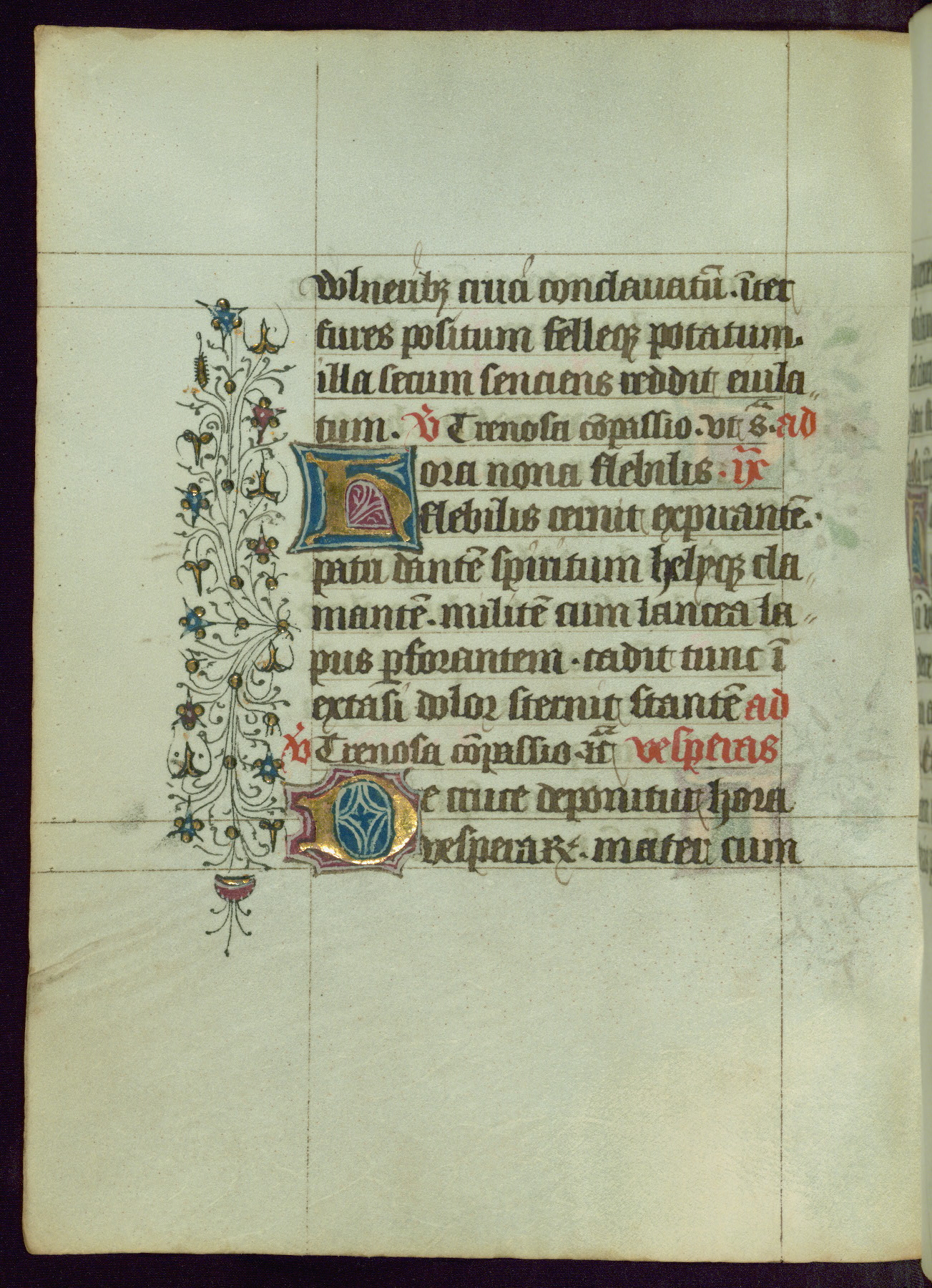 This Book of Hours was completed ca. 1450, illuminated by the Master of Ghent Privileges and associates. The first owner is depicted in the border of fol. 13v as well as arms of the Egmont family of Guelders, found in the margins nearby. On front flyleaf iir, a note indicates that the manuscript was given by Francois de Bonge to an unidentified recipient in memory of a close friend. While many prayers are in Latin, there is a strong presence of French found in rubrics, headings, and several narratives (tales of a canon's dream sequence, the salvation of a nun, and directives for prayers that would result in a vision of the Virgin three days before the supplicant's death) paired with prayers and devotions in Latin.