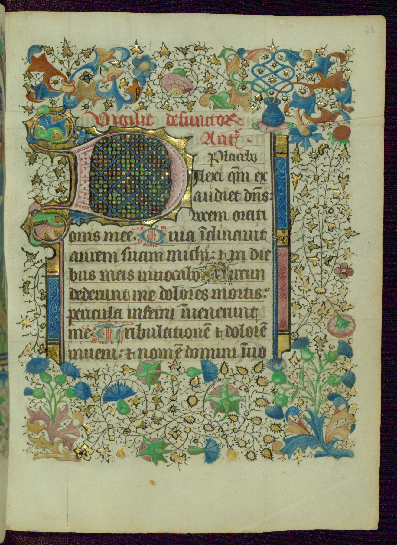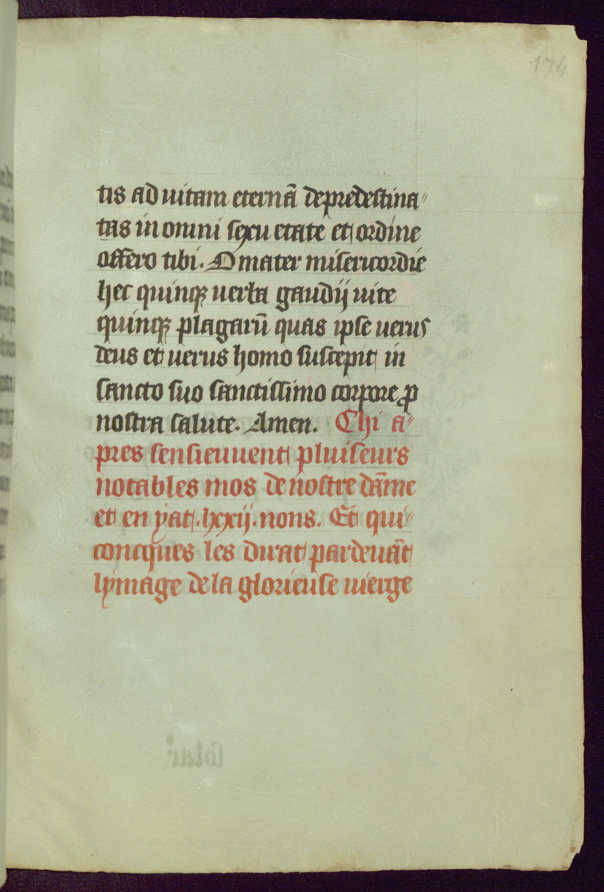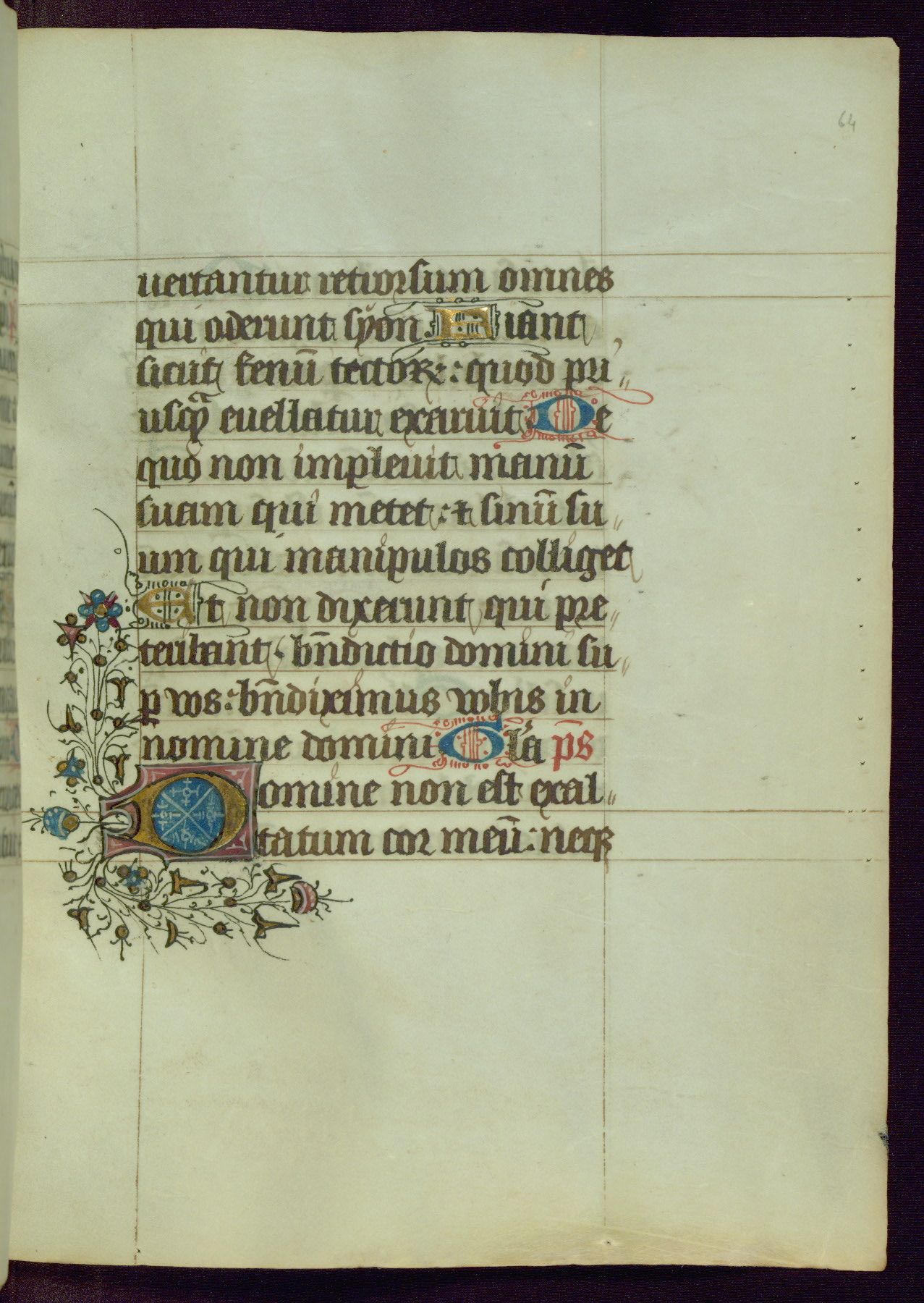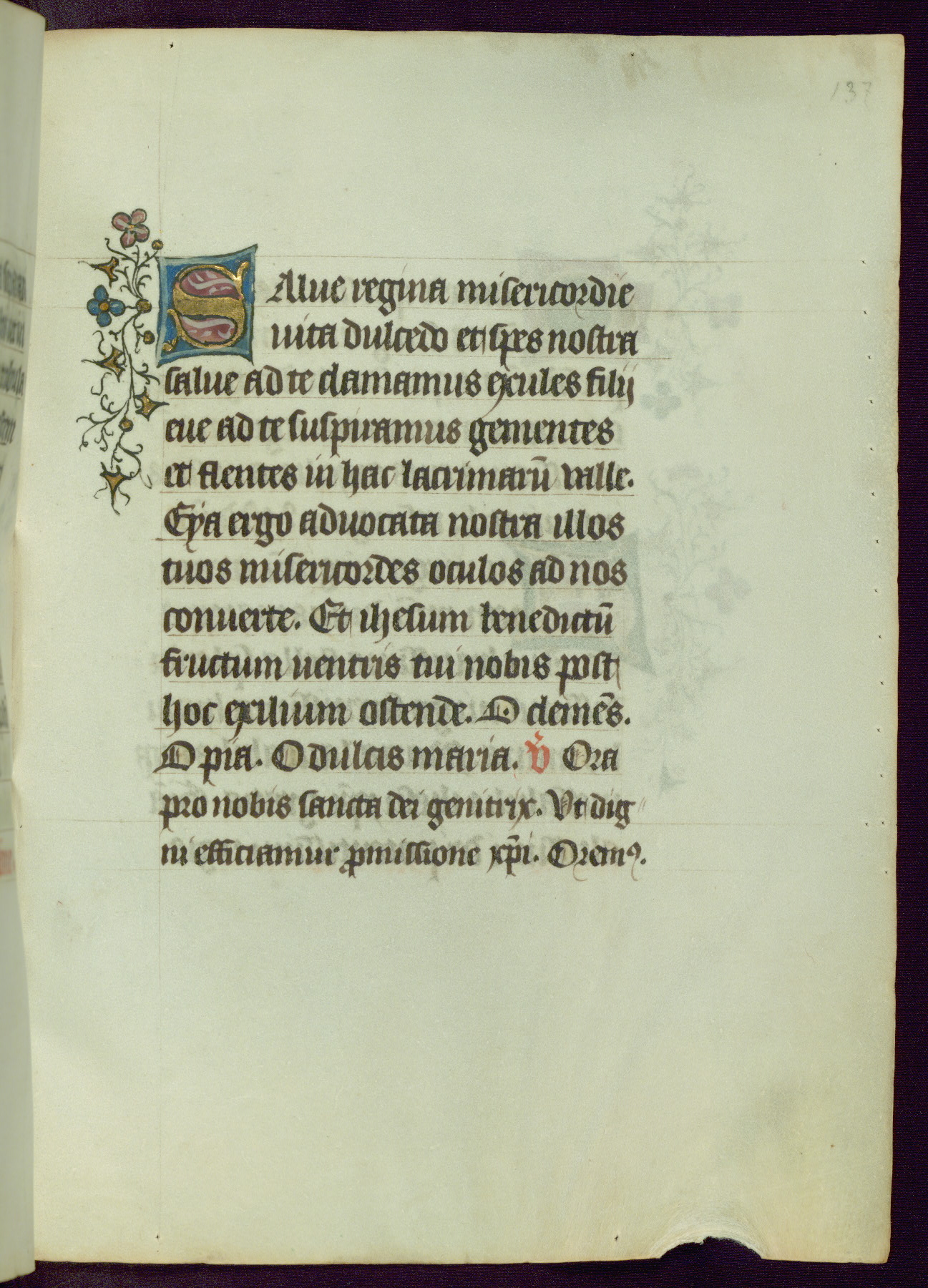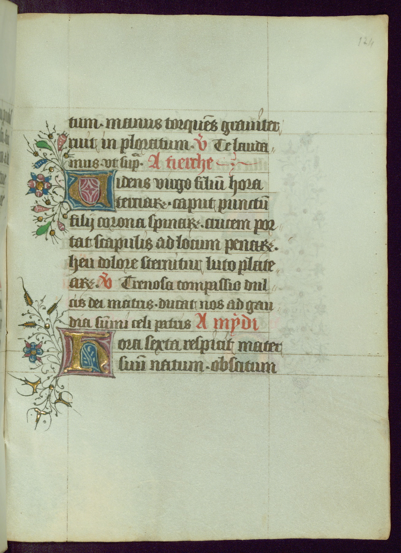 This Book of Hours was completed ca. 1450, illuminated by the Master of Ghent Privileges and associates. The first owner is depicted in the border of fol. 13v as well as arms of the Egmont family of Guelders, found in the margins nearby. On front flyleaf iir, a note indicates that the manuscript was given by Francois de Bonge to an unidentified recipient in memory of a close friend. While many prayers are in Latin, there is a strong presence of French found in rubrics, headings, and several narratives (tales of a canon's dream sequence, the salvation of a nun, and directives for prayers that would result in a vision of the Virgin three days before the supplicant's death) paired with prayers and devotions in Latin.