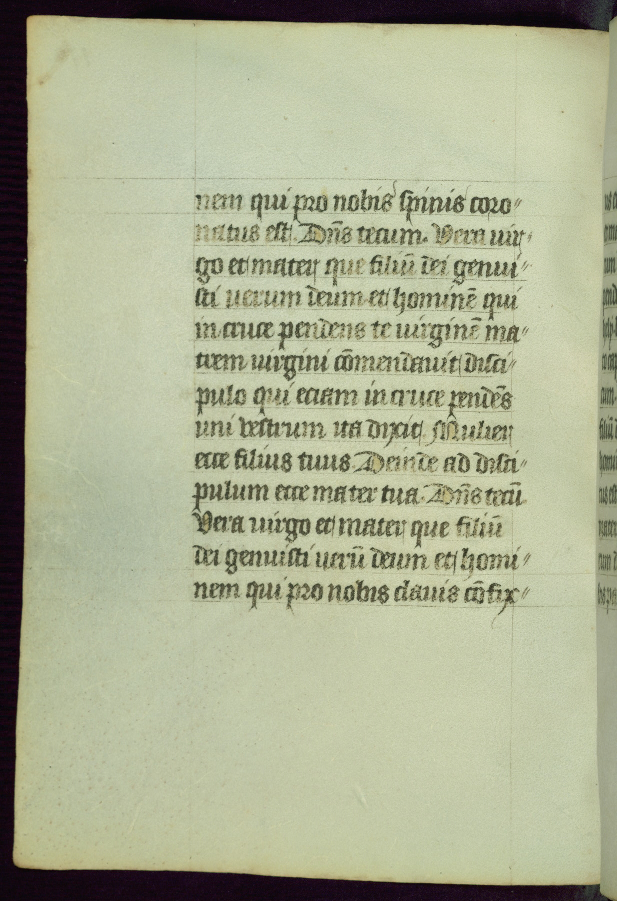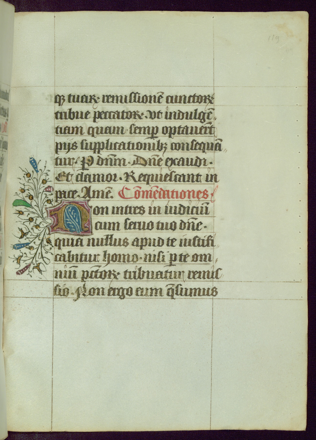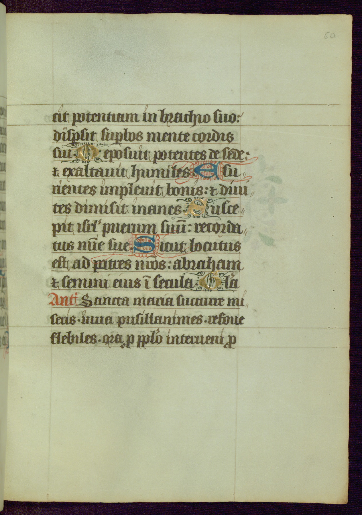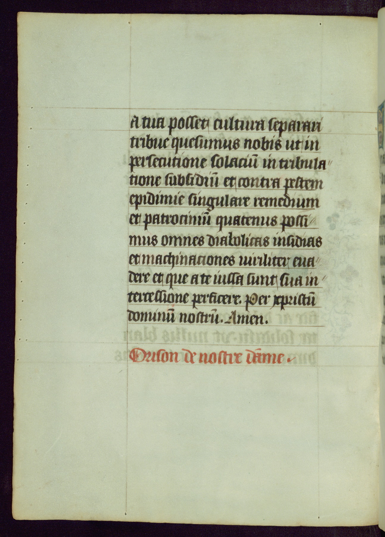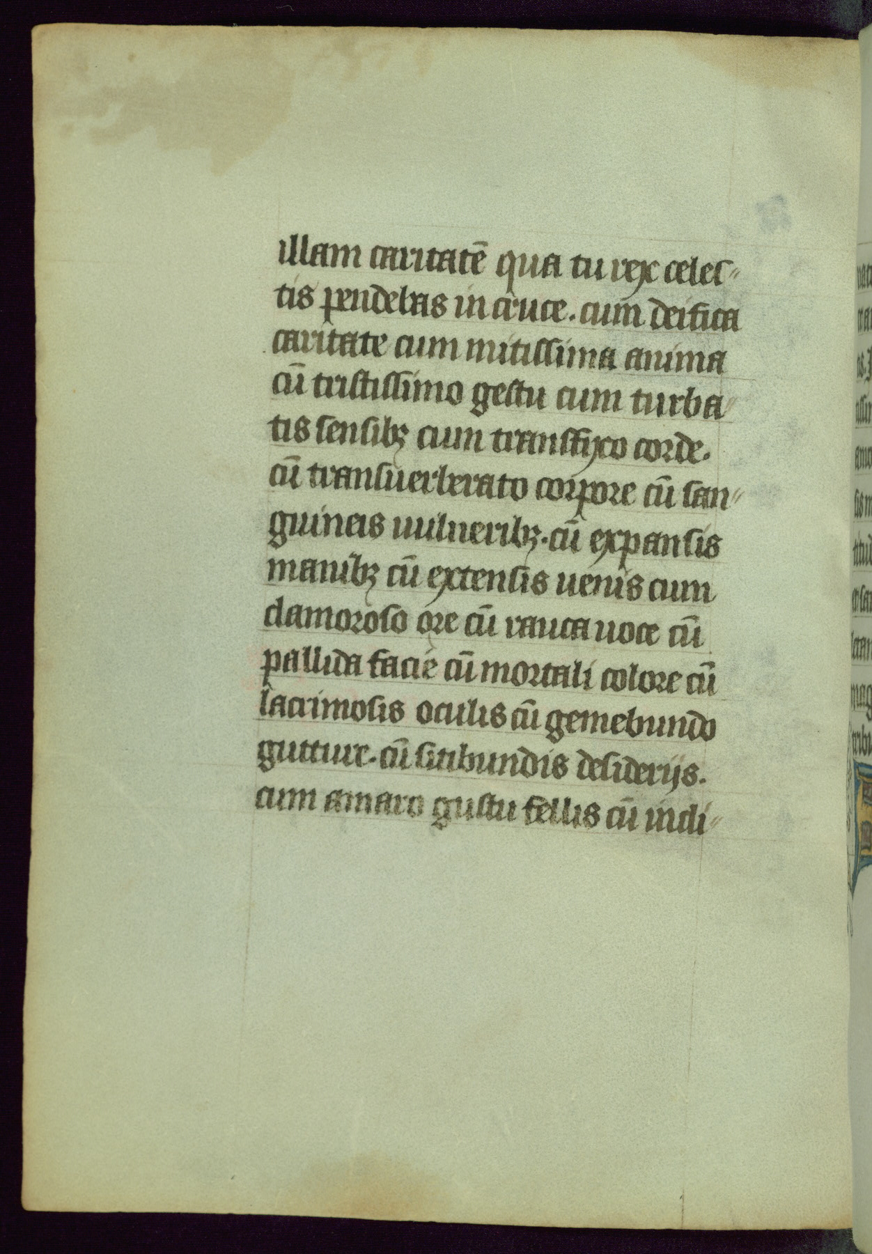 This Book of Hours was completed ca. 1450, illuminated by the Master of Ghent Privileges and associates. The first owner is depicted in the border of fol. 13v as well as arms of the Egmont family of Guelders, found in the margins nearby. On front flyleaf iir, a note indicates that the manuscript was given by Francois de Bonge to an unidentified recipient in memory of a close friend. While many prayers are in Latin, there is a strong presence of French found in rubrics, headings, and several narratives (tales of a canon's dream sequence, the salvation of a nun, and directives for prayers that would result in a vision of the Virgin three days before the supplicant's death) paired with prayers and devotions in Latin.
