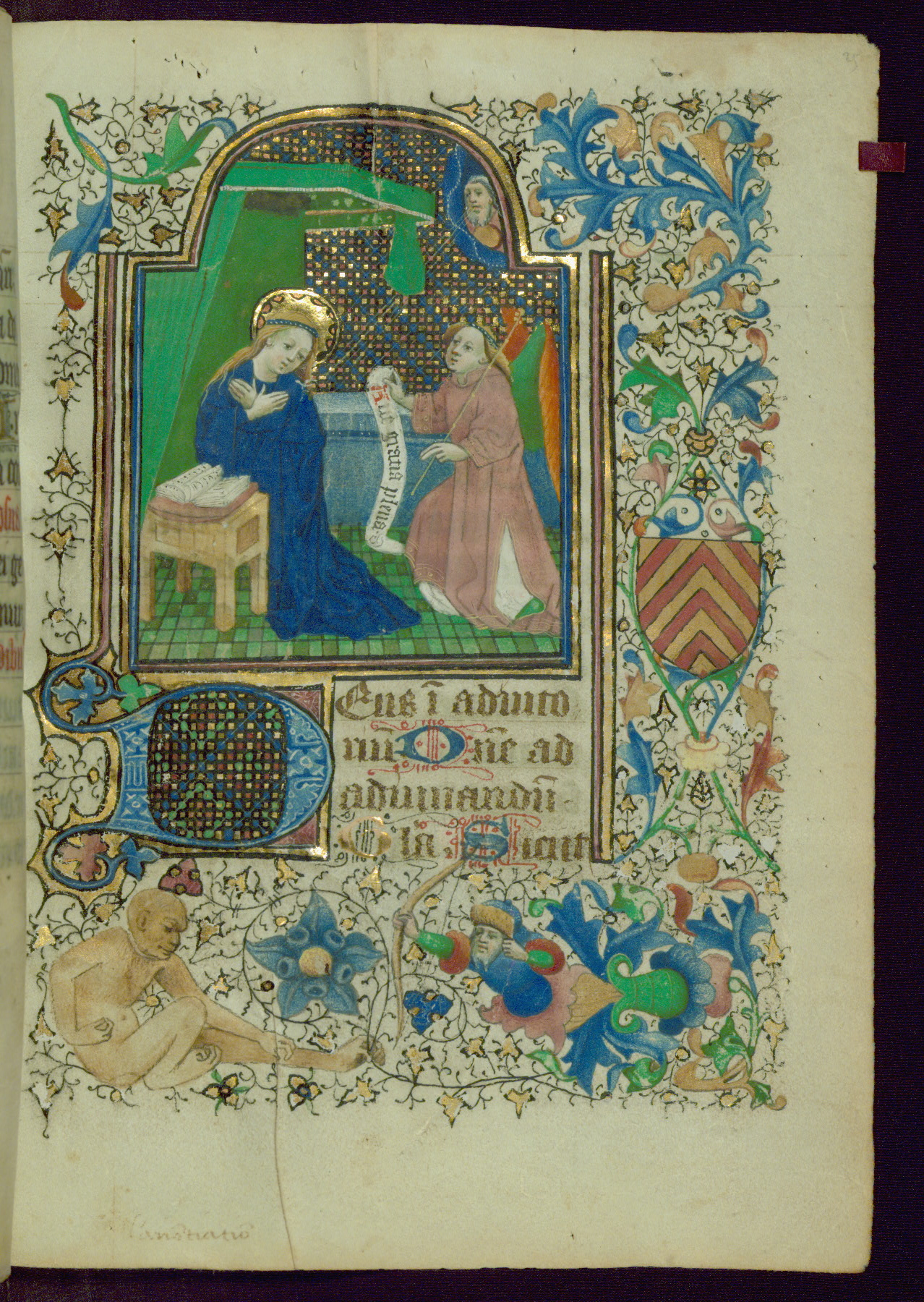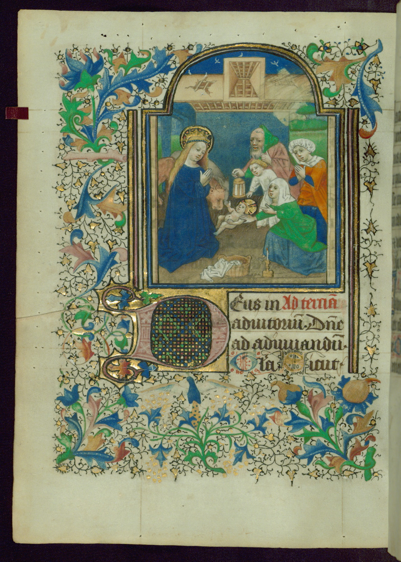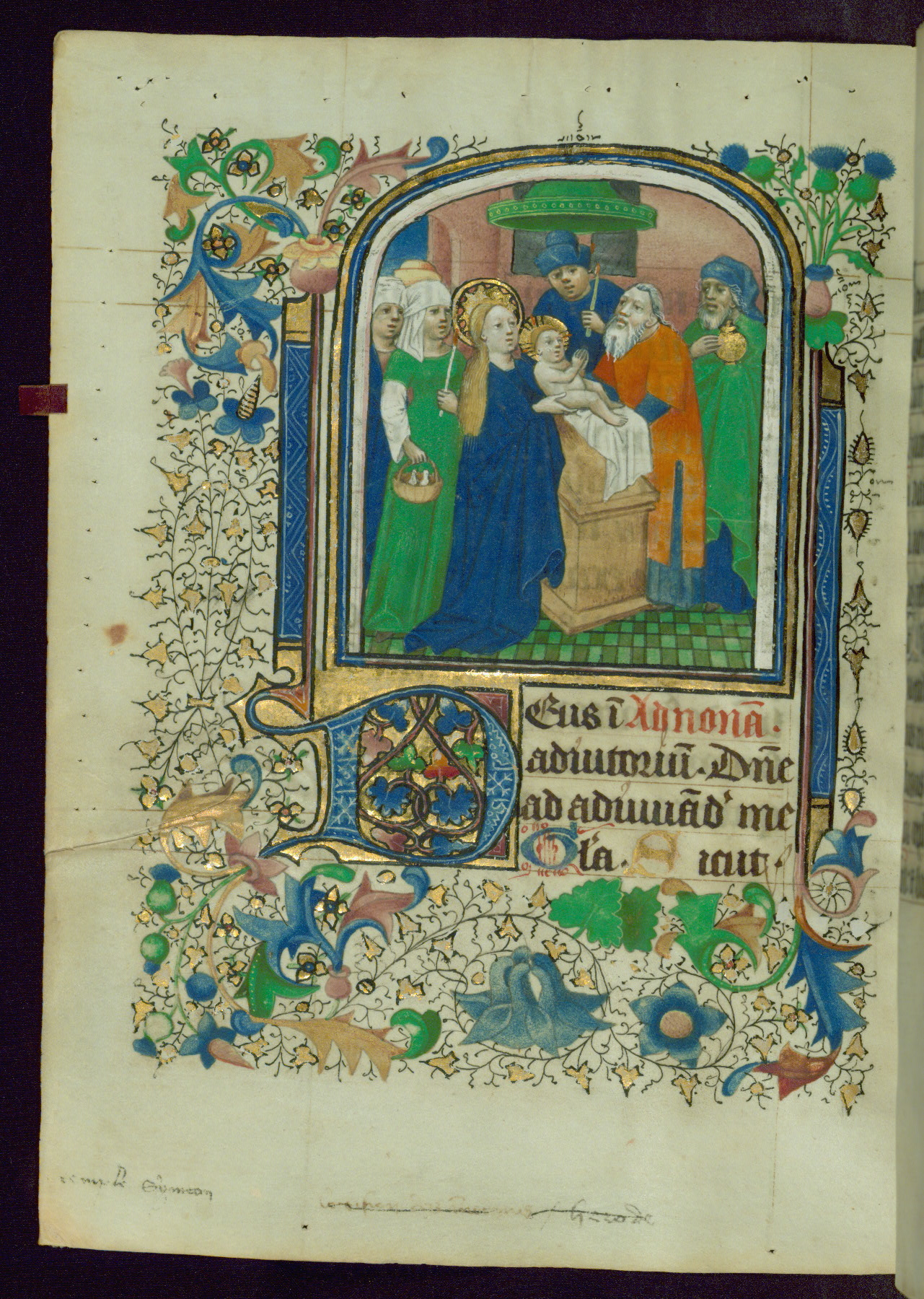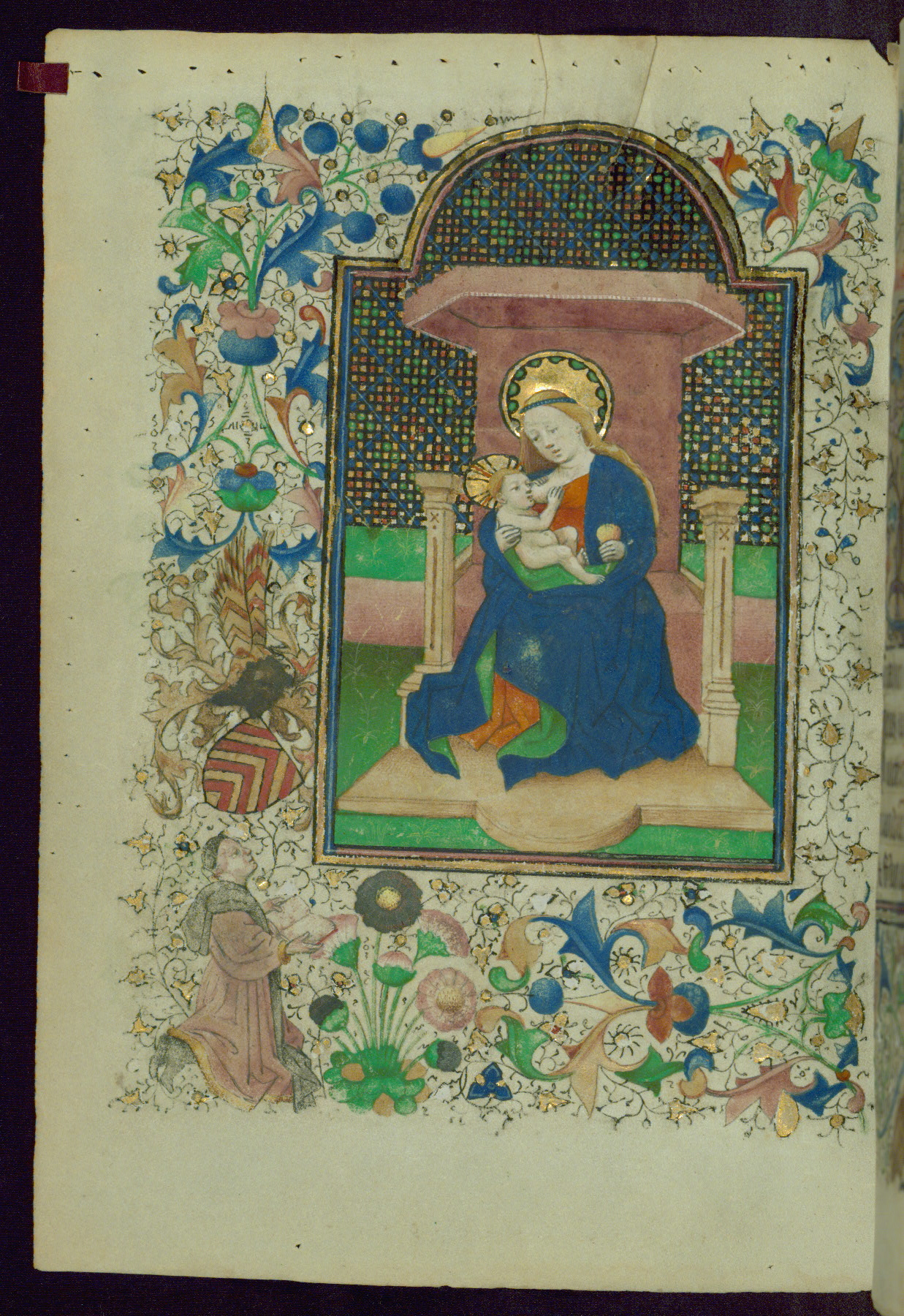 This Book of Hours was completed ca. 1450, illuminated by the Master of Ghent Privileges and associates. The first owner is depicted in the border of fol. 13v as well as arms of the Egmont family of Guelders, found in the margins nearby. On front flyleaf iir, a note indicates that the manuscript was given by Francois de Bonge to an unidentified recipient in memory of a close friend. While many prayers are in Latin, there is a strong presence of French found in rubrics, headings, and several narratives (tales of a canon's dream sequence, the salvation of a nun, and directives for prayers that would result in a vision of the Virgin three days before the supplicant's death) paired with prayers and devotions in Latin.