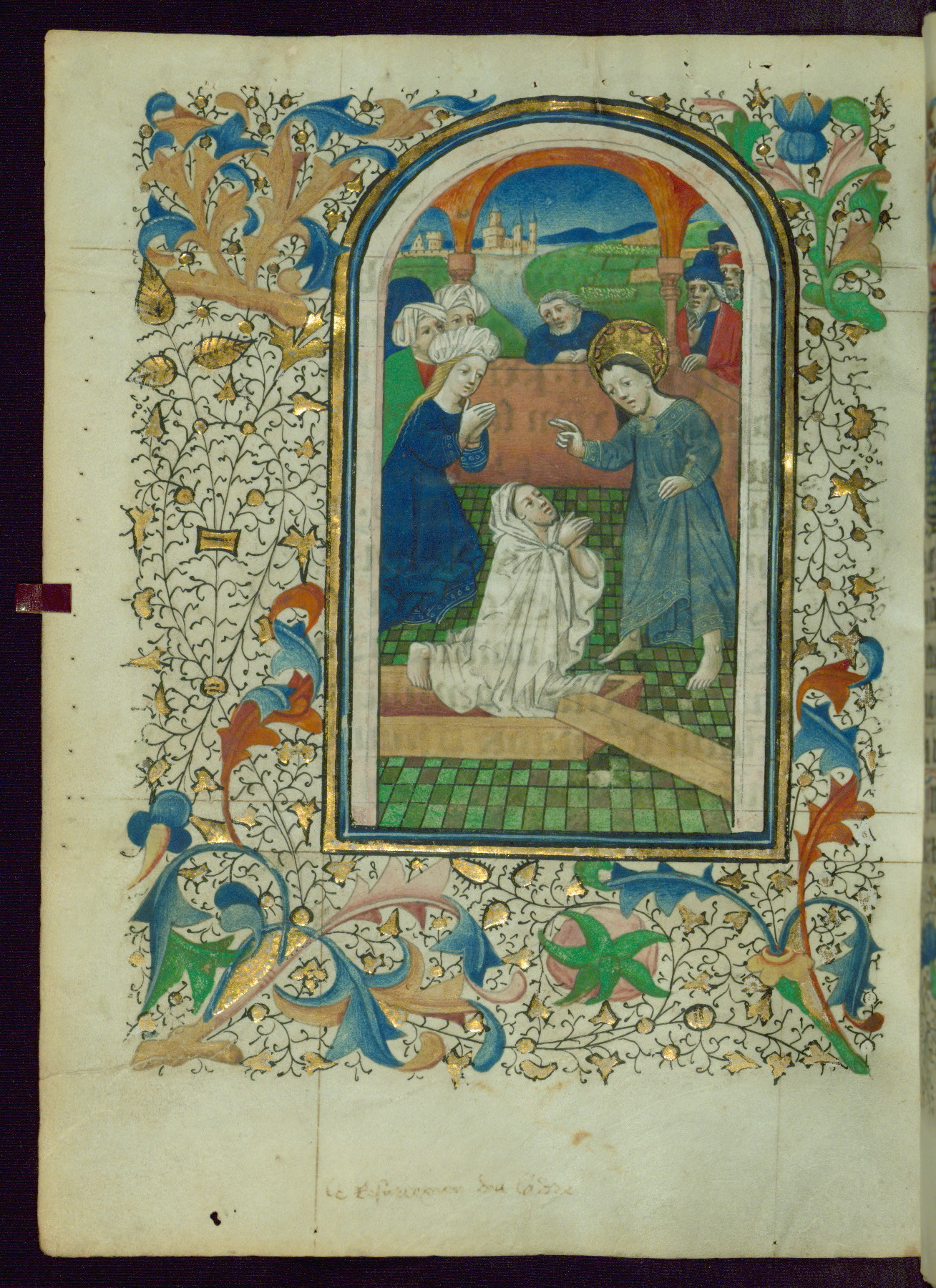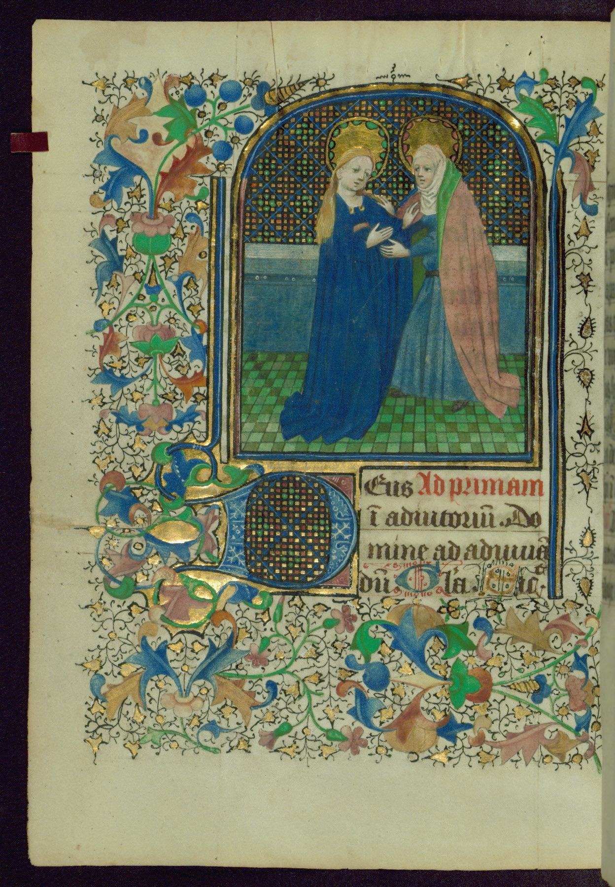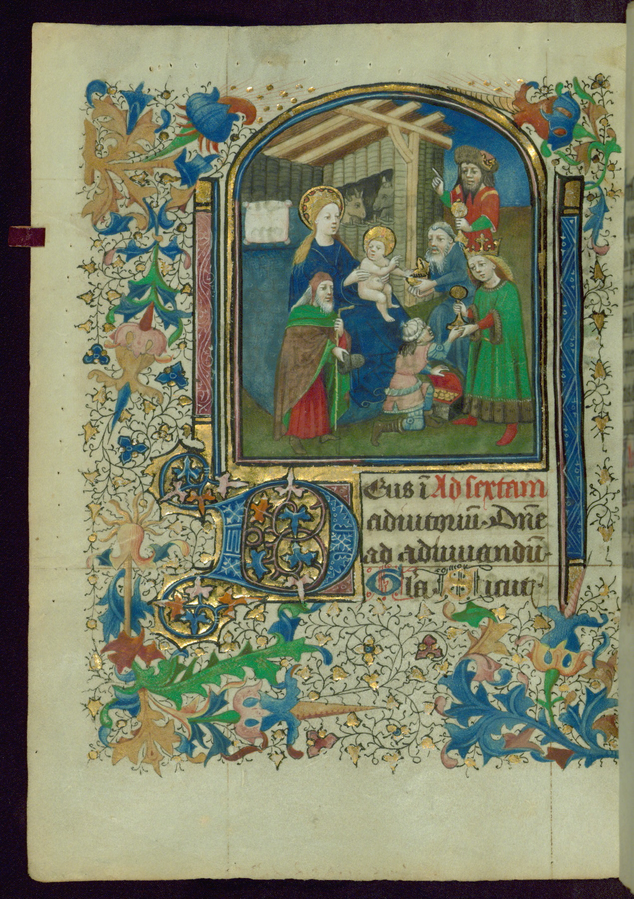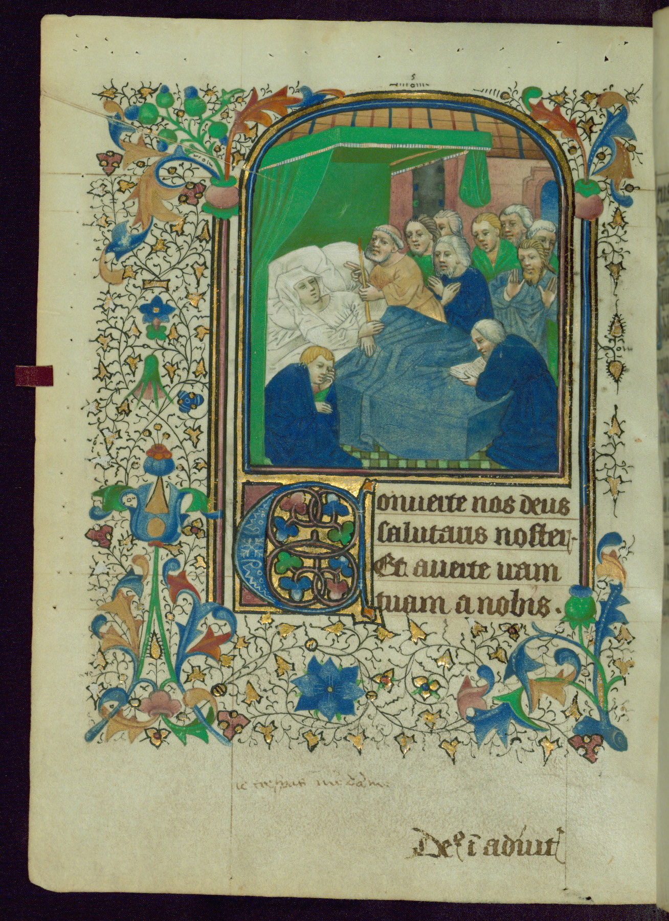 This Book of Hours was completed ca. 1450, illuminated by the Master of Ghent Privileges and associates. The first owner is depicted in the border of fol. 13v as well as arms of the Egmont family of Guelders, found in the margins nearby. On front flyleaf iir, a note indicates that the manuscript was given by Francois de Bonge to an unidentified recipient in memory of a close friend. While many prayers are in Latin, there is a strong presence of French found in rubrics, headings, and several narratives (tales of a canon's dream sequence, the salvation of a nun, and directives for prayers that would result in a vision of the Virgin three days before the supplicant's death) paired with prayers and devotions in Latin.