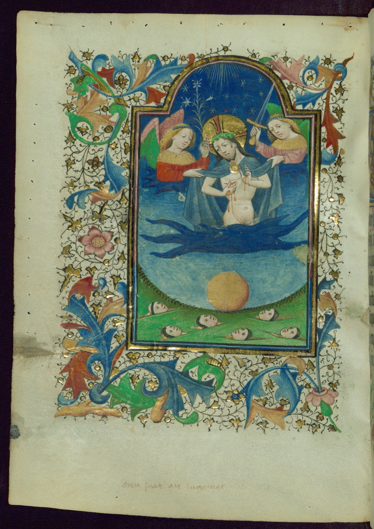 Man of Sorrows is between two demi-angels drawing aside his mantle, and their collars are inscribed in pale ocher "Misericordia" and "Iusticia."