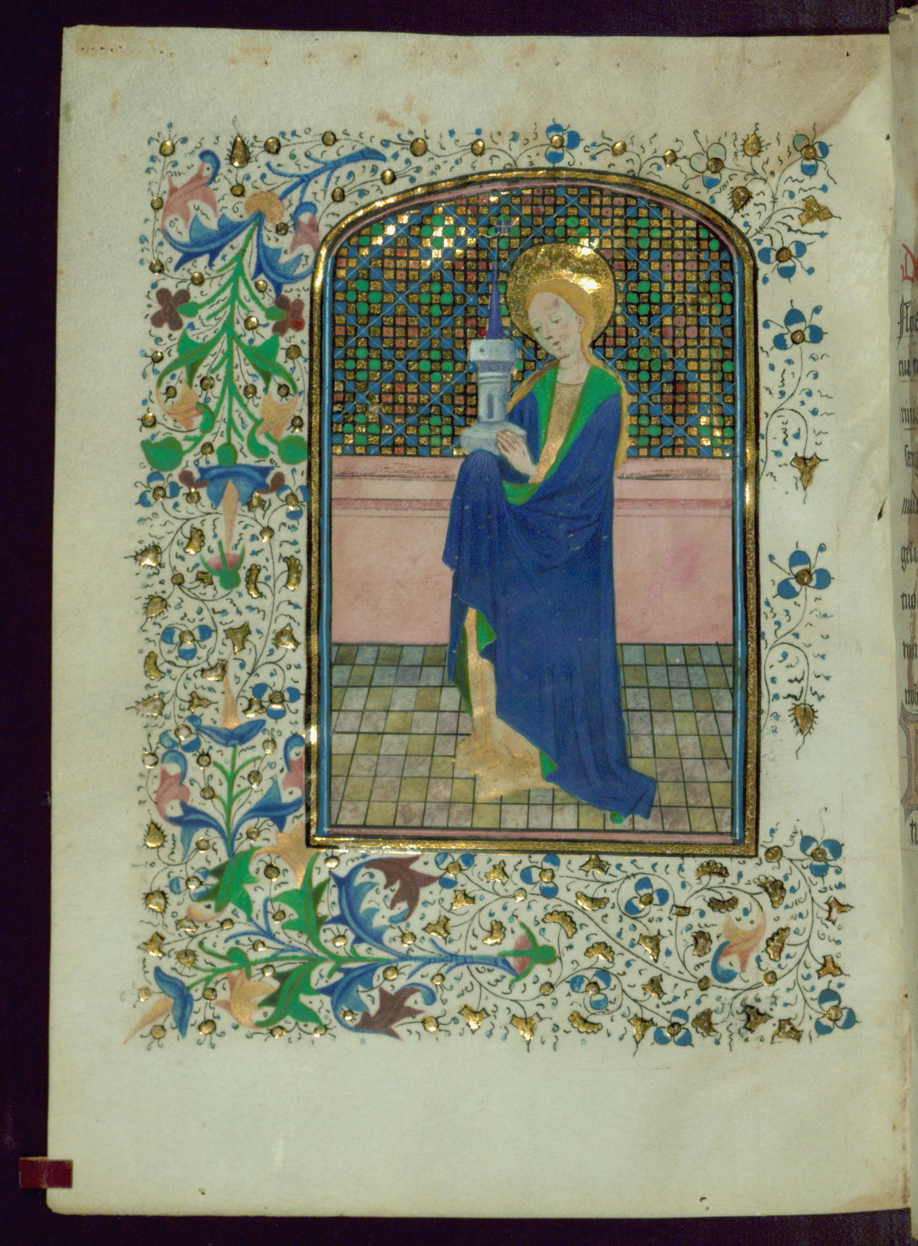 - Contents: Litany composed of Netherlandish and Northern French saints; twelve apostles/"ewangeliste", John Baptist to Luke; nine martyrs, some of which are Vincent, George, Lambert, Fabian, Sebastian, and Dionysius; fifteen confessors, including nine popes, followed by Servatius, Remacle, Hubert, Severinus, Aegydius, Remigius; thirteen virgins/widows/"continentes", of note: Felicitas, Perpetua, Agatha, Lucy, Agnes, Cecilia, Gertrude, Juliana, Margaret, Barbara, Mary Magdalene, Mary Egyptian, Catherine; petitions and invocations on fols 158v-160v; prayer on fols. 160v-161v; three collects, the second of which was associated with Liège by John Plummer, citing relics of saints in suppliant's church: "Concede quesumus omnipotens deus ut sancta dei genitrix virgo maria . . . atque omnes sancti quorum reliquie in ista continetur ecclesia . . . . Exaudi quesumus domine supplicum . . . . O. s. d. qui vivorum dominaris simul et mortuorum. . . ."
