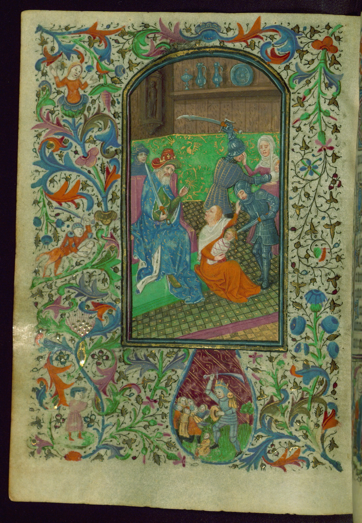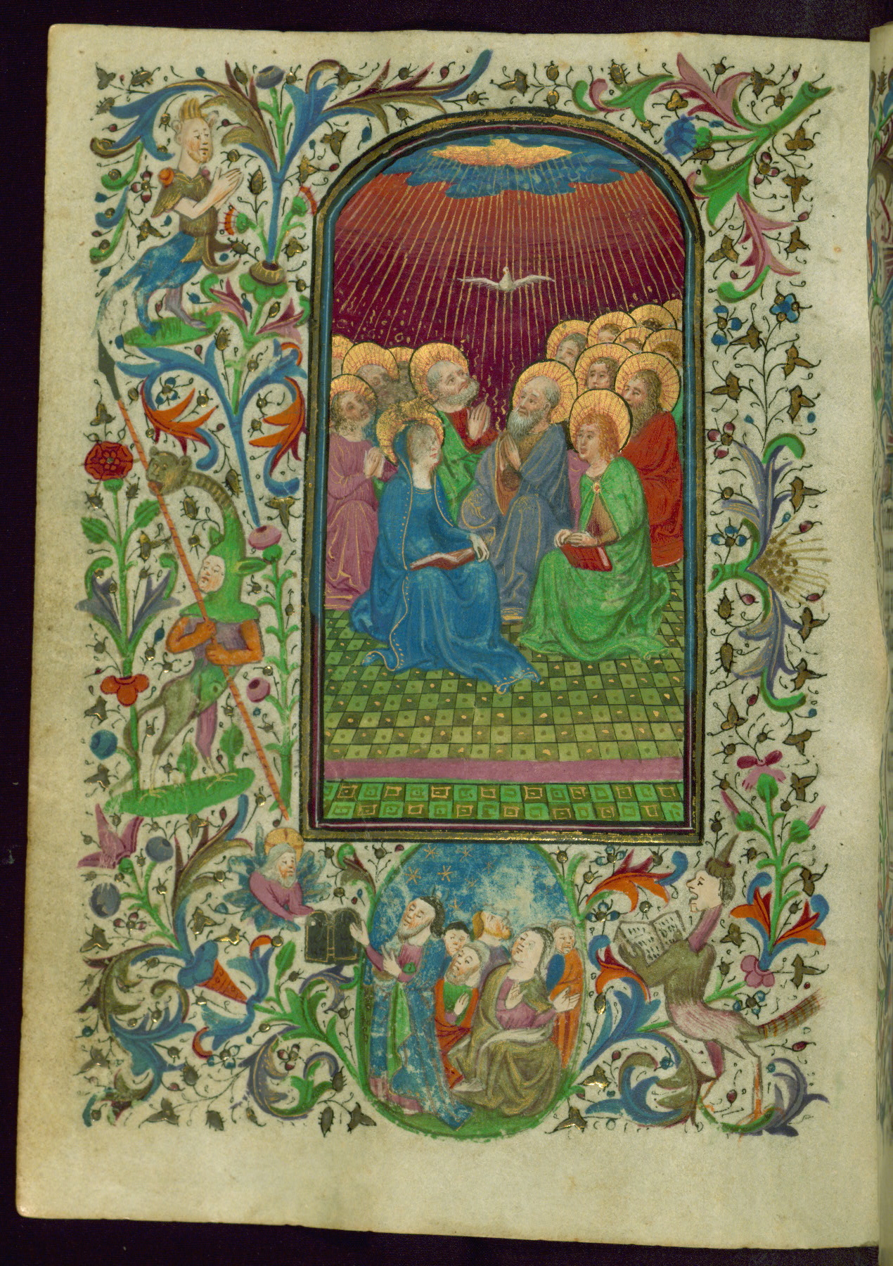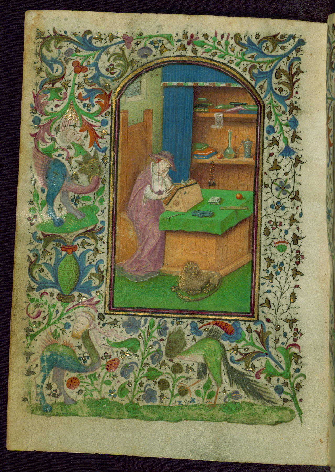 - Decoration note: Thirteen extant miniatures (of an original set of eighteen), inserted; decorated illuminated initials at text openings opposite full-page miniatures, letters in blue or mauve with white tracery (2-5 lines); at secondary text openings, gold on blue and/or mauve, white tracery similar to preceding decorated illuminated initials (2 lines); borders with figural themes at major text openings on versos facing rectos, on four sides; thirty-one narrative themes, thirteen at complete text openings, four at half-extant openings, figures mostly in medallions, one in panel, sometimes free-standing on green plots, infrequent secular motifs; drolleries found at illuminated text openings, motifs generally distributed along outer side margins, themes and gestures usually related to adjacent themes in miniature; secular repertory dominated by figures of men issuing from plants and varied grotesques; both active and impassive actions, music-making, combat, reading, looking on, praying; drolleries of note: a fool with spear (fol. 49v), a woman's horned hairdo (fol. 112r), nude men (fol. 86v-87r), winged hybrid man with conical cap urinating (?) into blossom (fol. 132v, possibly a proverb(?)); rubrics in red; text in black ink
