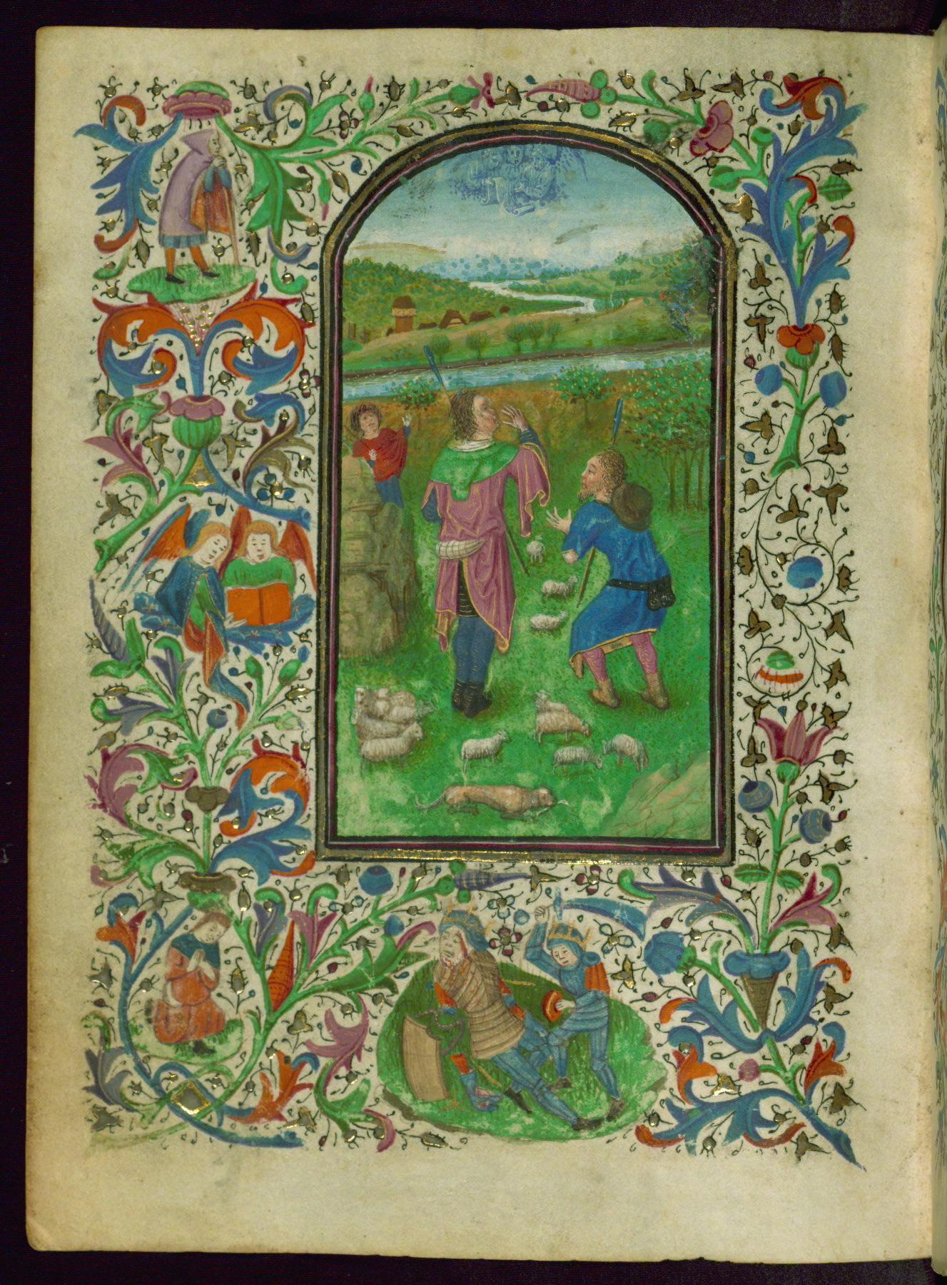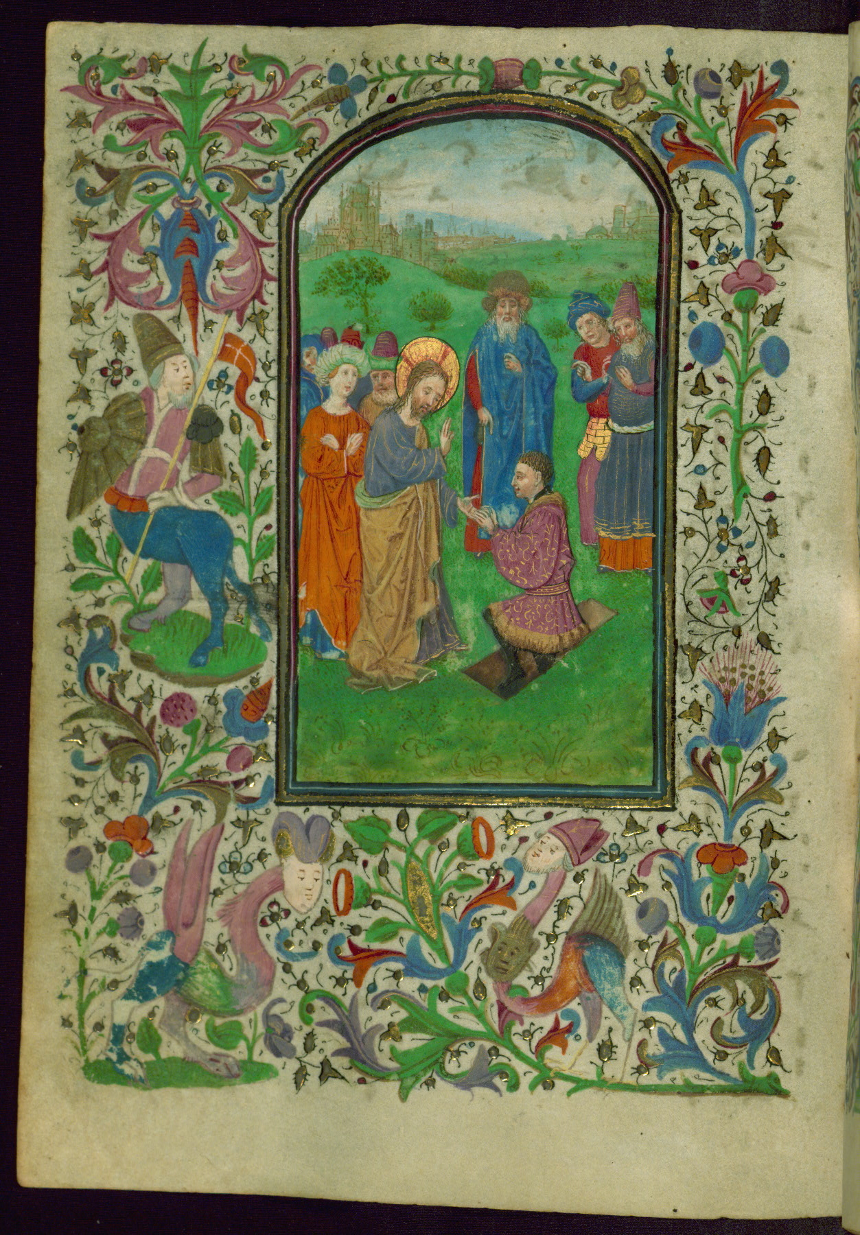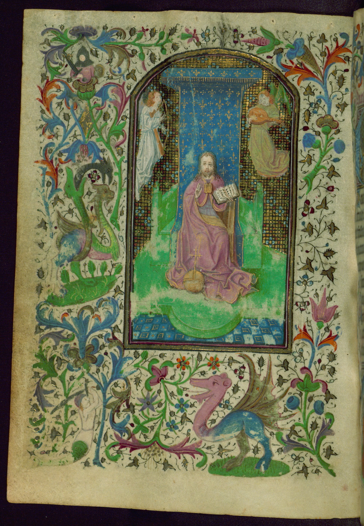 - Decoration note: Thirteen extant miniatures (of an original set of eighteen), inserted; decorated illuminated initials at text openings opposite full-page miniatures, letters in blue or mauve with white tracery (2-5 lines); at secondary text openings, gold on blue and/or mauve, white tracery similar to preceding decorated illuminated initials (2 lines); borders with figural themes at major text openings on versos facing rectos, on four sides; thirty-one narrative themes, thirteen at complete text openings, four at half-extant openings, figures mostly in medallions, one in panel, sometimes free-standing on green plots, infrequent secular motifs; drolleries found at illuminated text openings, motifs generally distributed along outer side margins, themes and gestures usually related to adjacent themes in miniature; secular repertory dominated by figures of men issuing from plants and varied grotesques; both active and impassive actions, music-making, combat, reading, looking on, praying; drolleries of note: a fool with spear (fol. 49v), a woman's horned hairdo (fol. 112r), nude men (fol. 86v-87r), winged hybrid man with conical cap urinating (?) into blossom (fol. 132v, possibly a proverb(?)); rubrics in red; text in black ink