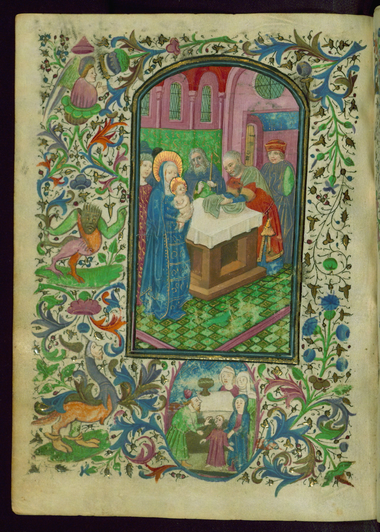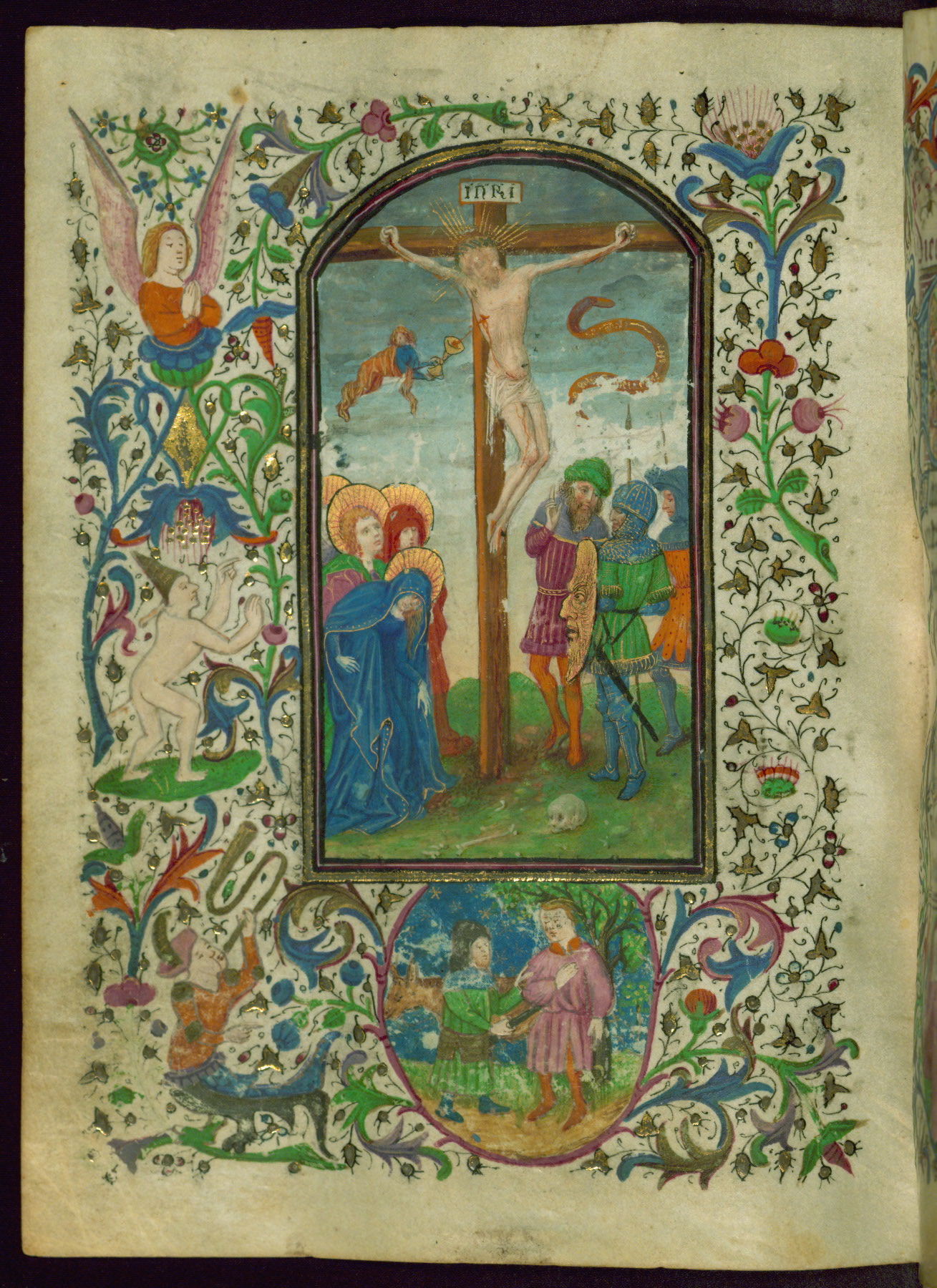 This pocket-size Book of Hours was completed for Use of Rome ca. 1450 and was illuminated under the influence of the artists of the Turin-Milan Hours and the Masters of the Gold Scrolls. There are thirteen extant miniatures (inserted), typological border themes, and drolleries. While the extant miniatures exhibit elegance and technical mastery, the figural decoration in the borders is marked in its contrast. However, the collaborating artists seem to have taken a certain amount of delight in the adjoining drolleries. The book itself has seen heavy use, and its original male owner is depicted with an inscribed scroll in the lower border at the first extant illuminated opening on fol. 17r. His image is possibly conflated with that of Lazarus on fol. 35v, and he can be seen depicted in borders throughout the manuscript. The majority of female saints in the litany suggests Franciscan and Francophile sympathies. The Book of Hours features calendar additions that indicate Spanish ownership in the second half of the fifteenth century, and it was rebound in Spain in the nineteenth century.