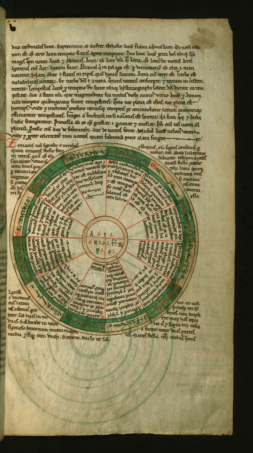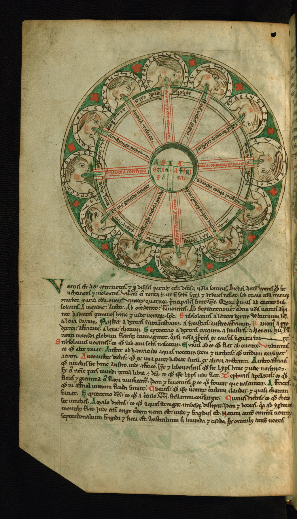 In the earth at center: “Asia,” “Europa,” “Affrica.” In the outer ring, beginning at the left (North), the names of the winds in colored capitals: “Septentrio” (North), “Aquilo,” “Vulturnus,” “Subsolanus” (East), “Eurus,” “Euroauster,” “Auster” (South), Euronothus,” “Affricus,” Zephirus” (West), “Chorus,” “Circius.” In the twelve corresponding sectors, beginning at left (North), the characterizations of each wind: “Ventorum primus cardinalis Septentrio qui et aparcias fri[gi]dus et niualis flat rectus ab axe. et facit arida. et frigora. et siccat nubes,” or “Septentrio (North Wind), the first of the cardinal winds, which is also called Aparcias, is cold and snowy. It blows straight from the North Pole and makes [everything] dry and cold and dries out the clouds.” “Aquilo ventus qui et boreas ex alto flat gelidus atque siccus et sine pluuia. quia non discutit nubes sed constringit,” or “Aquilo, the wind that is also called Boreas, blows from high up [i.e., the North]. It is icy and dry and without rain, because it does not disperse the clouds but binds them together/wrings them out.” “Vulturnus qui et boetias uocatus. dexter est Subsolani hic dissoluit omnia atque desiccat,” or “Vulturnus, which is also called Boetias, and is to the right of Subsolanus, scatters and dries up everything.” “Secundus cardinalis subsolanus qui et afeliotes. hic ab ortu intonat et est temperatus. Dicitur autem subsolanus ab ortu solis,” or “The second cardinal wind is Subsolanus (East Wind), which is also called Apeliotes. It thunders from the rising [of the Sun] and is temperate. Moreover, it is called Subsolanus [because it arises] beneath the rising of the Sun.” “Eurus ex sinistro latere ueniens subsolani. orientem nubibus irrigat Eurus dictus eo quod ab euro flat. id est ab oriente,” or “Eurus comes from the left side of Subsolanus and waters the East with clouds. It is called Eurus because it blows out of Euro, that is, the East.” “Auroauster [Euroauster] a dextris intonat Austri. Euroauster dictus quod ex una parte habeat eurum ex altero austrum,” or “Auroauster [Euroauster] thunders from the right of Auster. It is called Euroauster because it has on one side Eurus and on the other Auster.” “Tertius cardinalis uentus Auster qui et nothus. meridiane plage. humidus atque fulmineus generans largos imbres. et pluuias latissimas,” or “The third cardinal wind is Auster (South Wind), which is also called Nothus. It is from the South, and is moist and full of lighting, generating abundant clouds and widespread rain.” “Euronothus uentus temperatus et calidus. a sinistra parte austri spirat,” or “Euronothus is a temperate and warm wind. It blows from the left side of Auster.” “Affricus qui et lyps ex zephiri dextro intonans. generans tempestates et pluuias. nubium collisiones. tonitrua fulgura. fulminorum impulsus,” or “Affricus, which is also called Lyps, thunders from the right of Zephirus, generating tempests and rain. The pressure of the blows of clouds are thunderbolts and flashes of lightning.” “Quartus cardinalis zephirus qui et fauonius ab occidente interiore flat. hic hiemem frigore relaxat flores producit,” or “The fourth cardinal wind is Zephirus (West Wind), which is also called Favonius. It blows from the midst of the West. It eases the harshness of winter and produces flowers.” “Chorus qui et argestes ex sinistra parte fauovnii aspirat. et flante in oriente. nubile sunt in india serena,” or “Chorus, which is also called Argestes, blows from the left side of Favonius. It blows bearing clouds in the East, and tranquil weather in India.” “Circius qui et tracias a dextris septentrionis intonans facit nubes grandinumque coagulationes. circius dictus est eo quod euro sit iun[g]etus,” or “Circius, which is also called Tracias, thunders from the right of Septentrio. It makes clouds and coagulated (frozen?) hail. It is called Circius because it is joined with Euro (should be “Chorus”).”