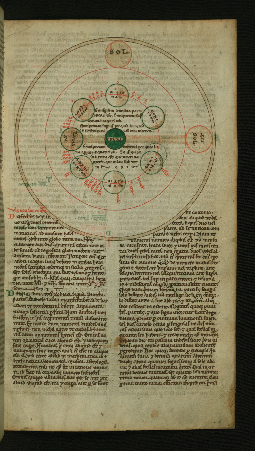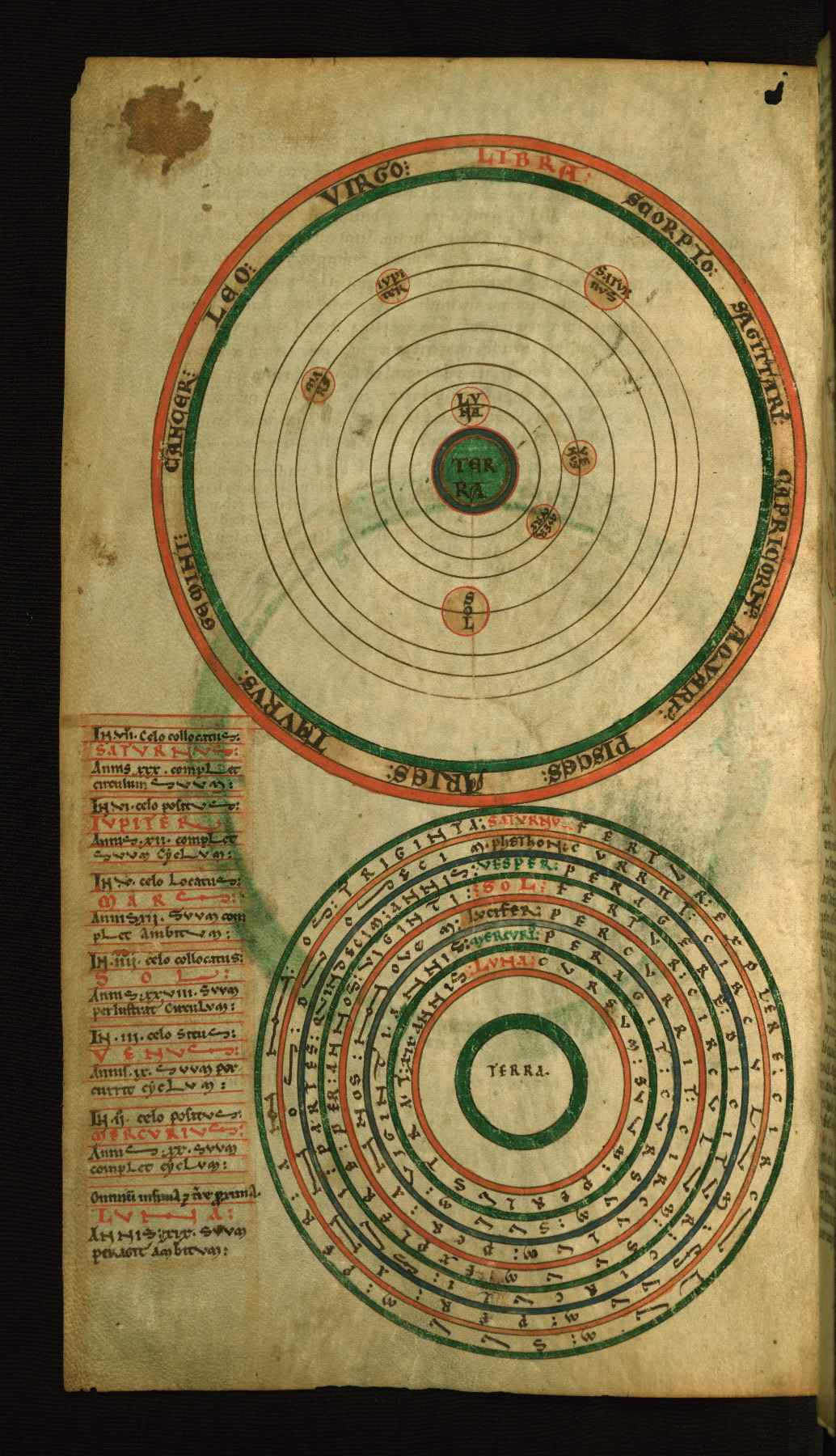 - Label: The wheel diagram at the top of the page shows the Earth at center, with the seven heavenly bodies--the Moon, Mercury, Venus, the Sun, Mars, Jupiter, and Saturn--orbiting in concentric rings. The zodiacal names are given in the diagram’s frame. As had the ancients, medieval authorities believed that the Earth lay at the center of the universe, and that the Sun, Moon, and planets circled it. Also following ancient writers, medieval authors called the planets “wandering stars” because of their eccentric orbits: the word “planet” derives from the Greek “planetoi,” for “wanderers.” Their orbits were calculated according to the length of time it took them to complete one circuit of the zodiac. In the wheel diagram in the bottom half of the page, the Earth at center is surrounded by concentric bands containing the names of the heavenly bodies and the intervals of their orbits.