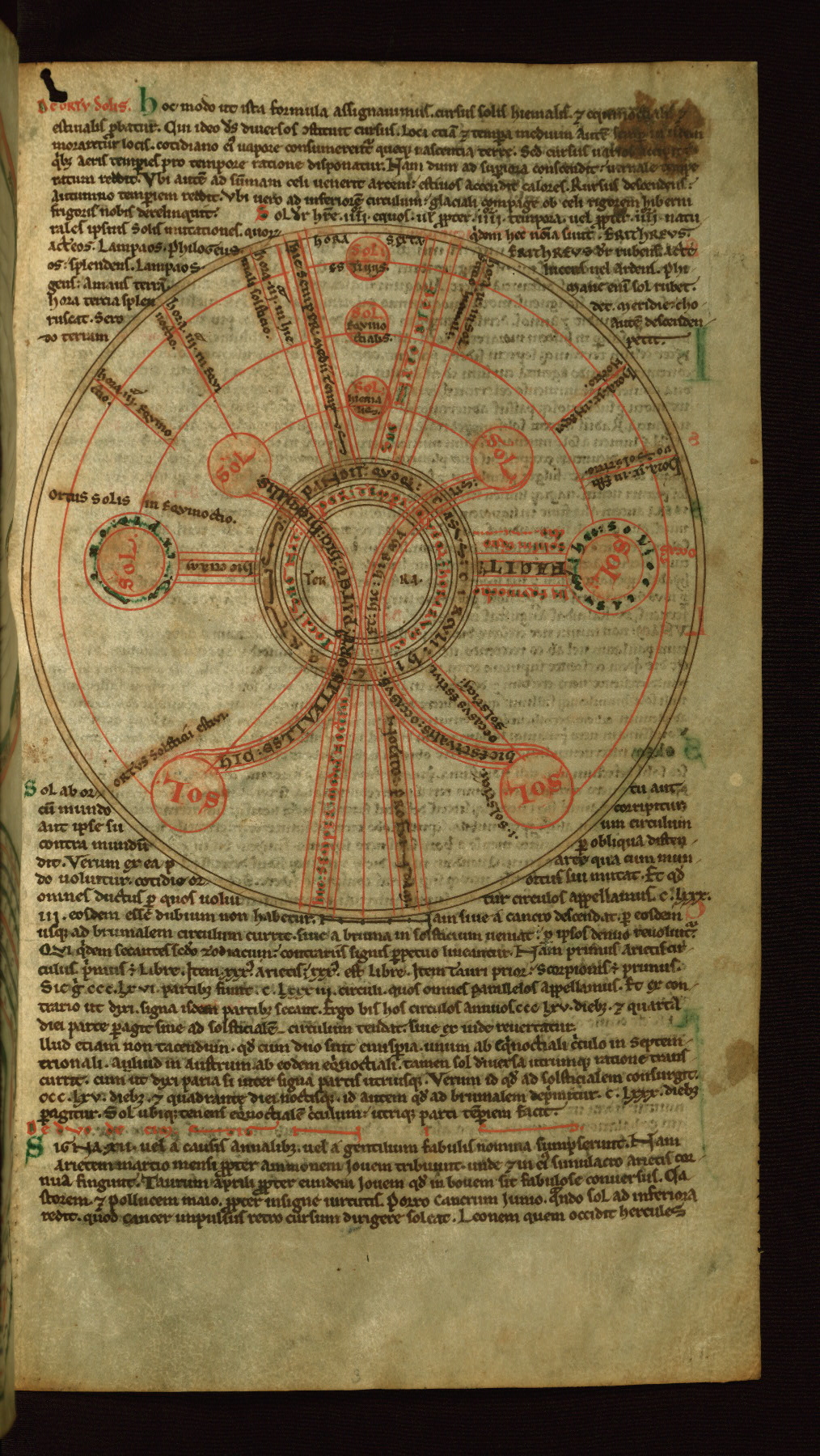 In the earth at center: “Terra;” in the circles that surround it: “Hic ortus pandit quoque casus circuli. Loca signat per tempora queque horarumque" or "Here the sunrise spreads through the calendar. It shows the places through the times and hours (?)". In the yellow discs representing the solstitial and equinoctial sunrises and the midday suns, in red: “Sol.” Alongside sunrise at the summer solstice: “Ortus solsticii estiui,” or "[Sun]rise at the summer solstice." Alongside sunset at the summer solstice: “I solsticii?” or "In the solstice?" and “Occasus estiui solsticii,” or "[Sun]set at the summer solstice." Alongside the equinoctial sunrise: “Ortus solis in equinoctio,” or “Sunrise at the equinox.” Around the equinoctial sunset: "hic solis occasus," or "here the setting of the sun." The band connecting the equinoctial sunrise and sunset: "facit hic etiam." Alongside the band: "in equinoctio solis in equinoctio (?)" Alongside the lines on either side of the midday Suns, from left: “Hora iii equinoctio,” or "The third hour at the equinox." “Hora iii in equinoctio,” or "The third hour at the equinox. “Hora iii in hiemilis solsticio,” or "The third hour at the winter solstice." “Hora ix in solsticio hiemalis,” or "The ninth hour at the winter solstice." “Hora ix in equinoctio,” or "The ninth hour at the equinox." “Hora ix in Estiuo equinoctio,” or "The ninth hour at the summer equinox." On the band to the left of the midday Suns: “Hic semper medii tempus,” or “Here it is always midday.” To the right: "Sic nato vici," or “Thus, with a change arisen.” On the straight bands beneath the central circles: “Nocto profundam,” or “Boundless night” and "hic semper media noctem," "here it is always the middle of the night." In the arced band connecting the solstitial and equinoctial suns (at left): “Hic estiualis ortus patet. Hic hiemalis,” or “Here opens (begins?) the summer [Sun]rise. Here [opens/begins] the winter [[Sun]rise].” At right: “Hic estiualis occasus. Et hic hiemalis,” or “Here is the summer [Sun]set. And here is the winter [[Sun]set].”