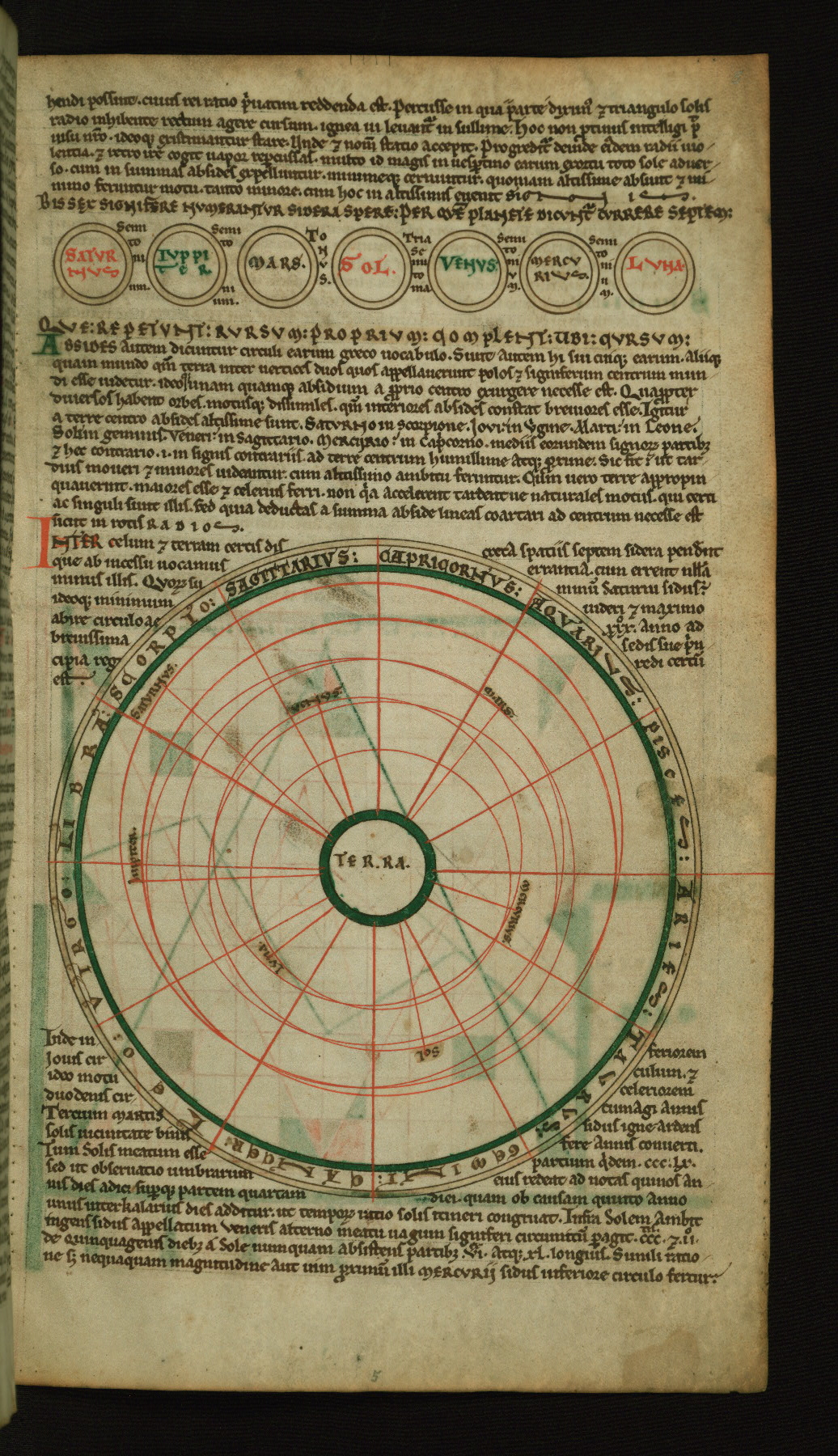 A title, added in the thirteenth century, reads “Tractatus de sphera;” at the center of the diagram: “Terra”; in the fourth ring, the twelve months of the year; in the rim of the wheel, an inscription, beginning at ten o'clock: "hec tempora queque sidera septena per signa gerunt duodena in celo cursus eadem repetentia rursus per signum quodque retinent," or "The times carry the seven planets through the twelve constellations in the heavens. Their courses retain them [the planets], returning again through each constellation."