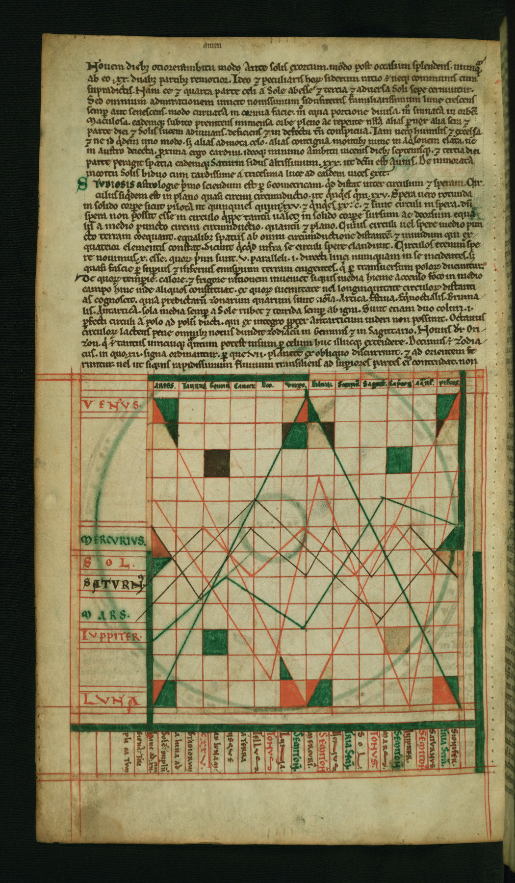 Along the vertical, from the bottom: “Luna,” "Iuppiter,” “Mars,” "Saturn,” “Sol,” “Mercurius,” “Venus.” Along the horizontal, at top, from left to right: “Aries,” “Taurus,” “Gemini,” “Cancer,” “Leo,” “Virgo,” “Libra,” “Scorpio,” “Sagittarius,” “Capricornus,” “Aquarius,” “Pisces.” Along the bottom, reading from left to right, beginning with “Tellus” (Earth): “Tellus. Tonus. Luna. Semiton(ium). Mercuri(us). Semiton(ium). Venus. Tria Semi(tonia). Sol. Tonus. Mars. Semiton(ium). Saturnus. Tria Semi(tonia). Signifer.” Along the bottom, reading from right to left, beginning with “A Terra”: “A Terra usque ad Lunam CXXV stadiorum. A Luna ad Sole(m) duplu(m). Hinc ad XII signa triplicatum,” or “From the Earth all the way to the Moon is 125,000 stadia, and double that from the Moon to the Sun, and three times that [from the Sun] to the zodiacal signs.”