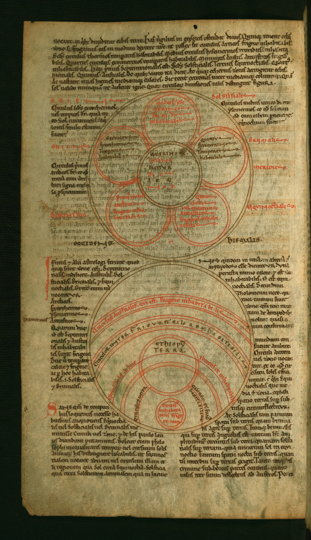 In the upper diagram, at center: “Riphei Montes,” or “The Riphaean Mountains.” Within or along the arcs and in the circle at the bottom of the diagram, reading from top down: “Circulus Australis qui est frigore inhabitabilis,” or “The southern cycle, which is cold and uninhabitable.” “Circulus inter frigus et calorem habitabilis,” or “The cycle between the cold and hot is habitable.” “Circulus solis ardore inhabitabilis,” or "The circle of the heat of the Sun (i.e., the equatorial circle) is uninhabitable.” “Circulus habitabilis inter frigus et calorem habitabilis,” or “The circle between the cold and heat is habitable.” “Circulus frigore inhabitabilis,” or "The [Arctic] circle is cold and uninhabitable.” Around the rim of the diagram: “Ethereus zonis quint[i]s accingitur orbis,” or “The circle [of the world] girded by the five celestial zones.” Below the Riphaean Mountains, in red: “Quintus,” or “Five.” In the lower diagram, reading outward: Innermost ring: “Cursus lune per duodecim signa,” or “The course of the Moon through the twelve zodiacal signs.” In the third ring from center: The first letters of the names of the twelve months of the year, reading counterclockwise from the top and beginning with “A” for April. In the fourth ring: The number of lunar days in each month -- either XXIX or XXX. In the fifth ring: The days of a single siderial month, numbered I-XXX and reading counterclockwise from the top. The numbers in this ring are the days of the siderial month in which the Moon is in the zodiac sign named in the corresponding sector of the sixth ring (the next ring out). In the sixth ring: The twelve names of the zodiac, reading counterclockwise from the top, beginning with Aries. In the outer ring, beginning at bottom left: “Hic qualem mensis fert lunam quisque uidebis. Unus ter denam fert alter et unde tricenam. Et lune cursus per singula signa notabis,” or “Here you will see what sort of moon each month brings. The one moves three times ten, the other, and whence thirty (?). And you will note the course of the Moon through each zodiacal sign.” At the bottom, a small inscription describes the middle of the moon's monthly course: "Diametrum vocatur locus ubi xv erit luna vel ideo Diane terminum (?) dicitur quia ibi est dimidium men[s]ium celi."