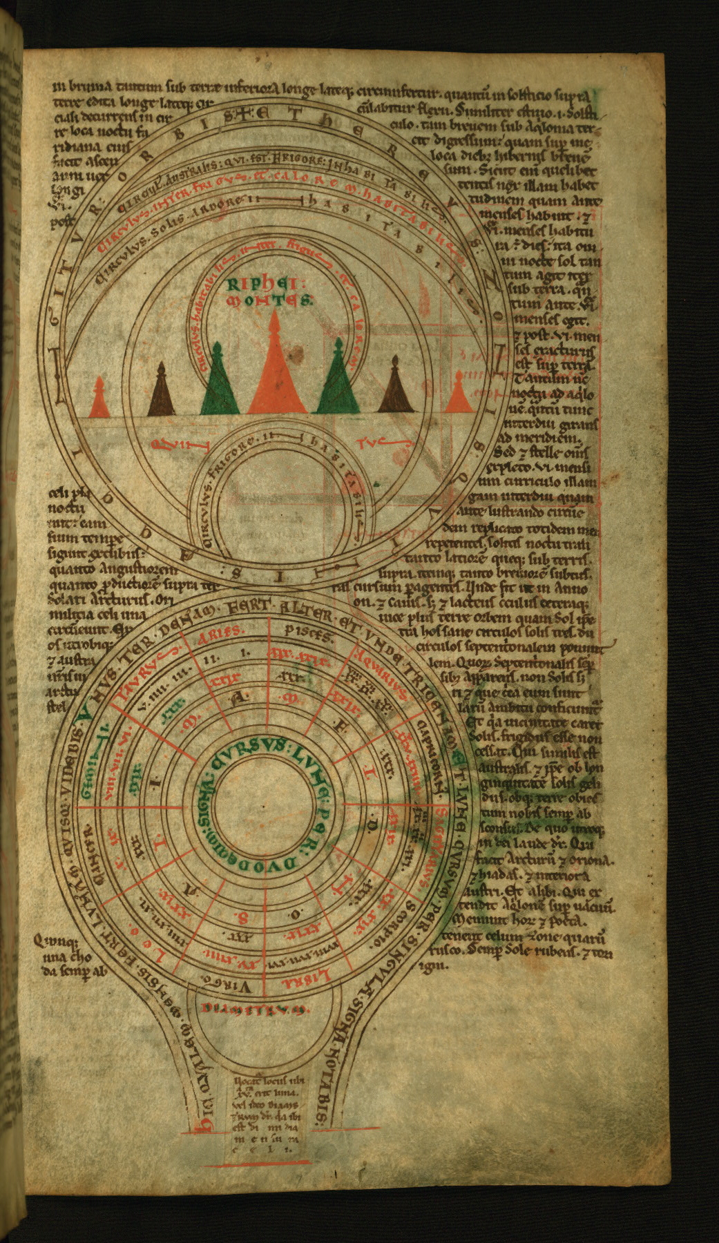 - Label: In the diagram in the top half of the page, the observer’s point-of-view is the North Pole. This diagram is similar to the one in the lower part of fol. 6v, except that it also shows the Riphaean Mountains – a mythical range of peaks thought to mark the boundary between Asia and Europe, and the Arctic and North temperate zones -- represented as seven abstract, colored silhouettes resembling triangular game-pieces. The diagram in the bottom half of the page charts the course of the Moon through the zodiac, correlating the lunar or synodic months and the zodiacal signs. According to the De natura rerum (On the nature of things) of the English scholar, Bede (d. 735 CE), the Moon journeys through the zodiac thirteen times in twelve lunar months; thus, it runs through each zodiacal sign in a little over two days and six hours.