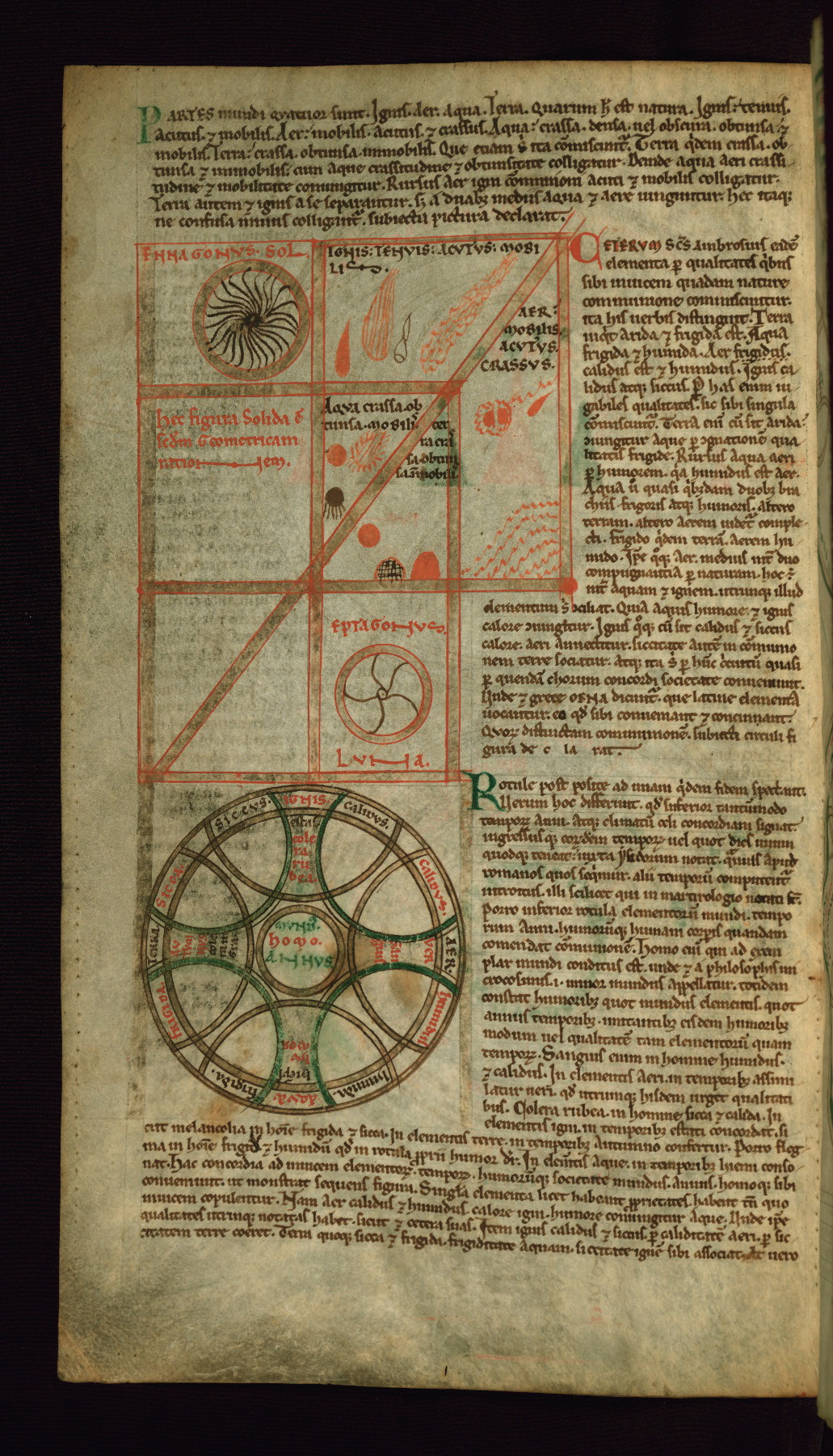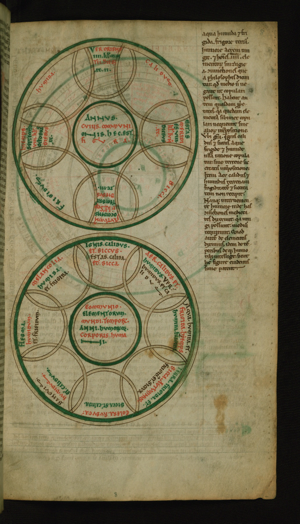 - Label: Both of these wheel-shaped diagrams resemble in their structure the diagram of the microcosmic-macrocosmic harmony on the preceding page. The eight intersecting arcs of the top diagram show the relationships among the four seasons, the four qualities of the year, the four cardinal directions, and the dates of seasonal changes. Thus, this diagram illustrates the notion of the unity of time and space as expressed in the Spanish scholar Isidore of Seville’s (d. 636 CE) scientific work, De natura rerum (On the nature of things, X). The bottom diagram illustrates the relationships among the four elements – Earth, Air, Fire, and Water – the four seasons, and the four bodily humors – phlegm, blood, yellow bile, and black bile -- as well as giving qualities associated with each. These relationships, first articulated by classical authorities and reprised in Isidore’s De natura rerum, XI, iii, form the basis of medieval medicine.