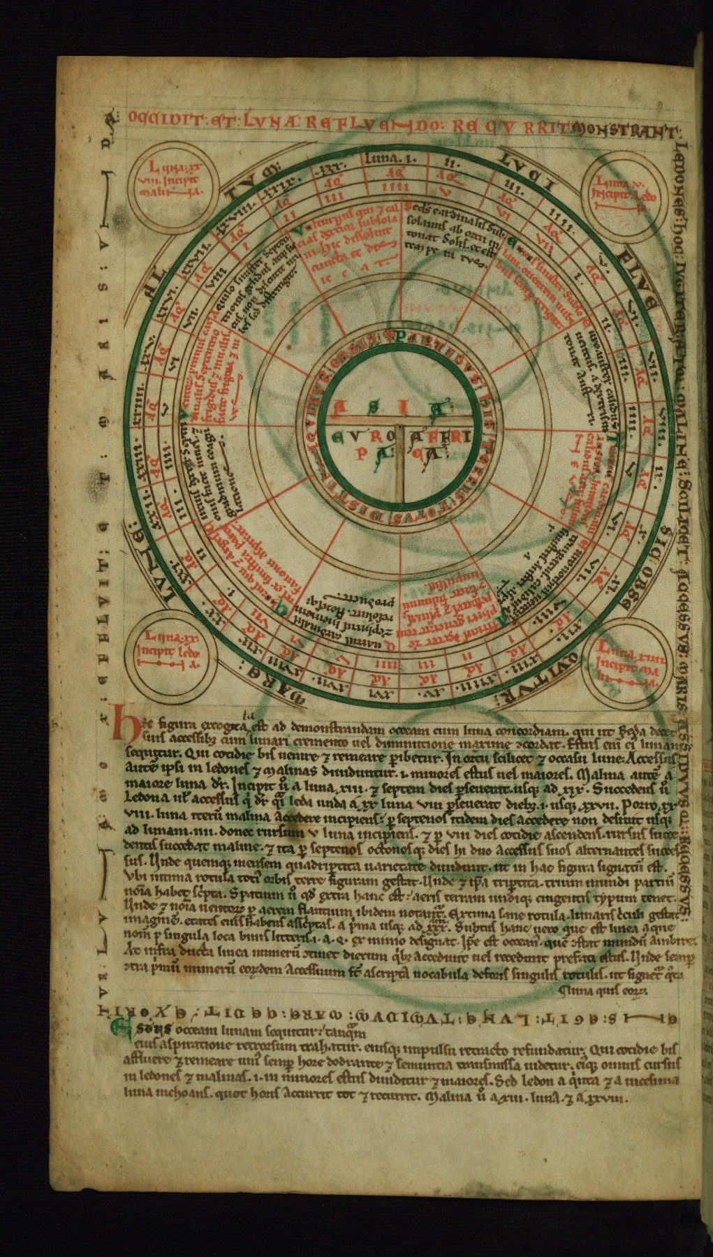 - Label: This wheel-shaped diagram illustrates the monthly movement of the tides, and shows the correspondences between the tides and the age of the Moon as set out in the English scholar Bede’s (d. 735 CE) De natura rerum (On the nature of things, XXXIX). The T-O map of the inhabited world occupies the diagram’s center. The twelve sectors contain brief characterizations of the twelve winds. The first of the three outer rings shows four tidal cycles of seven or eight days each; the next ring, labeled “water” (aqua) thirty times, represents the ocean surrounding the world. The last ring in this group gives the days of the lunar or synodic month, beginning at top. The four small circles at the corners--perhaps four representations of the Moon--give the days of the two lesser (or lowest) tides and the two greater (or highest) tides of the month.