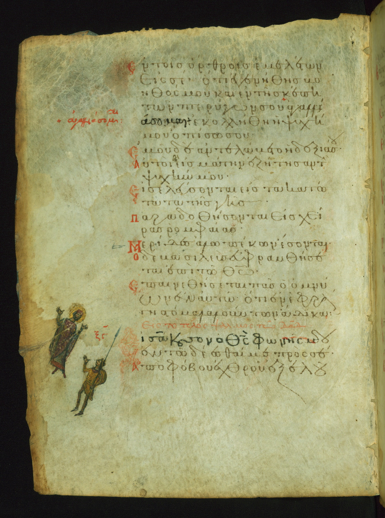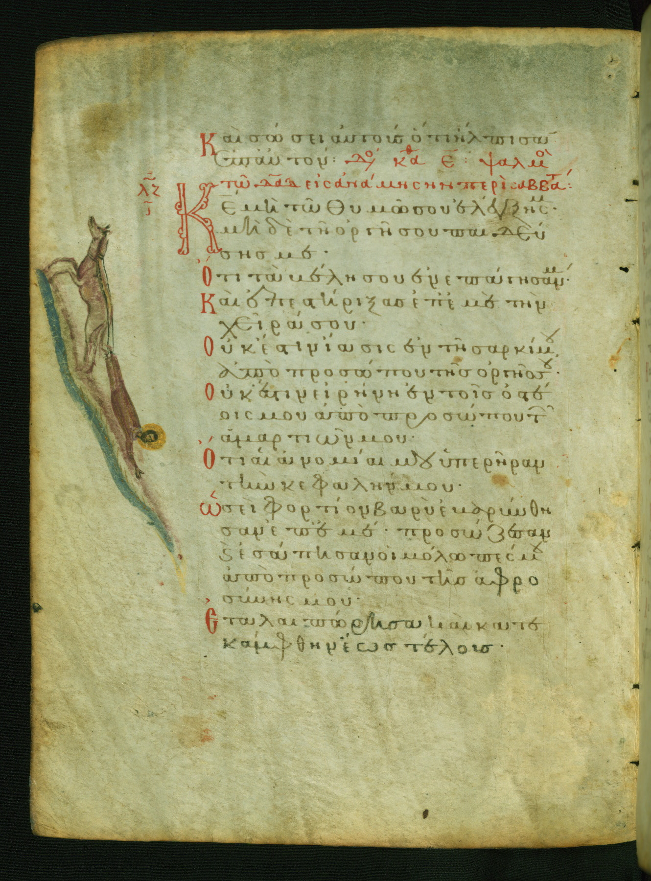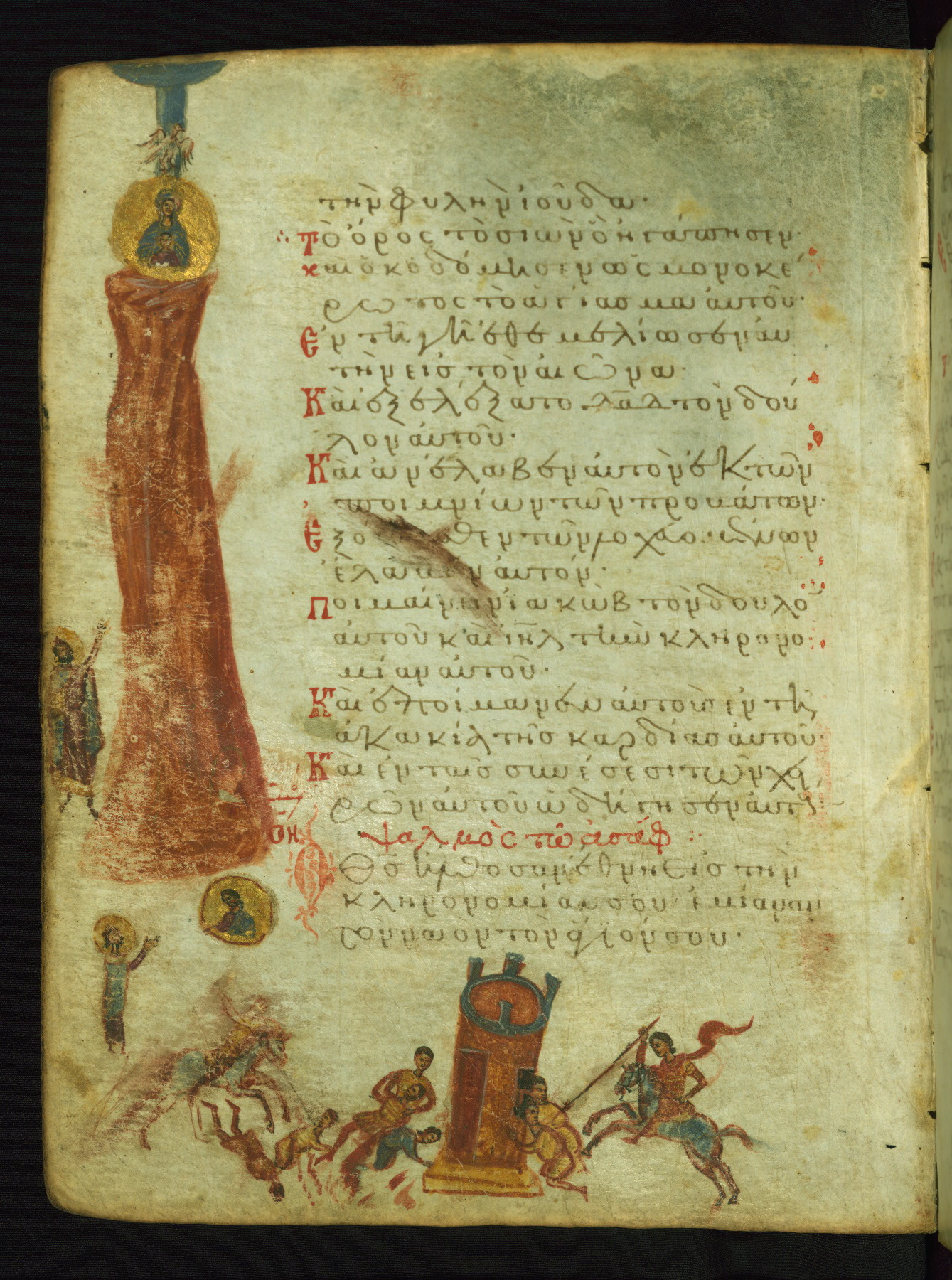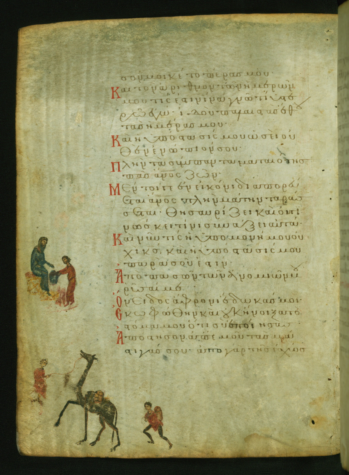 This manuscript, illustrated with 155 marginal paintings, is one the few surviving “marginal psalters,” in which images provide a pictorial commentary on the Biblical text. Other examples include the Khludov Psalter (ca. 850 CE, Moscow, State Historical Museum, Muz. 129), the Barberini Psalter (ca. 1050 CE, Vat. Barb. Gr. 372), the Theodore Psalter (1066 CE, London, British Library, Add. Ms. 19,352), and a Cyrillic psalter made in Kiev (1397 CE, Saint Petersburg, National Library of Russia, cod. OLDP, F6). The Walters' psalter was apparently copied from the same eleventh-century model as the Saint Petersburg manuscript, as the iconography of the two is very similar.