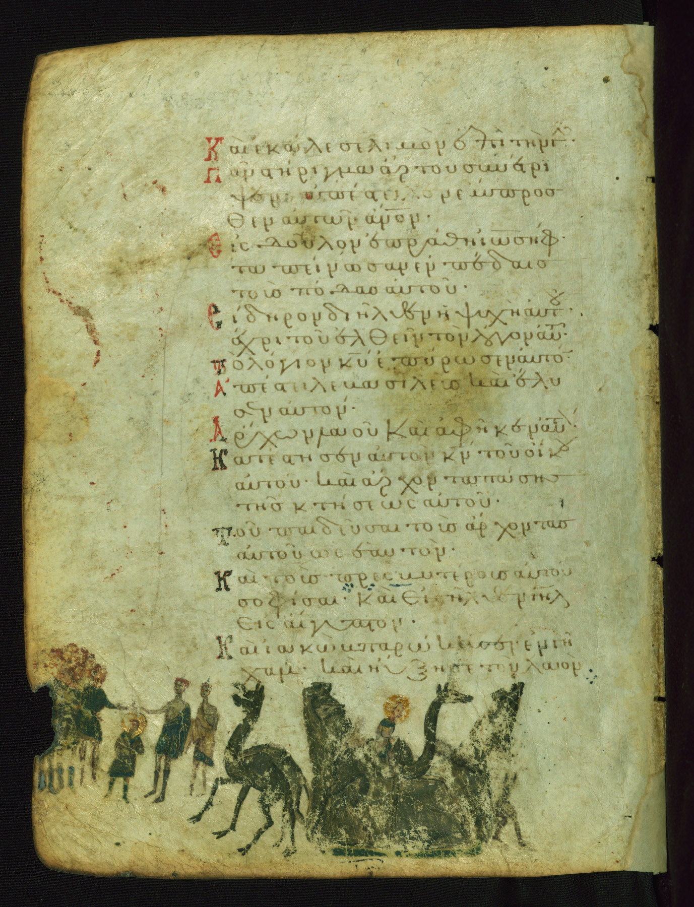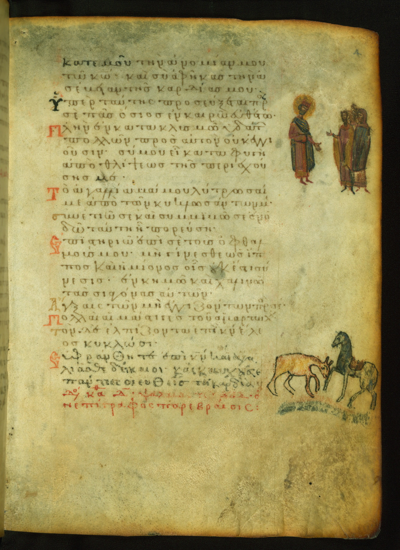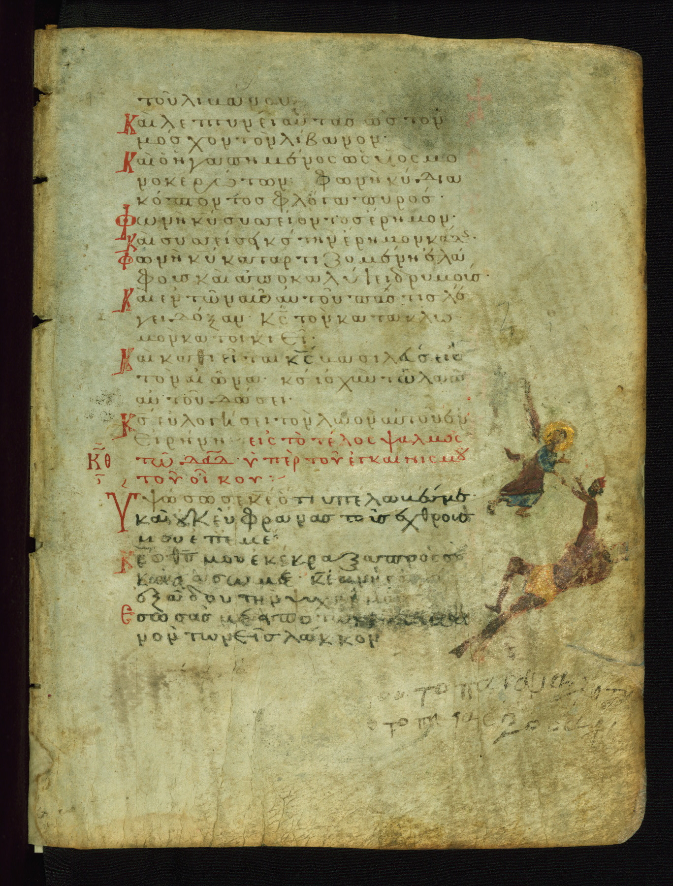 This manuscript, illustrated with 155 marginal paintings, is one the few surviving “marginal psalters,” in which images provide a pictorial commentary on the Biblical text. Other examples include the Khludov Psalter (ca. 850 CE, Moscow, State Historical Museum, Muz. 129), the Barberini Psalter (ca. 1050 CE, Vat. Barb. Gr. 372), the Theodore Psalter (1066 CE, London, British Library, Add. Ms. 19,352), and a Cyrillic psalter made in Kiev (1397 CE, Saint Petersburg, National Library of Russia, cod. OLDP, F6). The Walters' psalter was apparently copied from the same eleventh-century model as the Saint Petersburg manuscript, as the iconography of the two is very similar.
