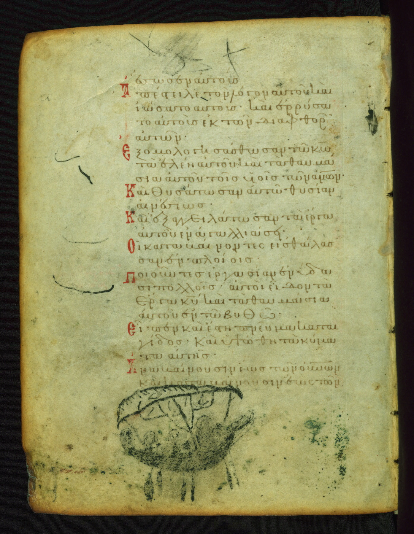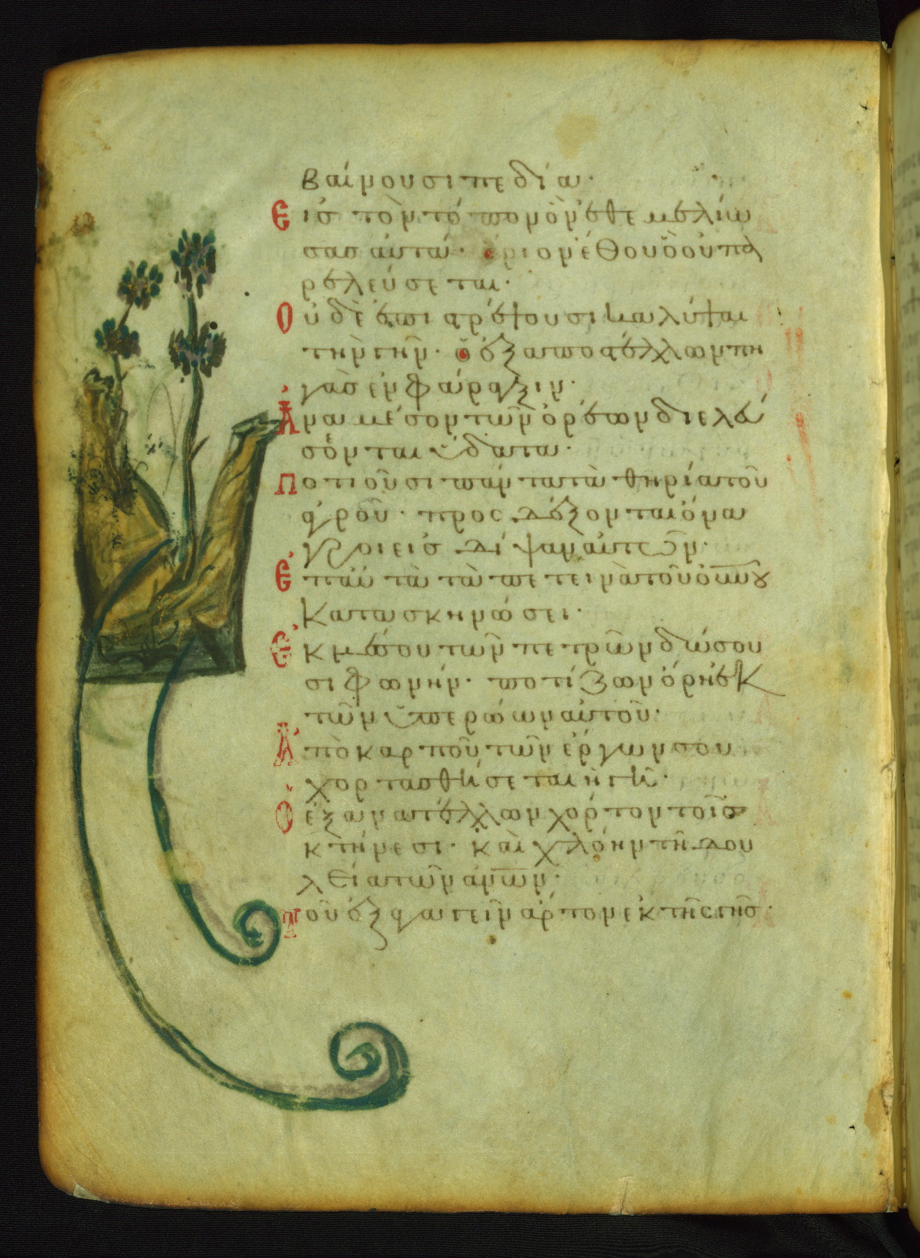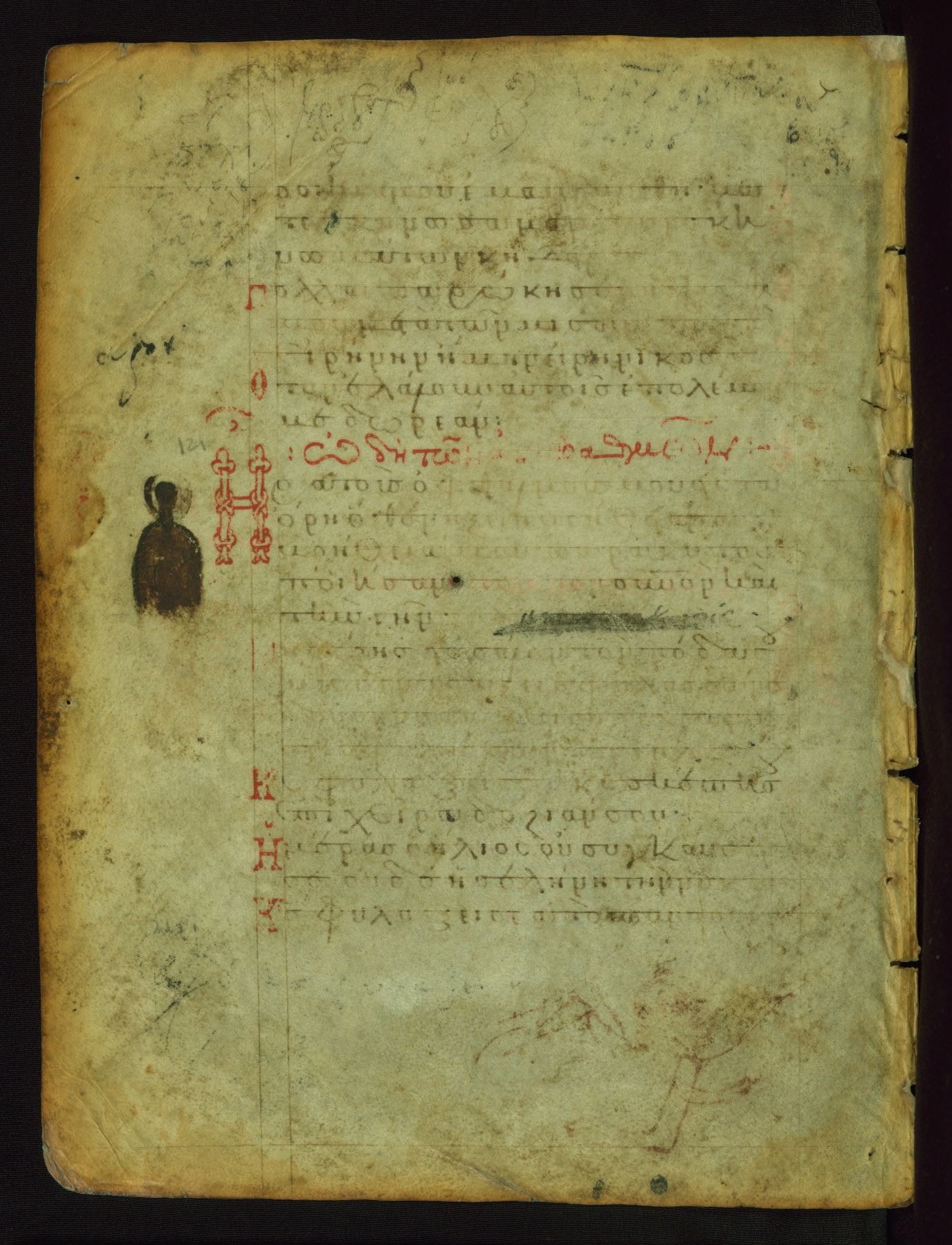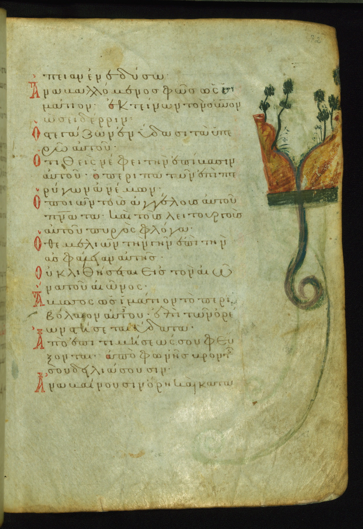 This manuscript, illustrated with 155 marginal paintings, is one the few surviving “marginal psalters,” in which images provide a pictorial commentary on the Biblical text. Other examples include the Khludov Psalter (ca. 850 CE, Moscow, State Historical Museum, Muz. 129), the Barberini Psalter (ca. 1050 CE, Vat. Barb. Gr. 372), the Theodore Psalter (1066 CE, London, British Library, Add. Ms. 19,352), and a Cyrillic psalter made in Kiev (1397 CE, Saint Petersburg, National Library of Russia, cod. OLDP, F6). The Walters' psalter was apparently copied from the same eleventh-century model as the Saint Petersburg manuscript, as the iconography of the two is very similar.