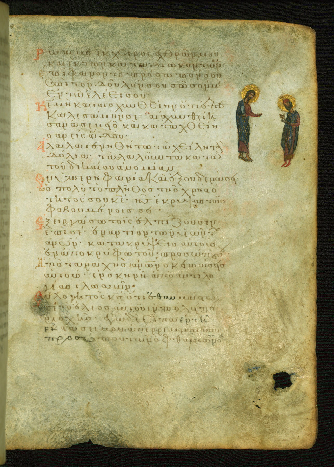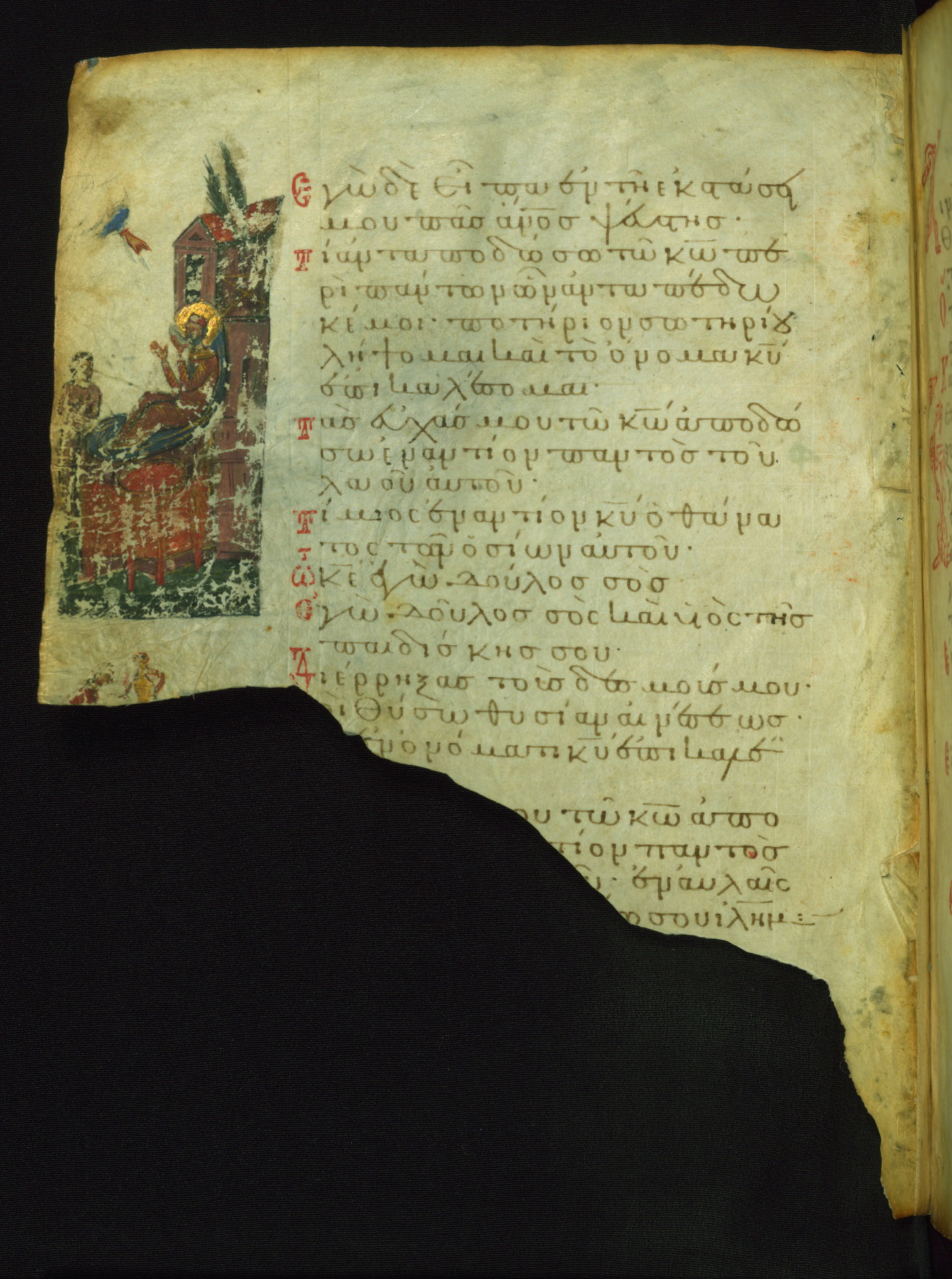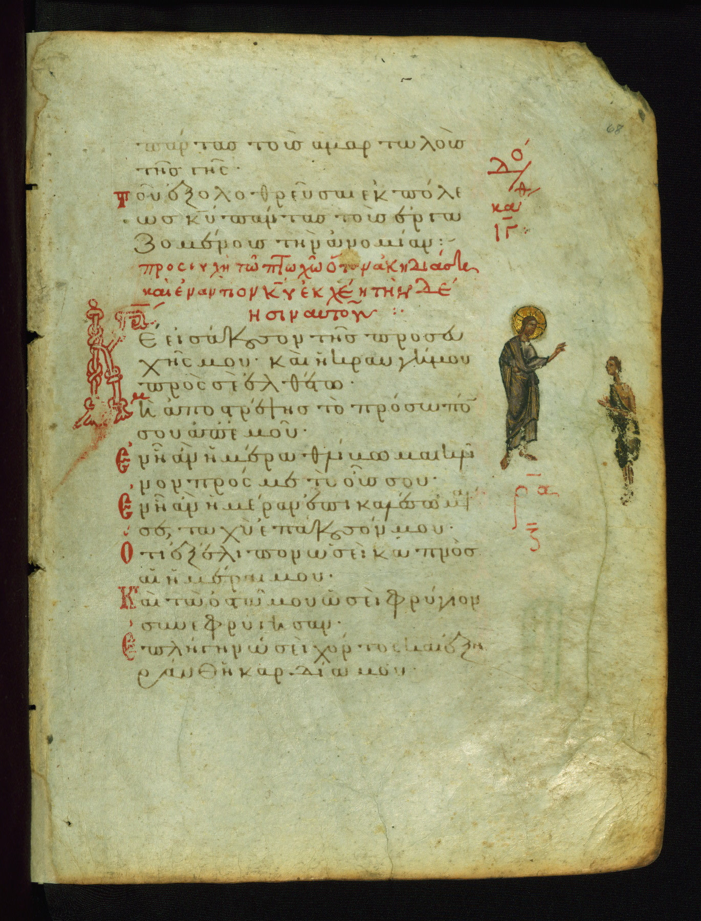 God, represented as Jesus Christ, is shown here addressing King David, the author of the Psalms. This illustrates the verse "Shine your face upon your slave; save me in your mercy." The lower right corner of the page probably contained images of two falling demons, now erased, which corresponded to the verse (marked with three red dots in the text): "May the impious be shamed and be brought down to Hades" (NETS).