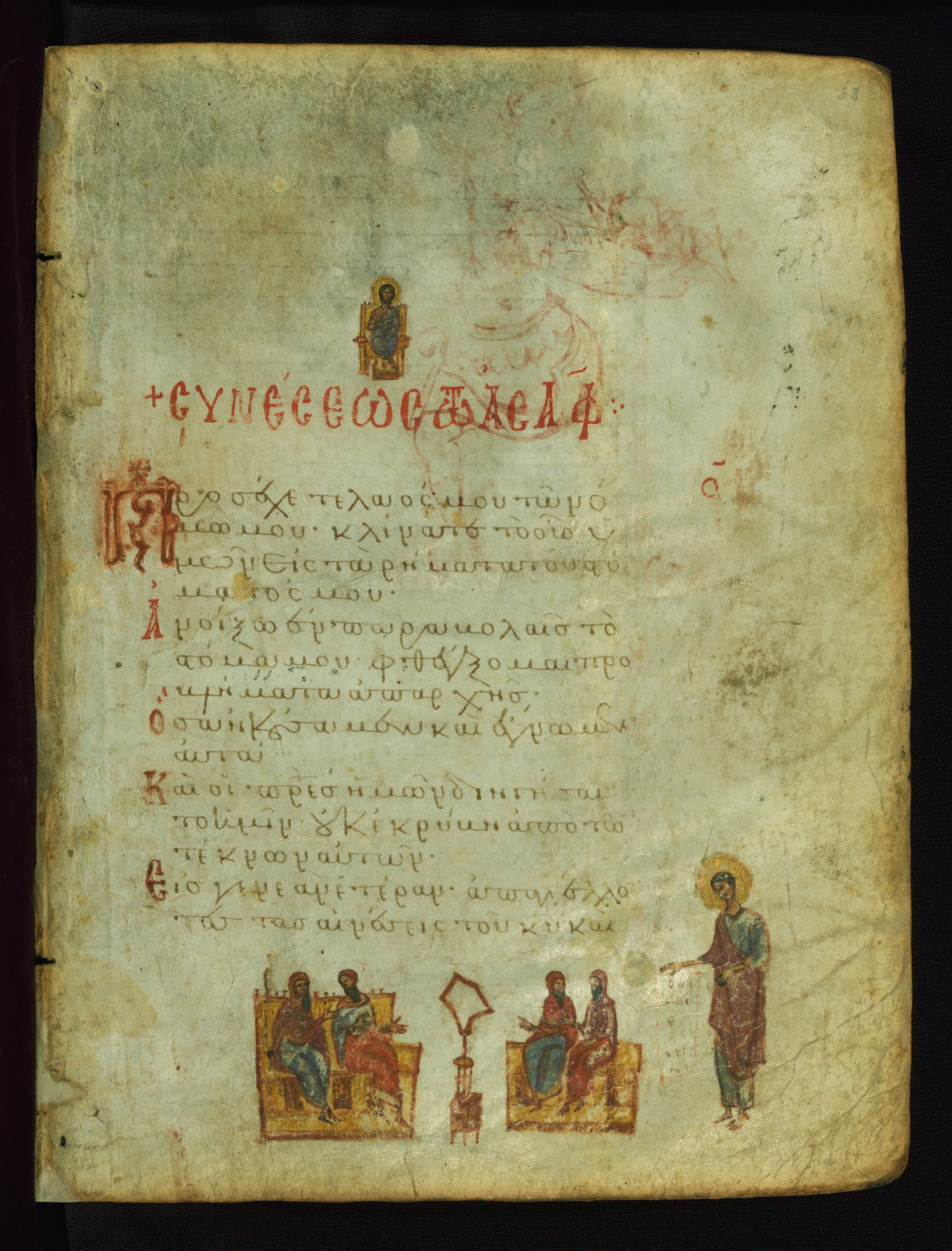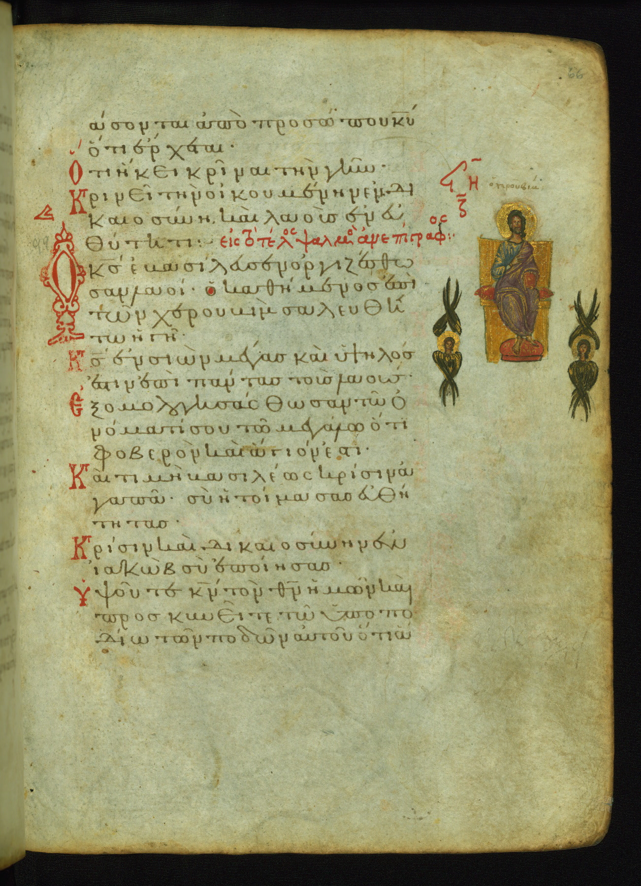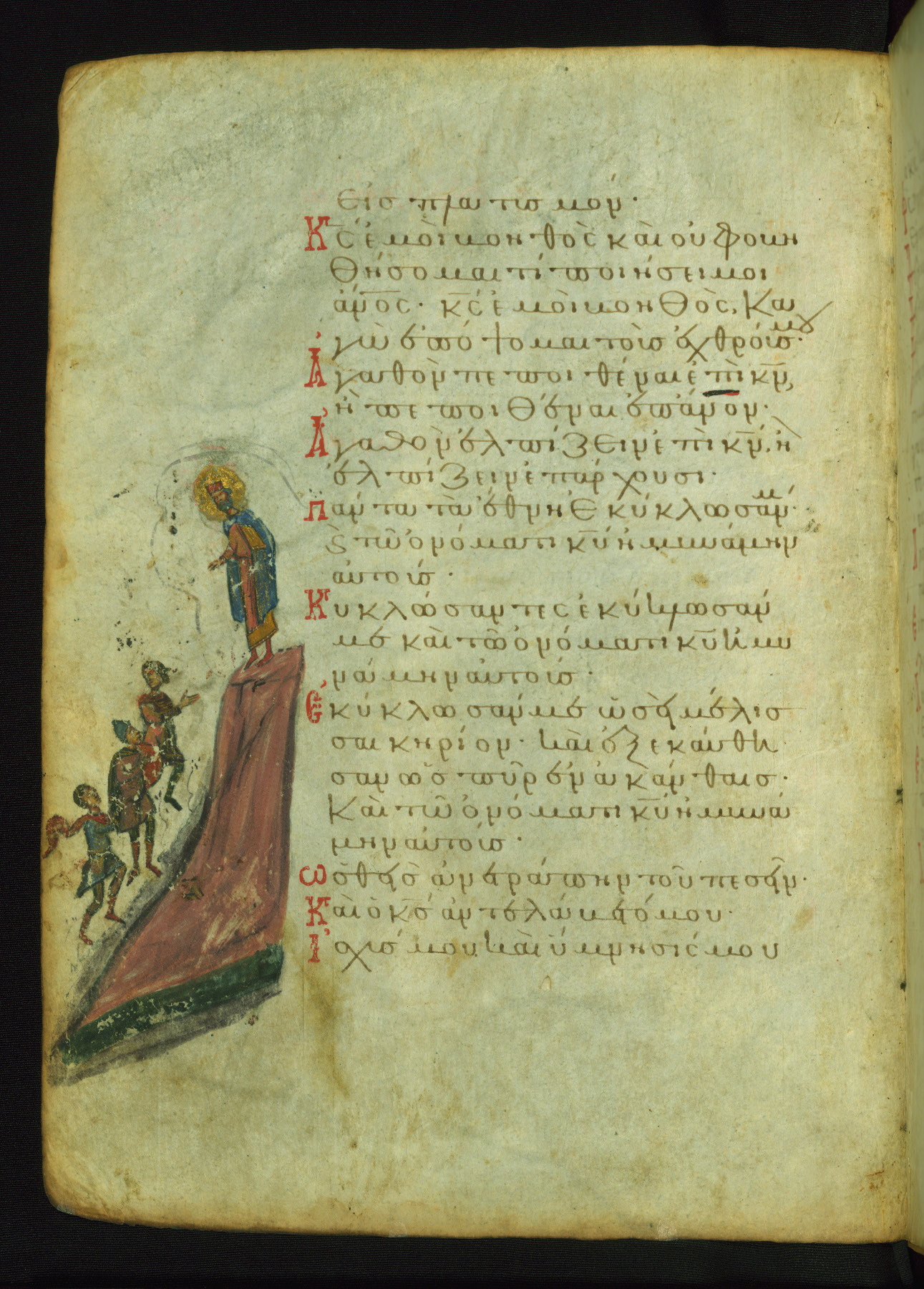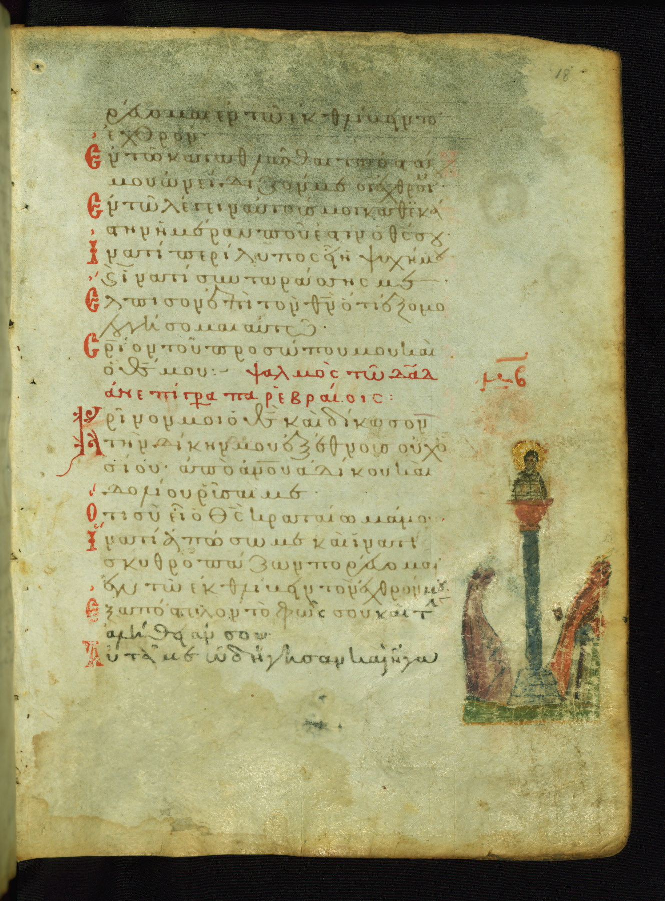 God, represented as Jesus Christ, is shown here addressing King David, the author of the Psalms. This illustrates the verse "Shine your face upon your slave; save me in your mercy." The lower right corner of the page probably contained images of two falling demons, now erased, which corresponded to the verse (marked with three red dots in the text): "May the impious be shamed and be brought down to Hades" (NETS).