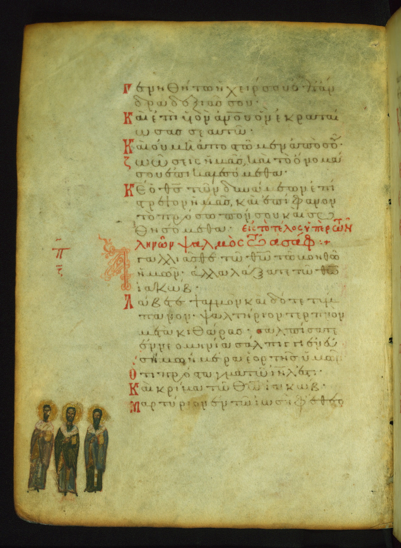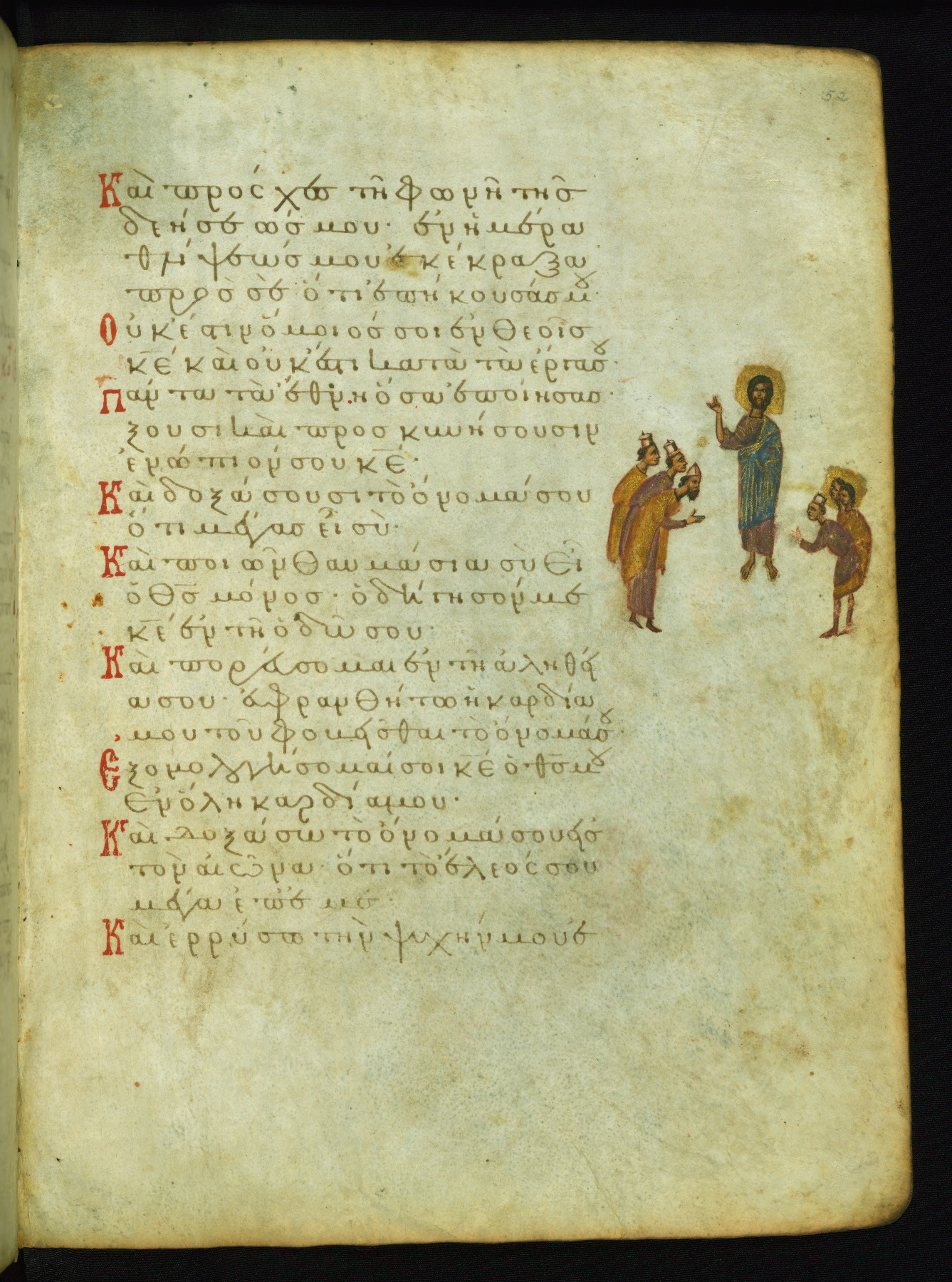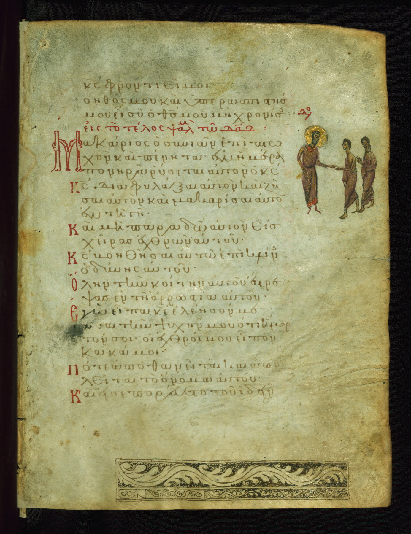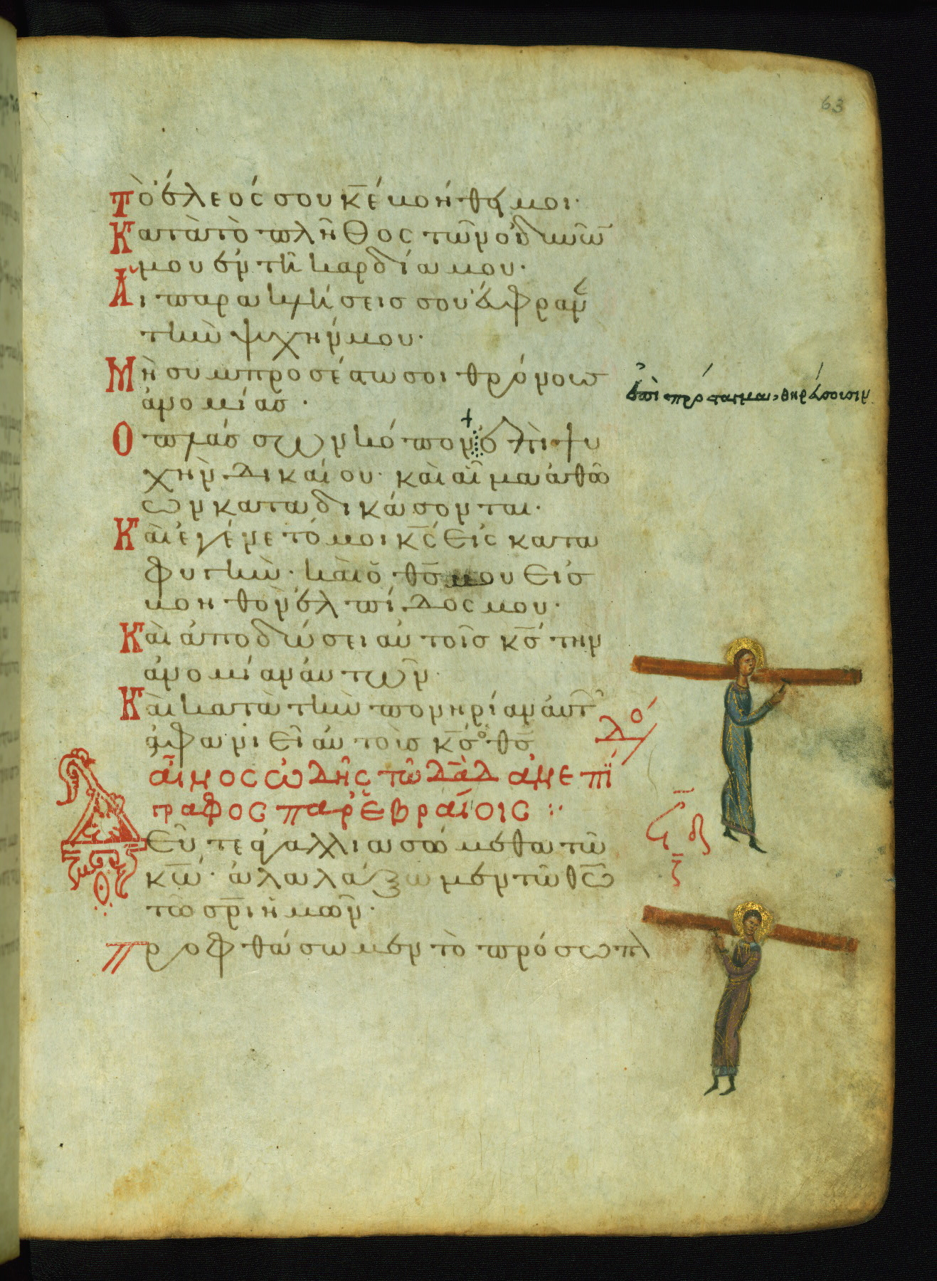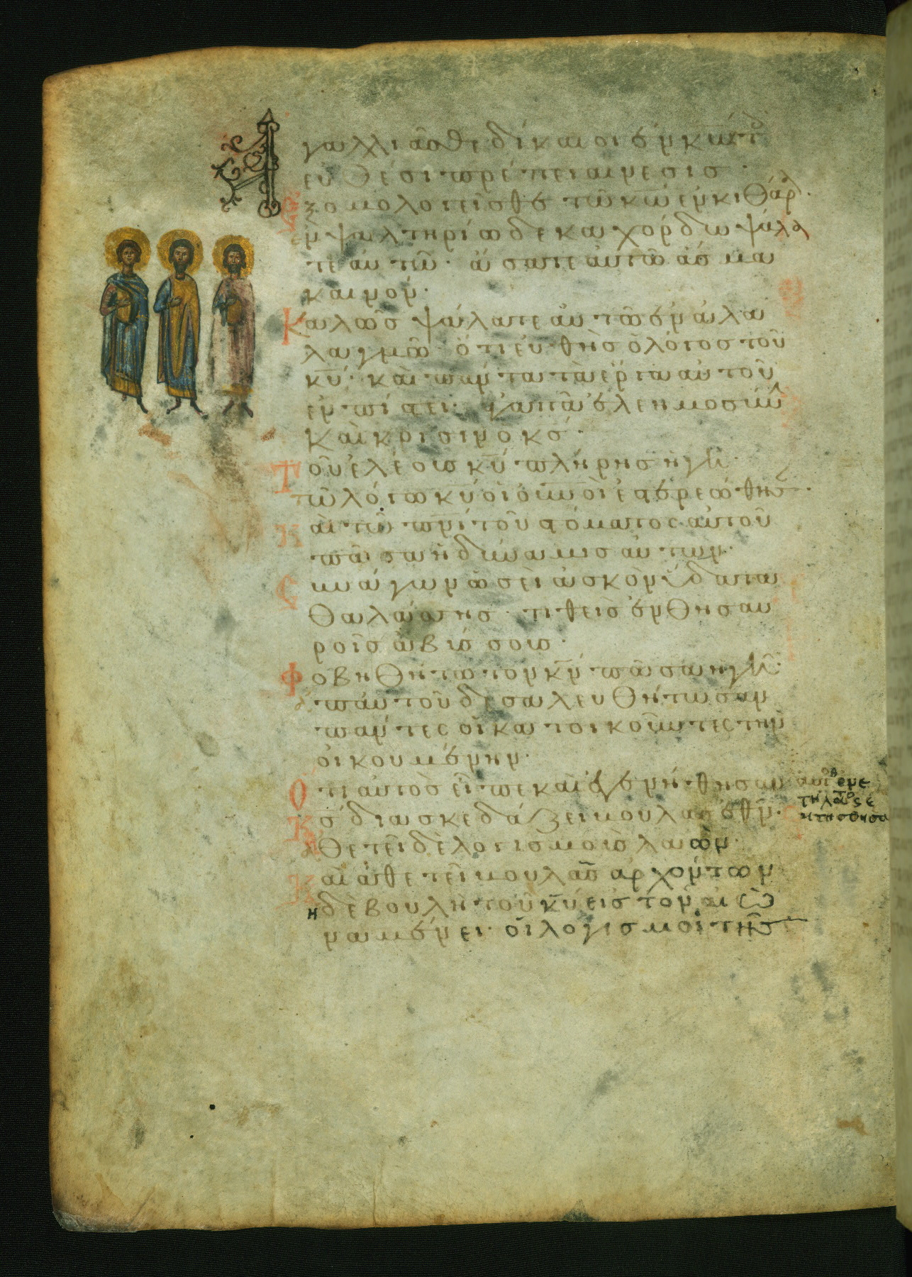 The three men in this miniature hold crosses that identify them as martyrs. These are probably the righteous mentioned in the first verse on this page: "Rejoice in the Lord, O you righteous..." (NETS).