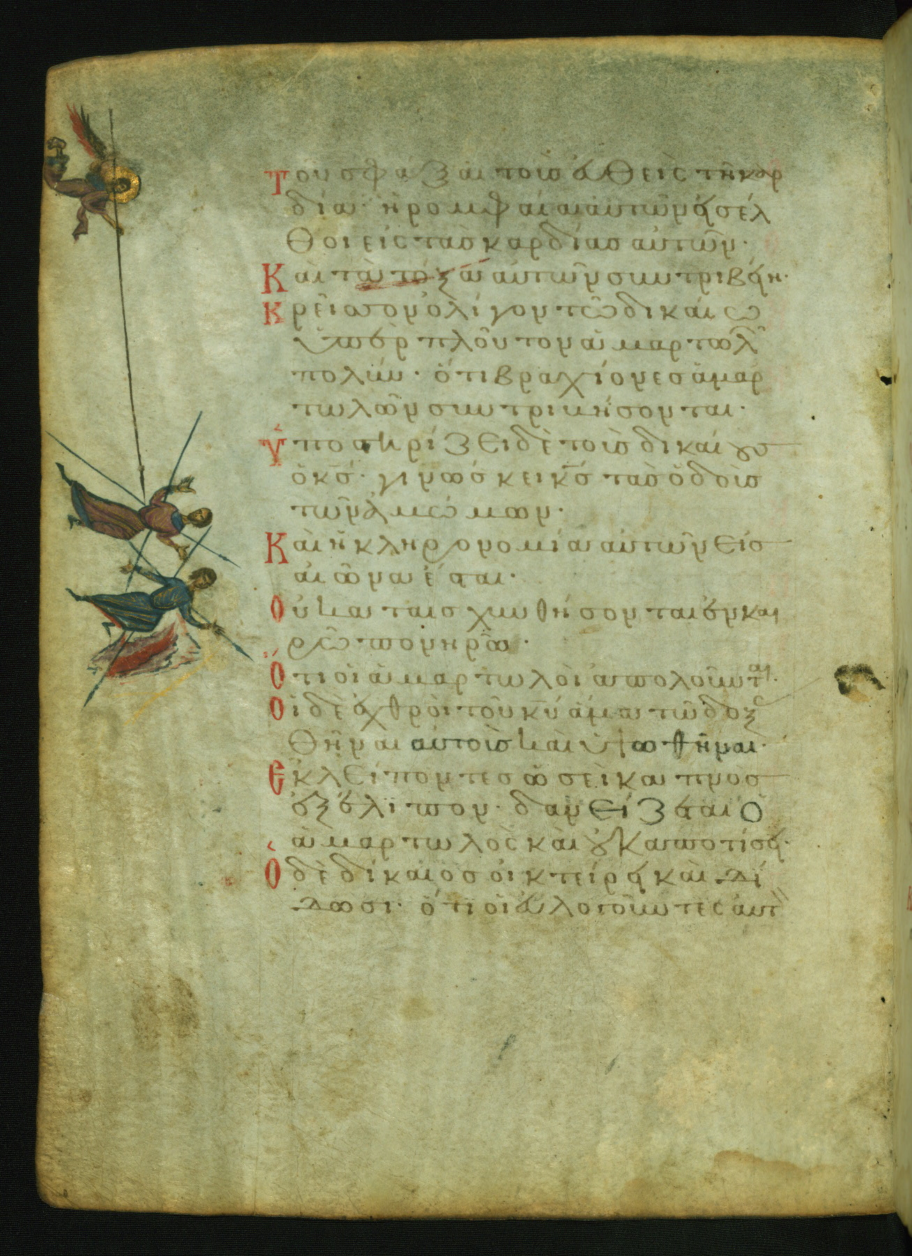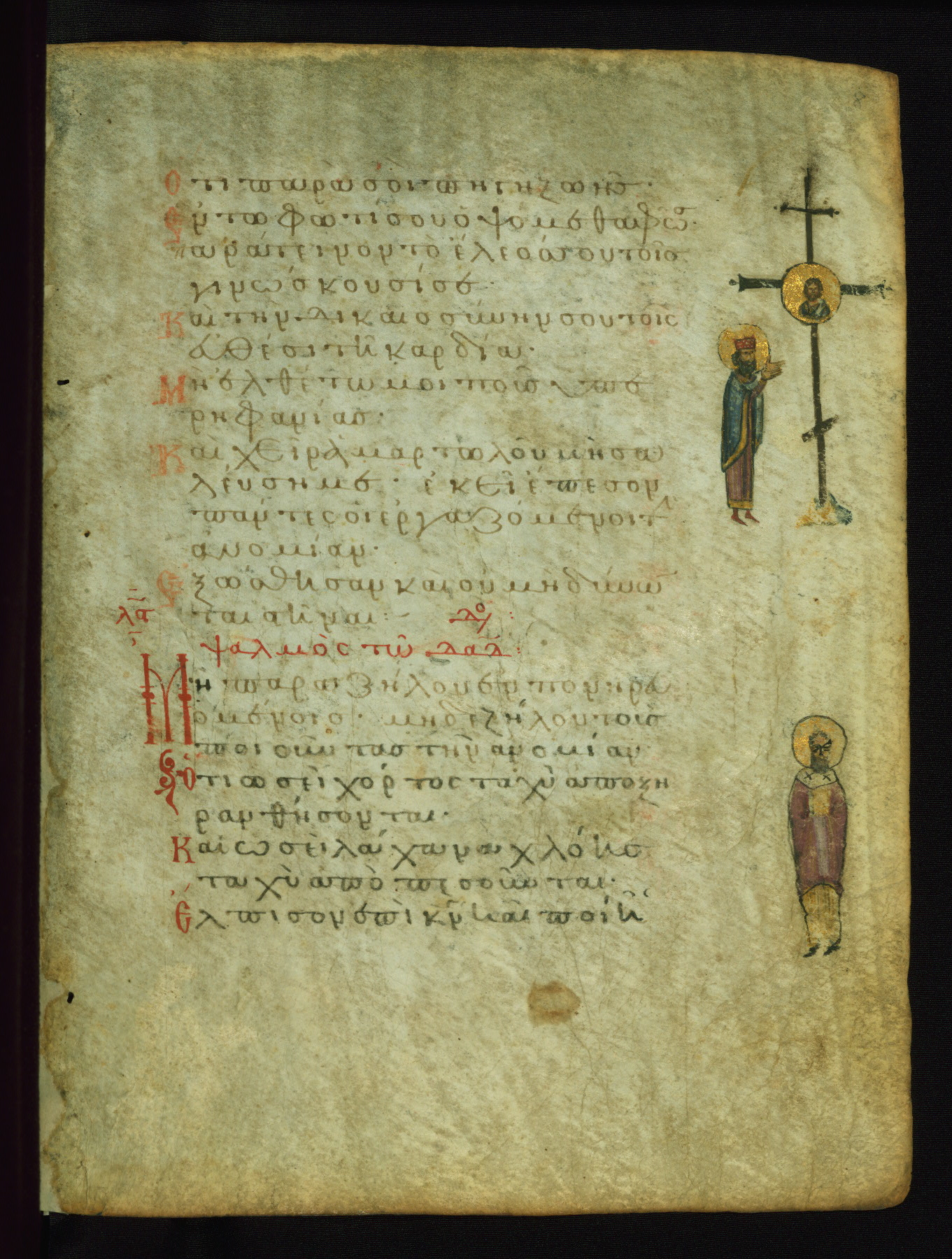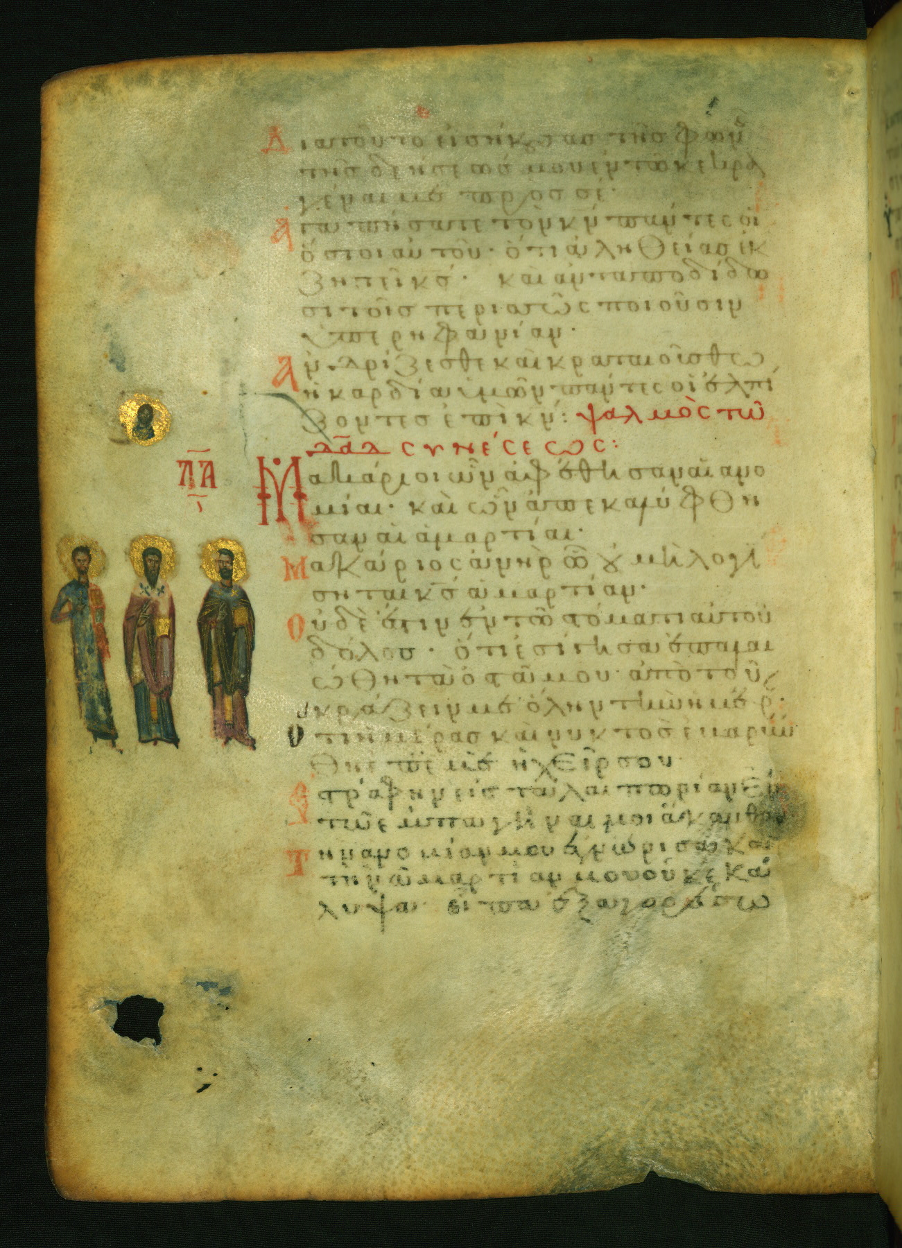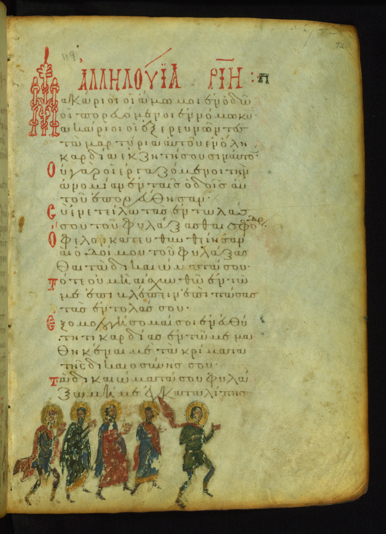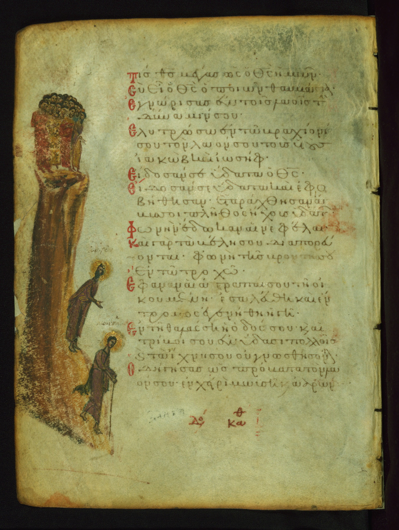 The three men in this miniature hold crosses that identify them as martyrs. These are probably the righteous mentioned in the first verse on this page: "Rejoice in the Lord, O you righteous..." (NETS).