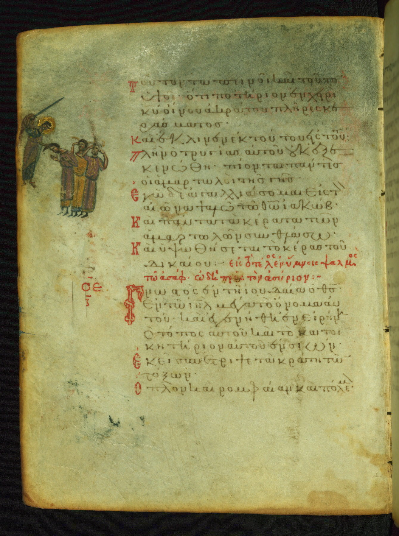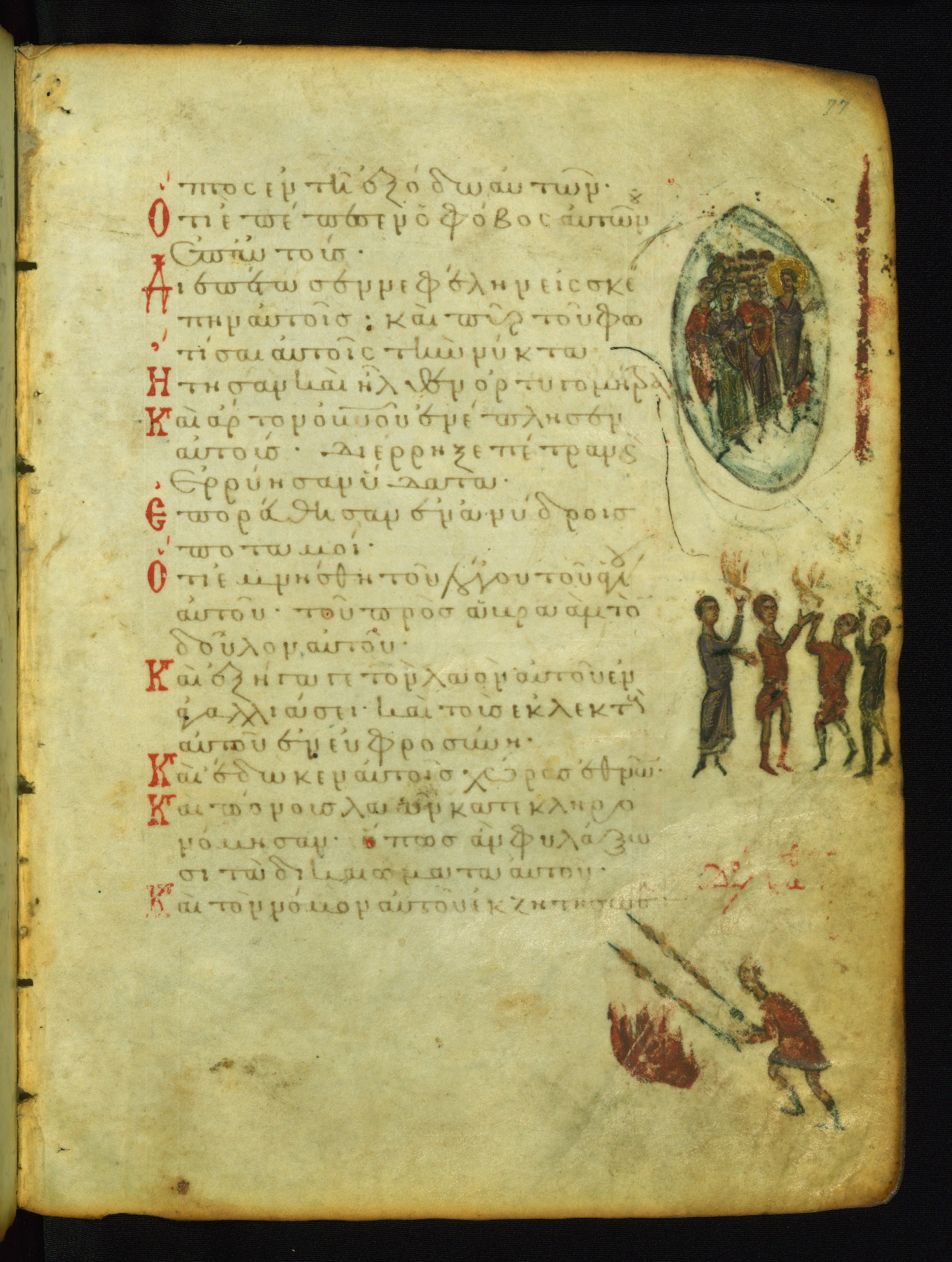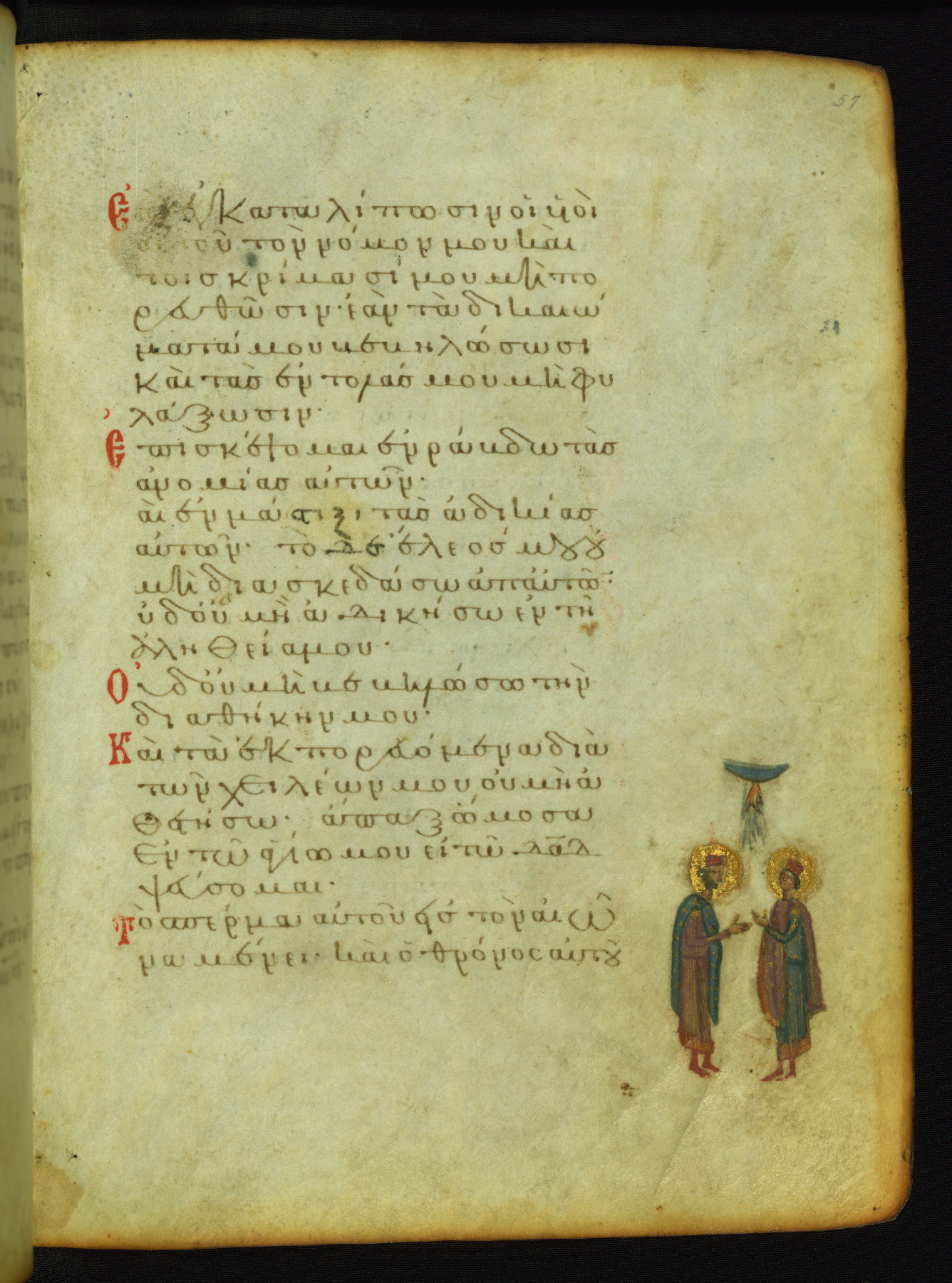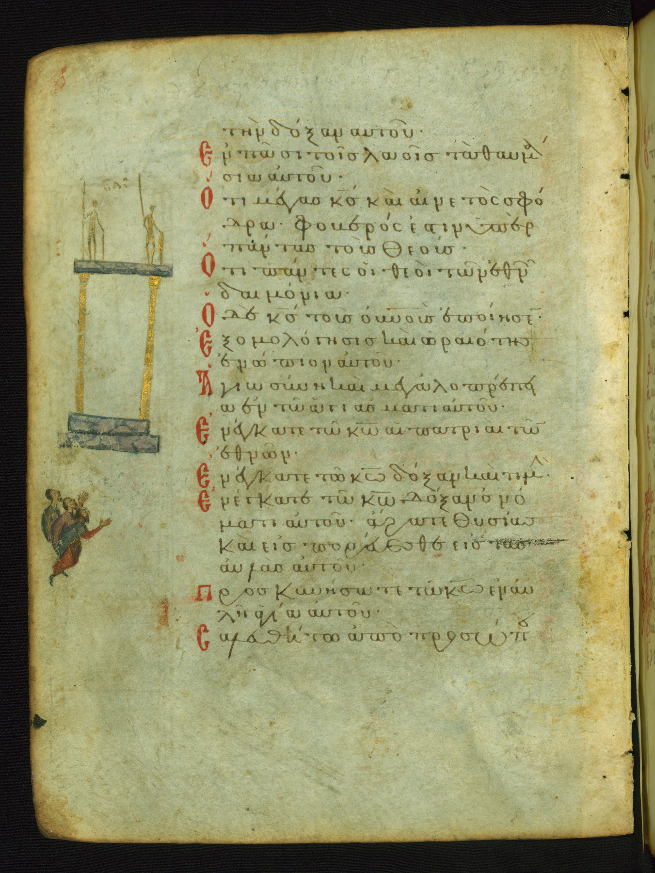 The three men in this miniature hold crosses that identify them as martyrs. These are probably the righteous mentioned in the first verse on this page: "Rejoice in the Lord, O you righteous..." (NETS).
