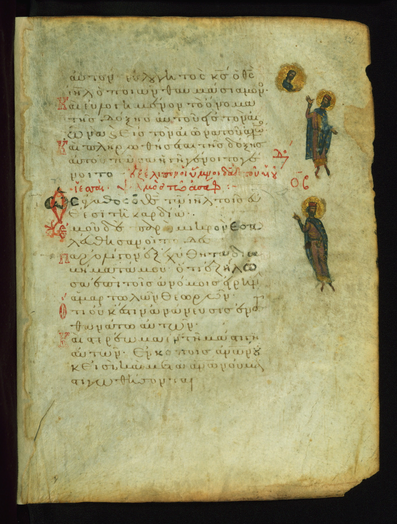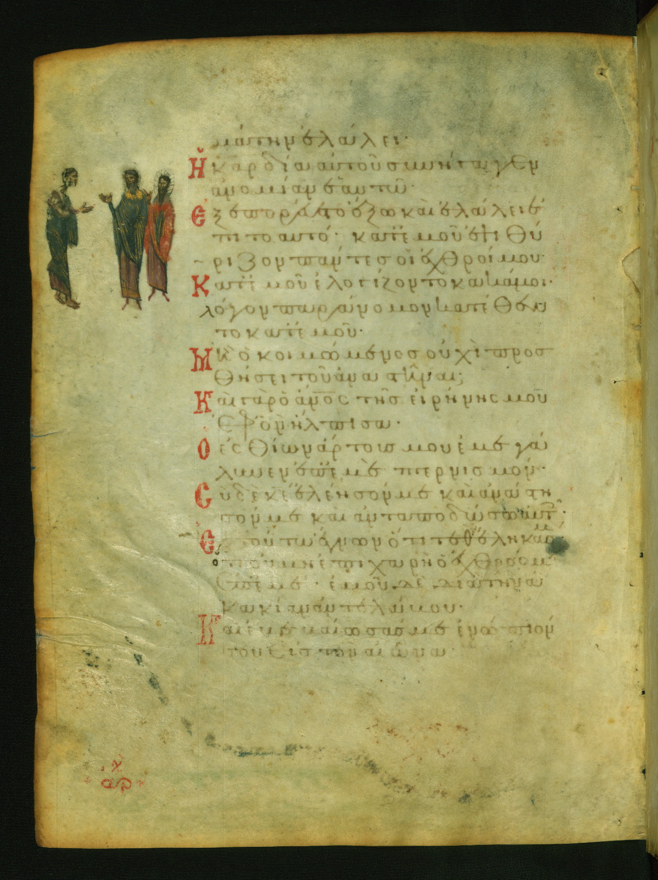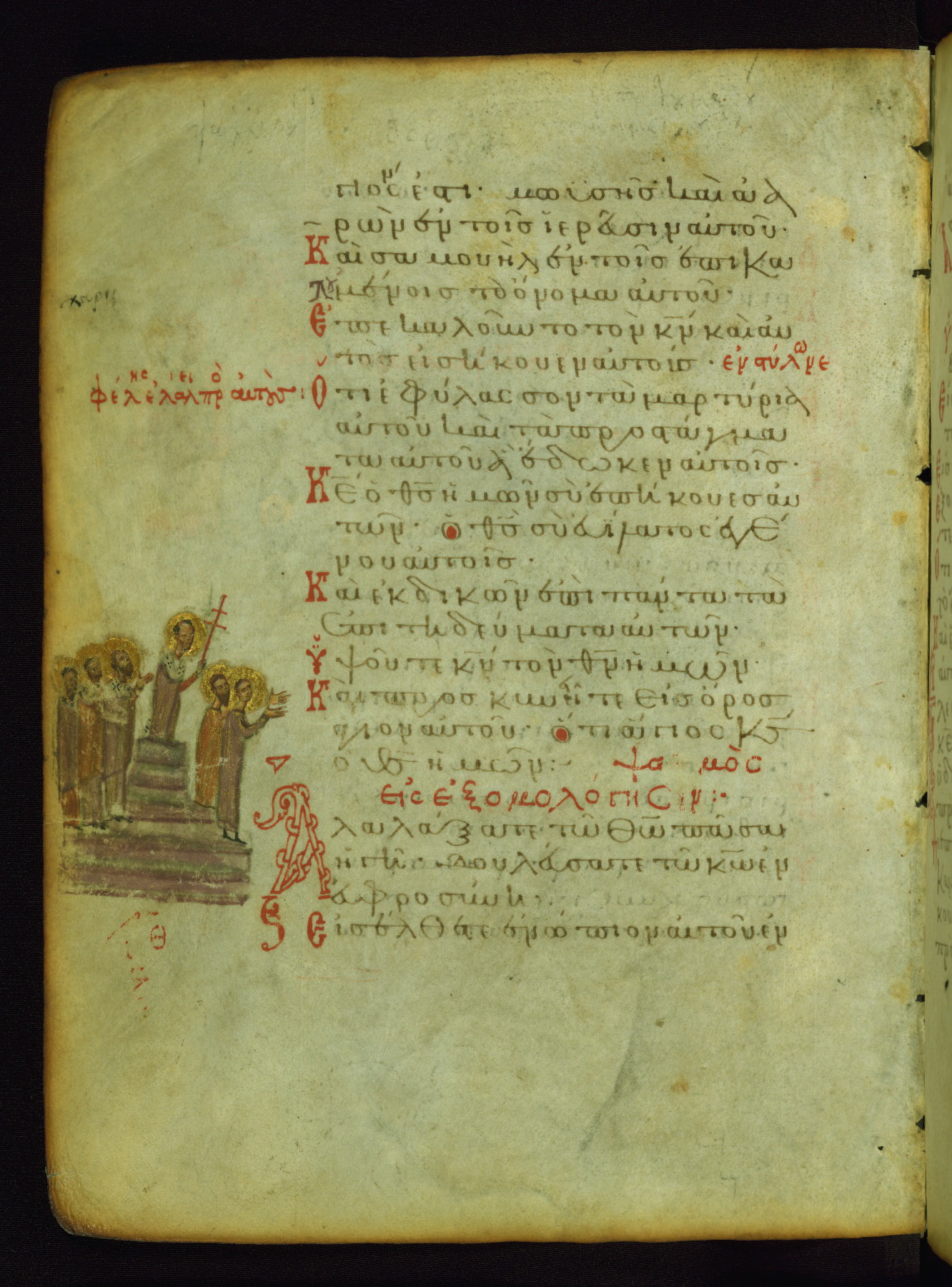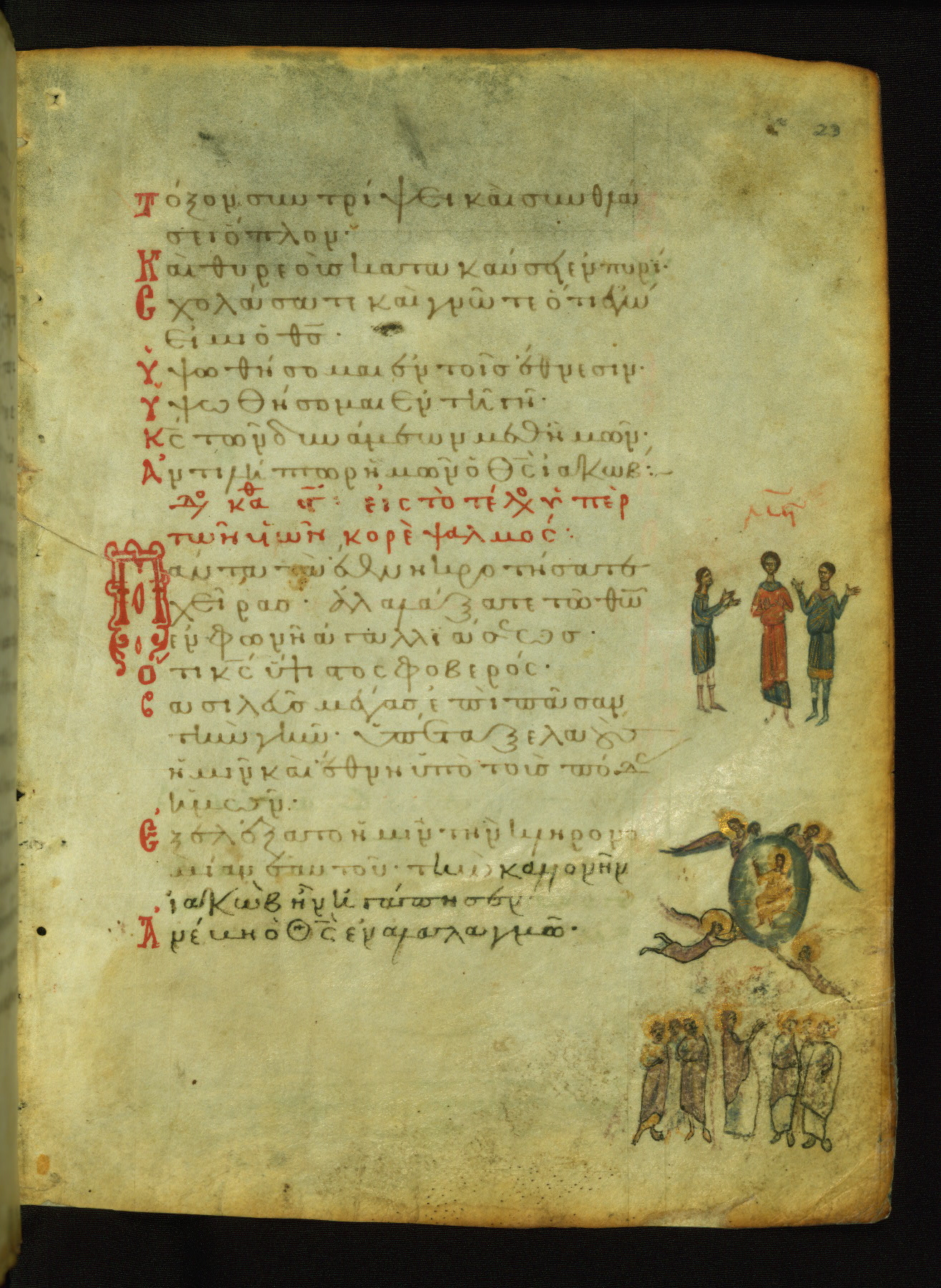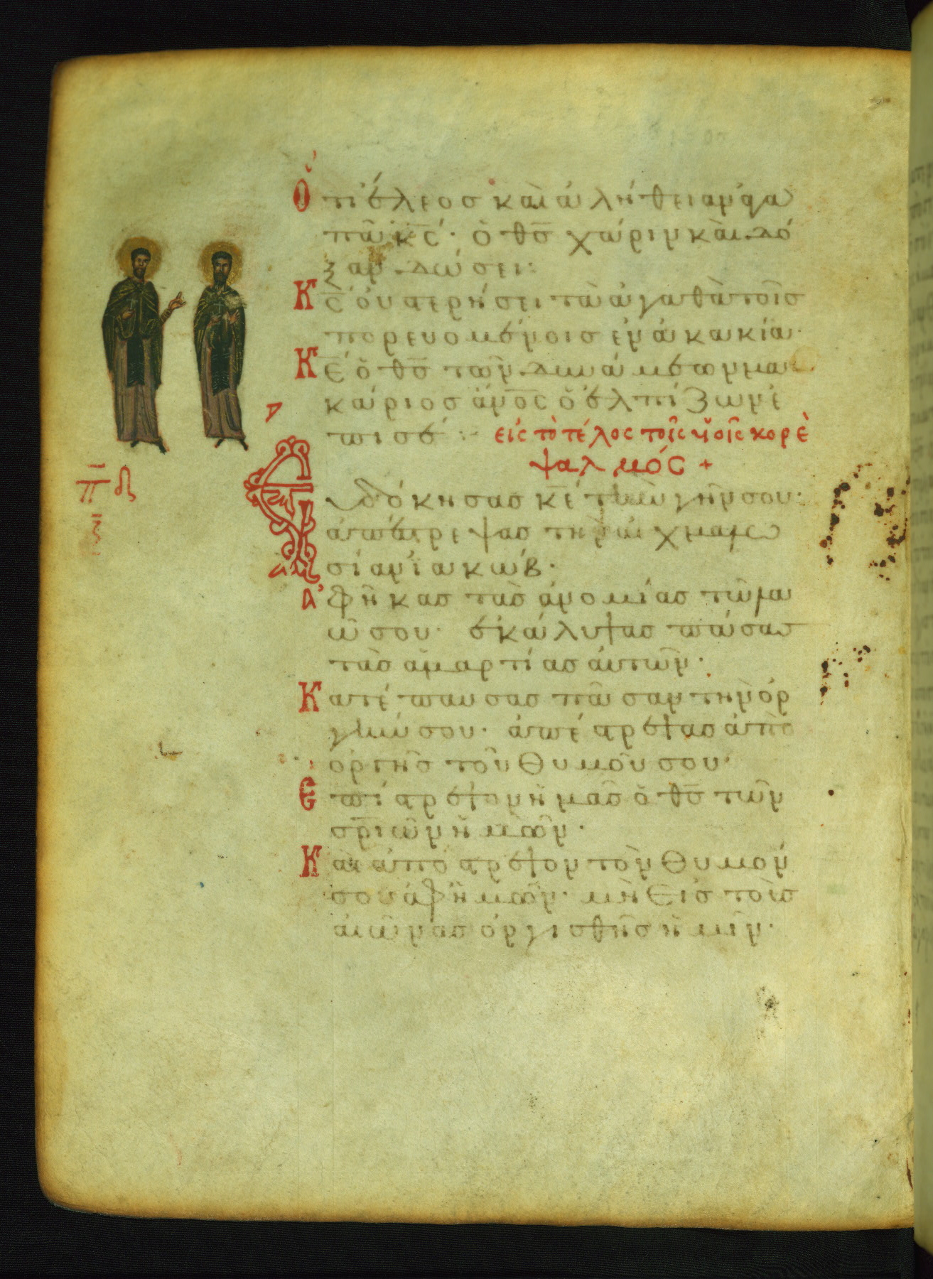 The three men in this miniature hold crosses that identify them as martyrs. These are probably the righteous mentioned in the first verse on this page: "Rejoice in the Lord, O you righteous..." (NETS).