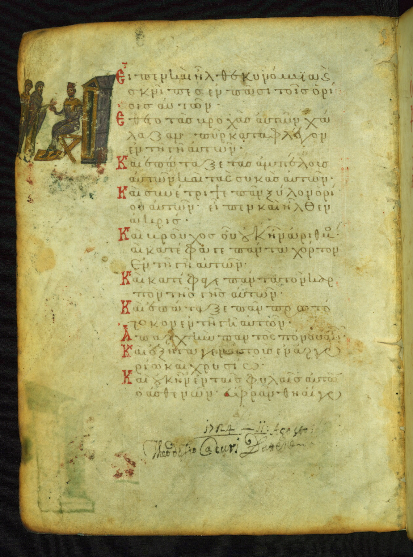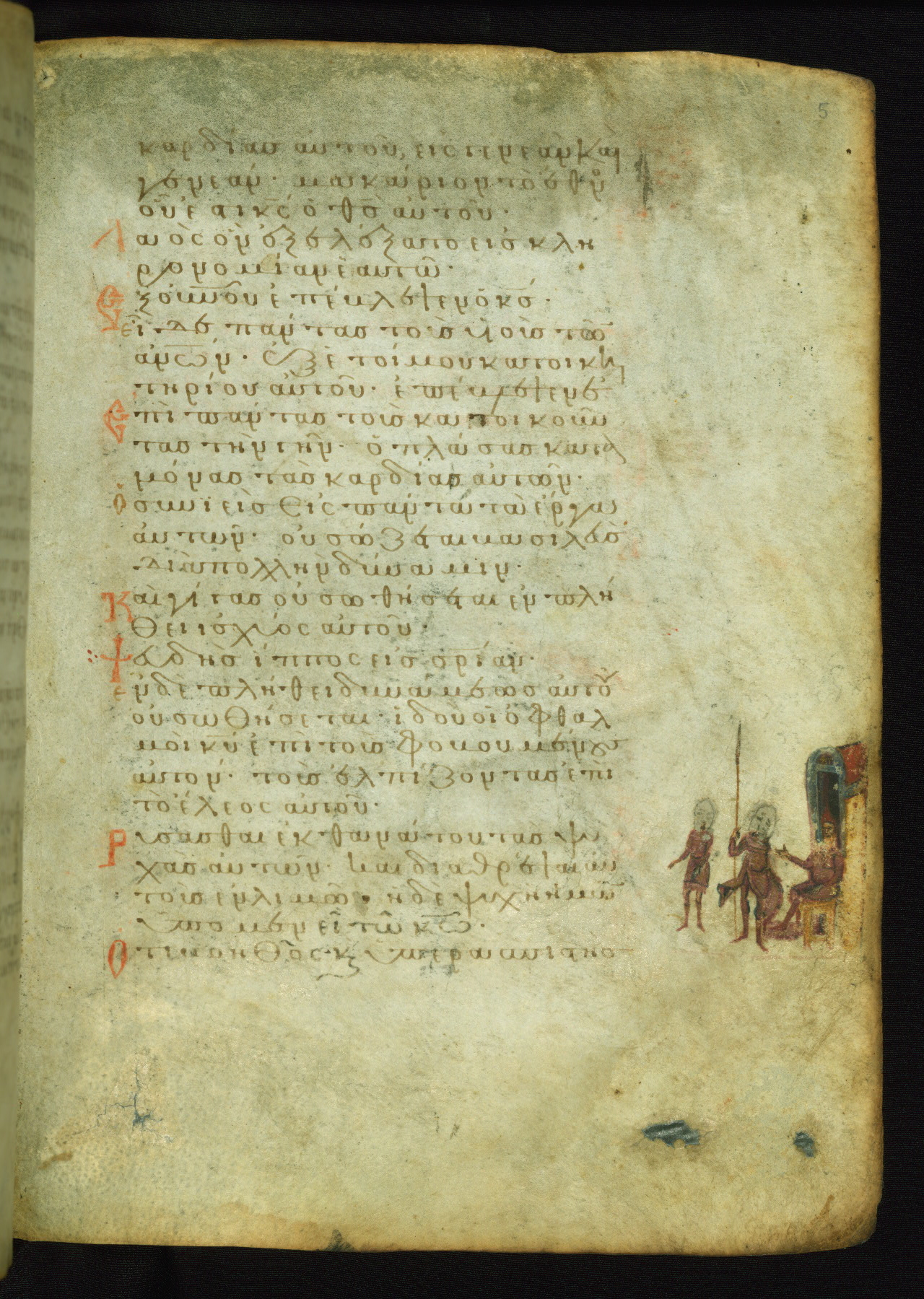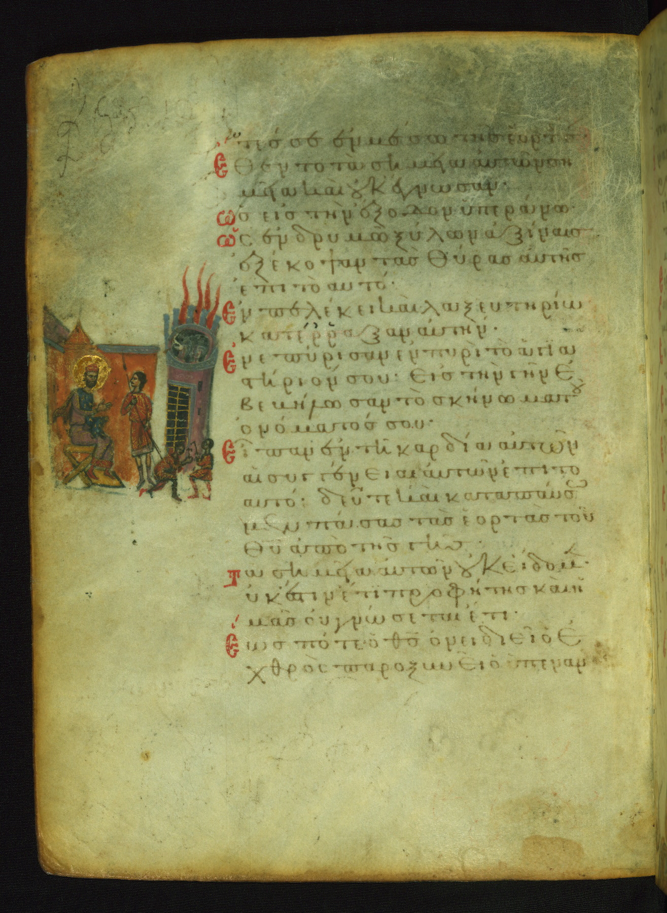 The meaning of this image becomes clear from a comparison with a Russian psalter (Saint Petersburg, National Library of Russia, Ms. OLDP F.6), where fol. 43r contains an identical scene with explanatory inscriptions: Potiphar is ordering a soldier to put Joseph into prison (Genesis 39:20). The verse illustrated (marked with three dots in the text) is "Look, the eyes of the Lord are on those who fear him, those who hope in his mercy" (NETS).