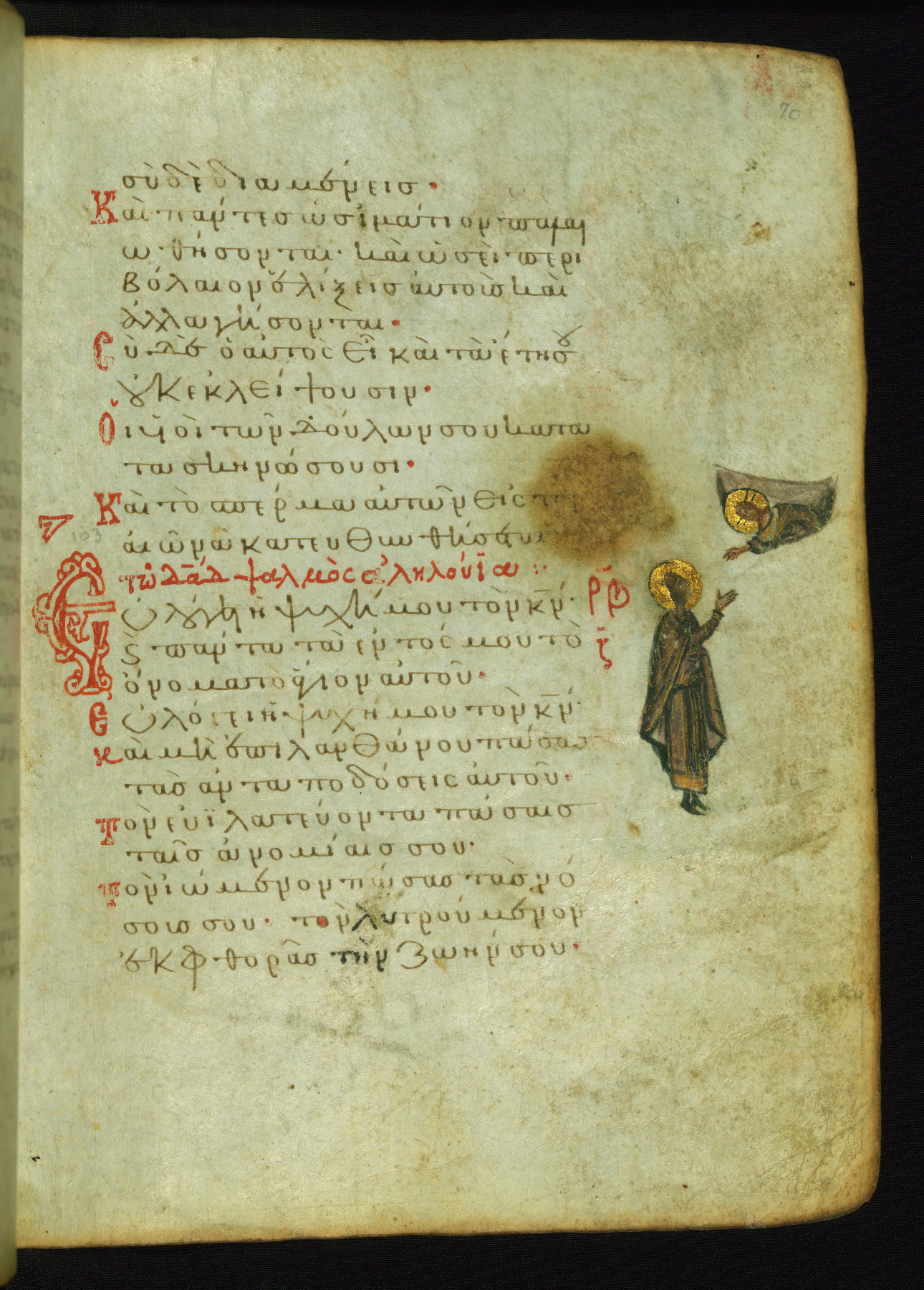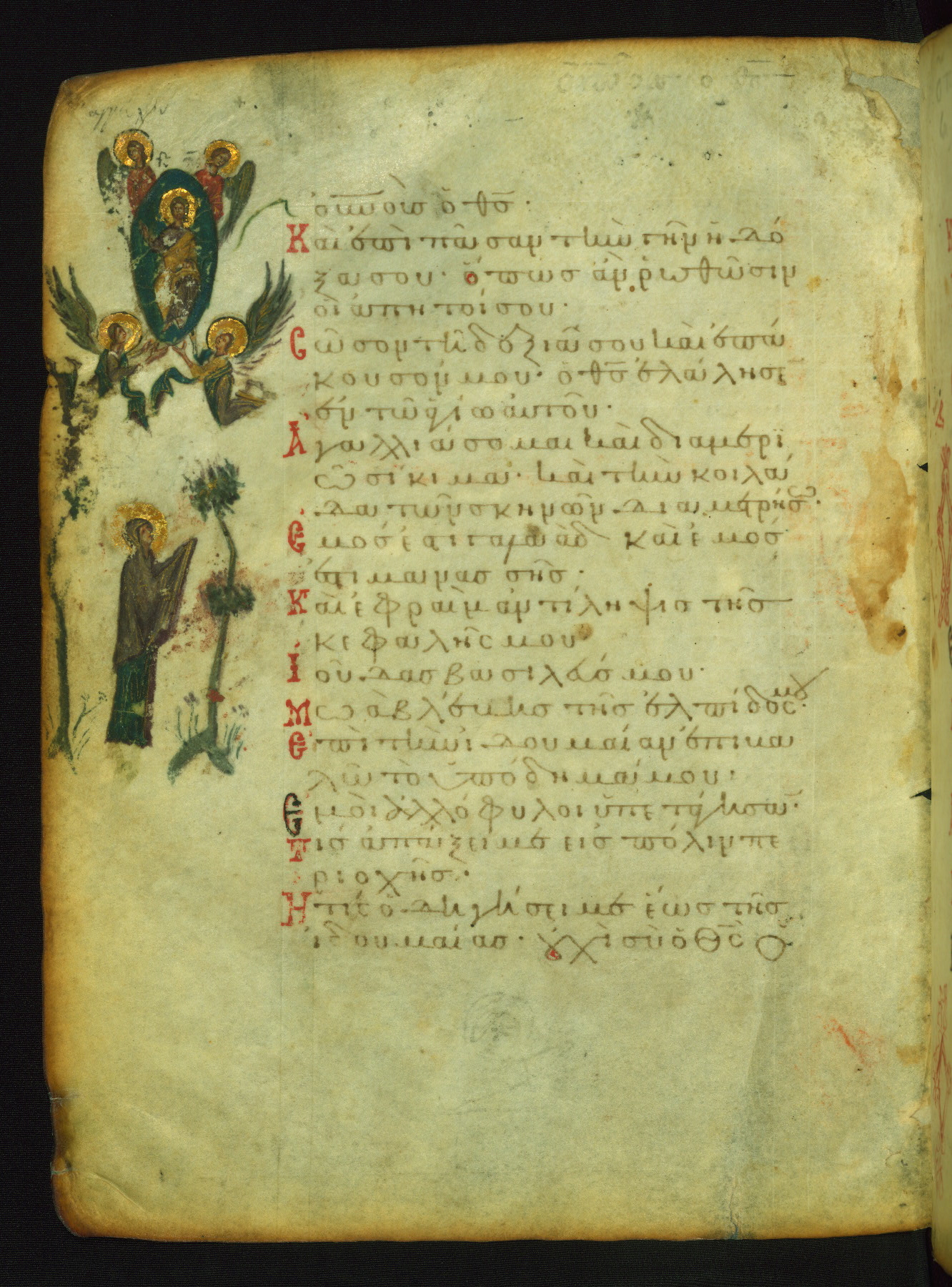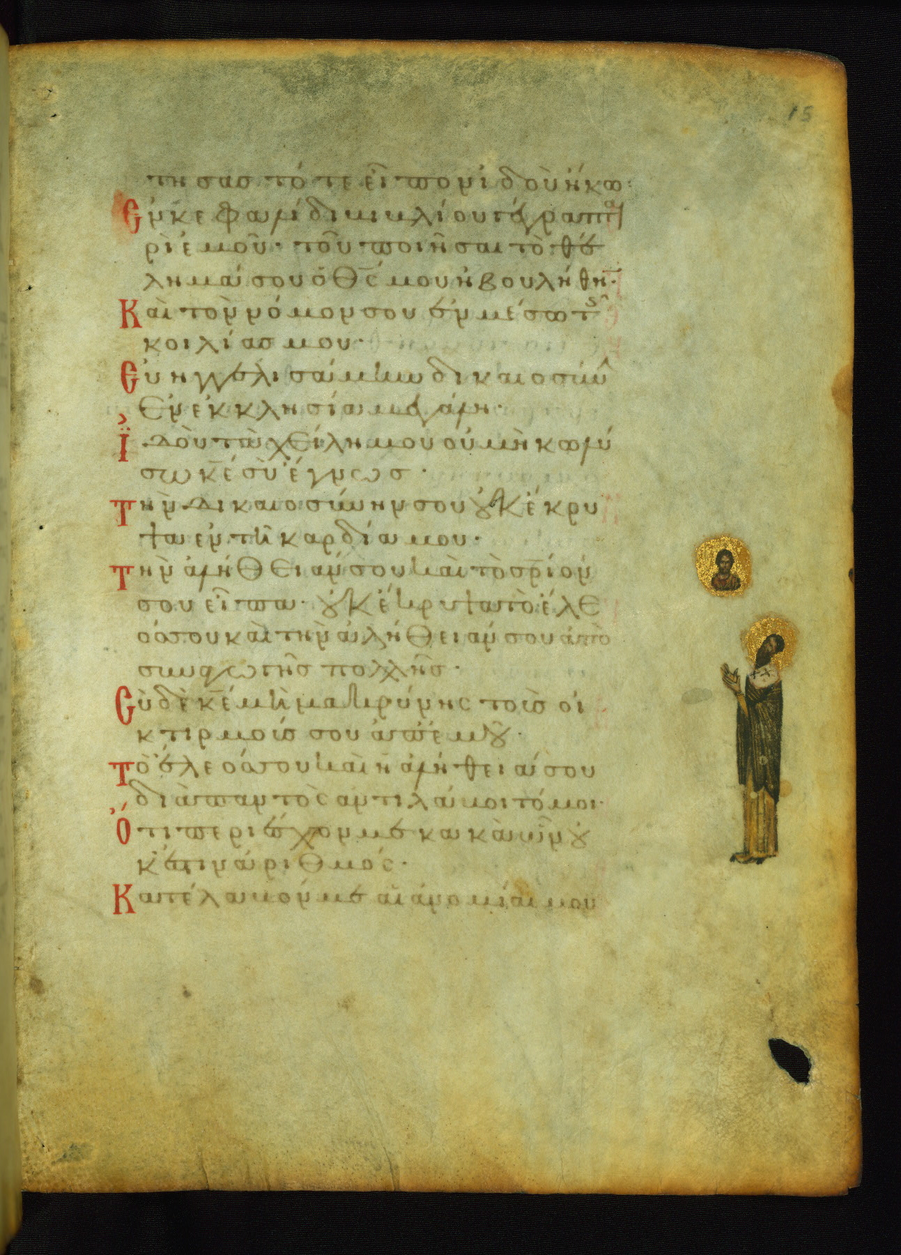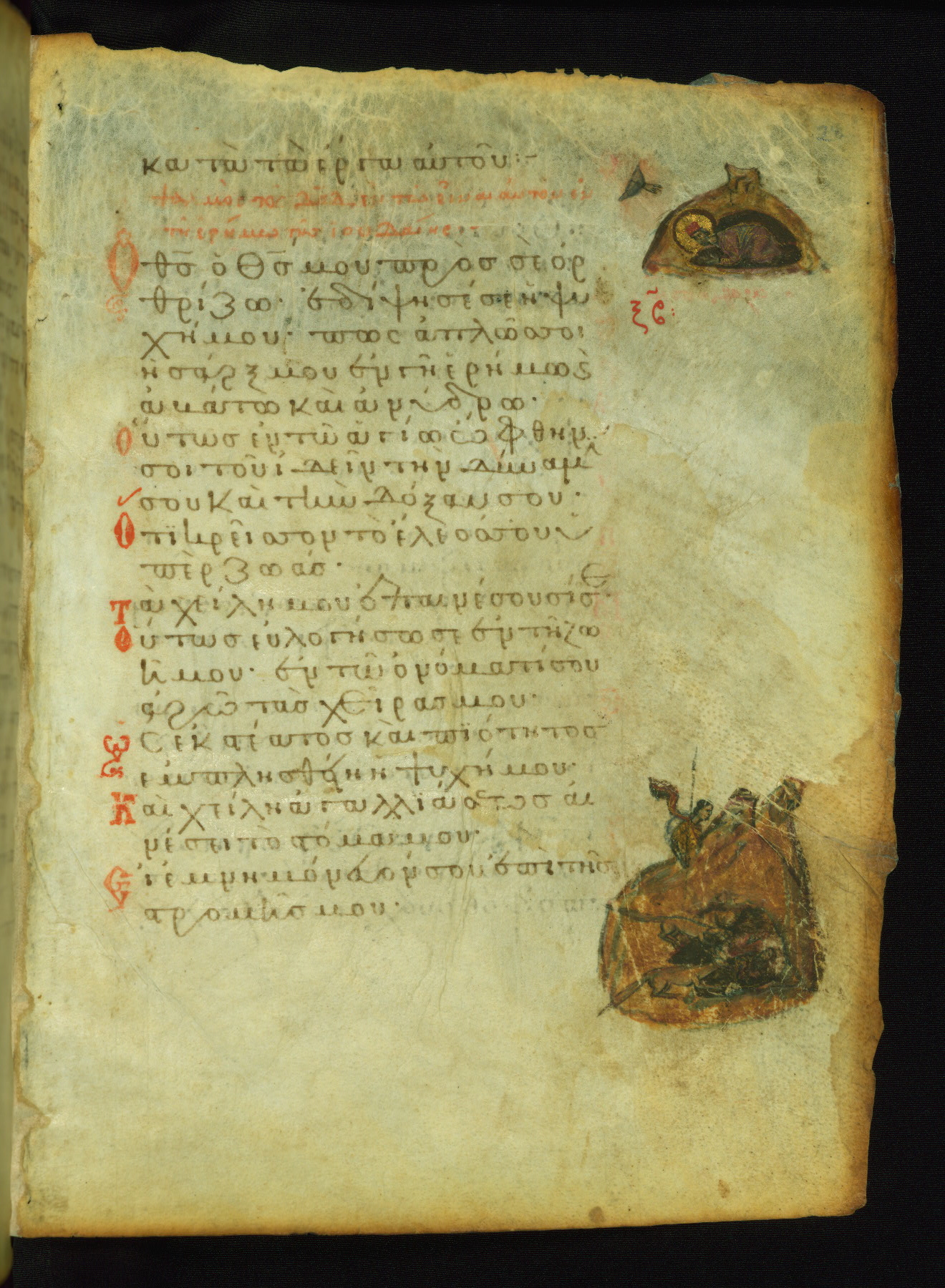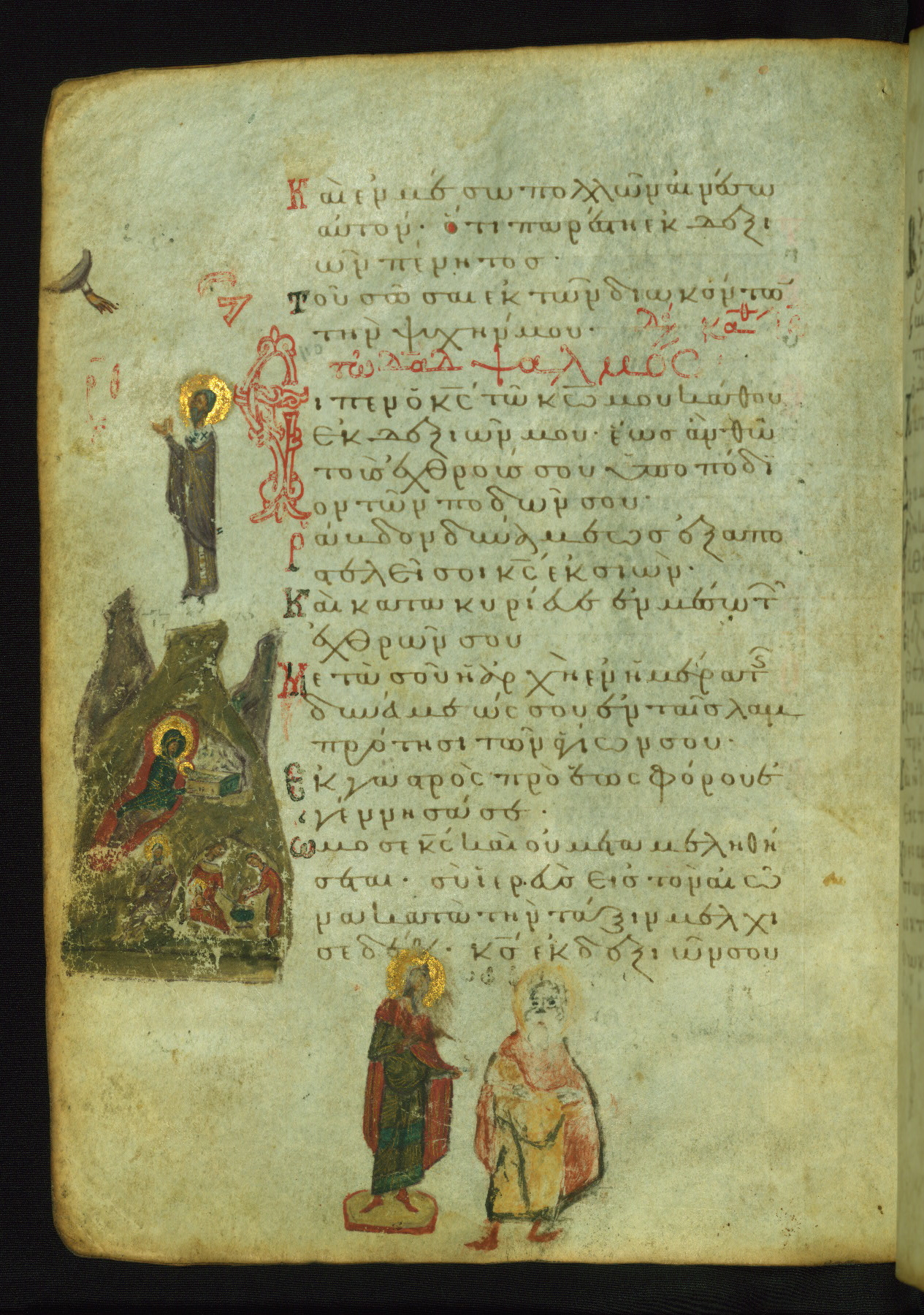 The lower of these two scenes illustrates the verse (marked with red dots) "But as for me, I hoped in the Lord; I will rejoice and be glad in your mercy, because you looked upon my humiliation." A saint clad in bishop's garments in shown raising his hands in prayer toward Christ. The medallion in which God is portrayed symbolically represents Heaven. A similar scene is repeated above, possibly with reference to the verse "so that my glory may make music to you" (NETS).