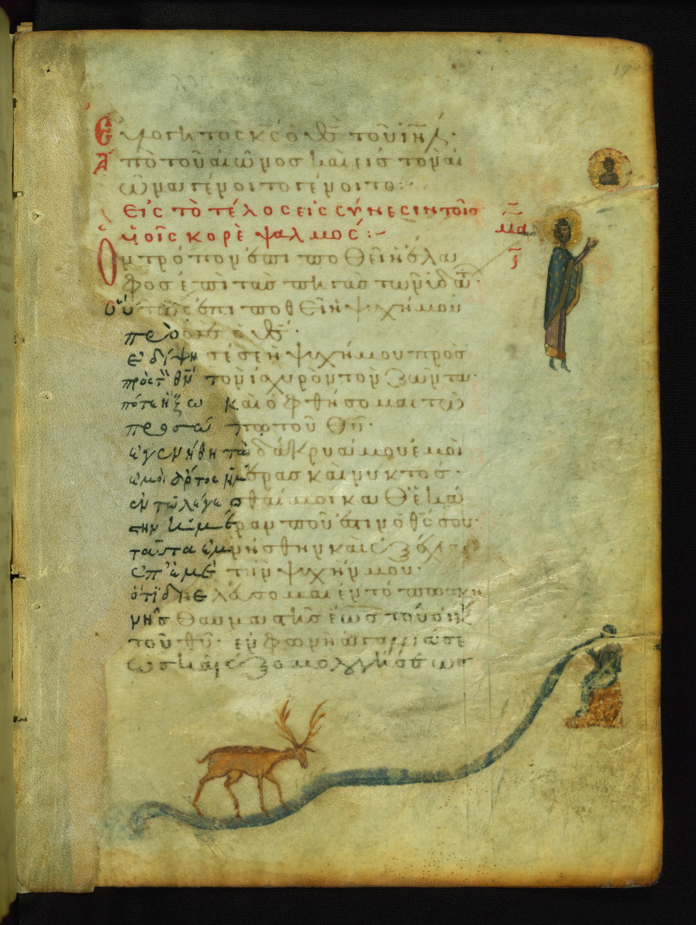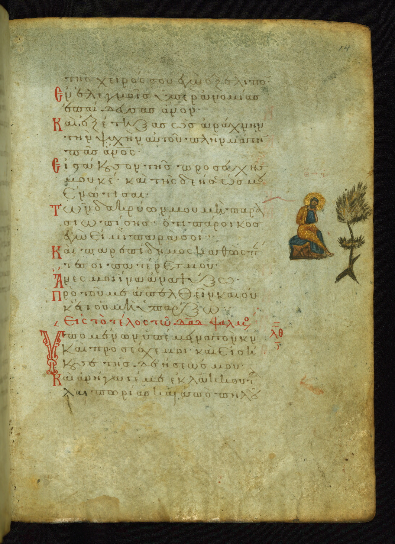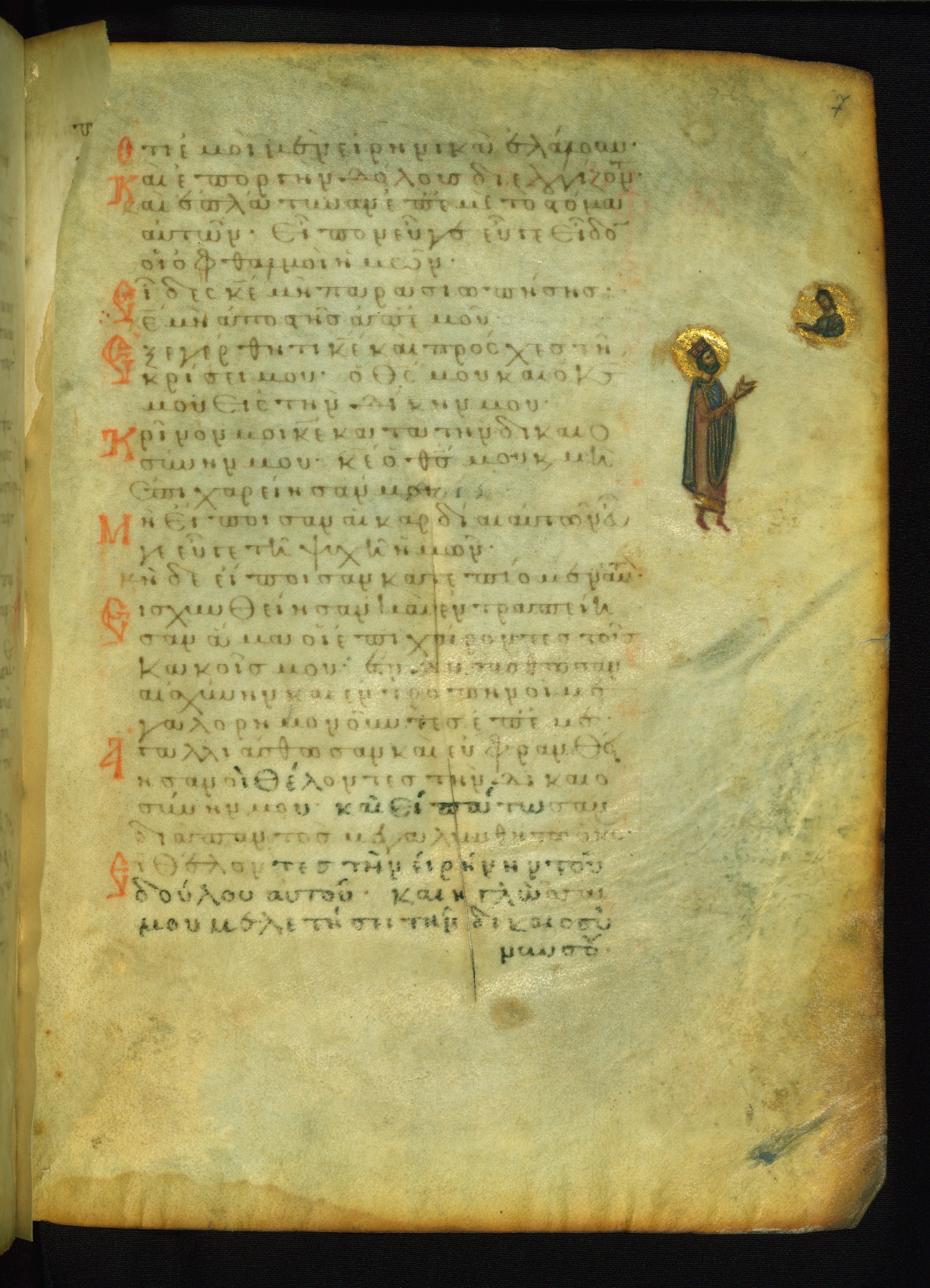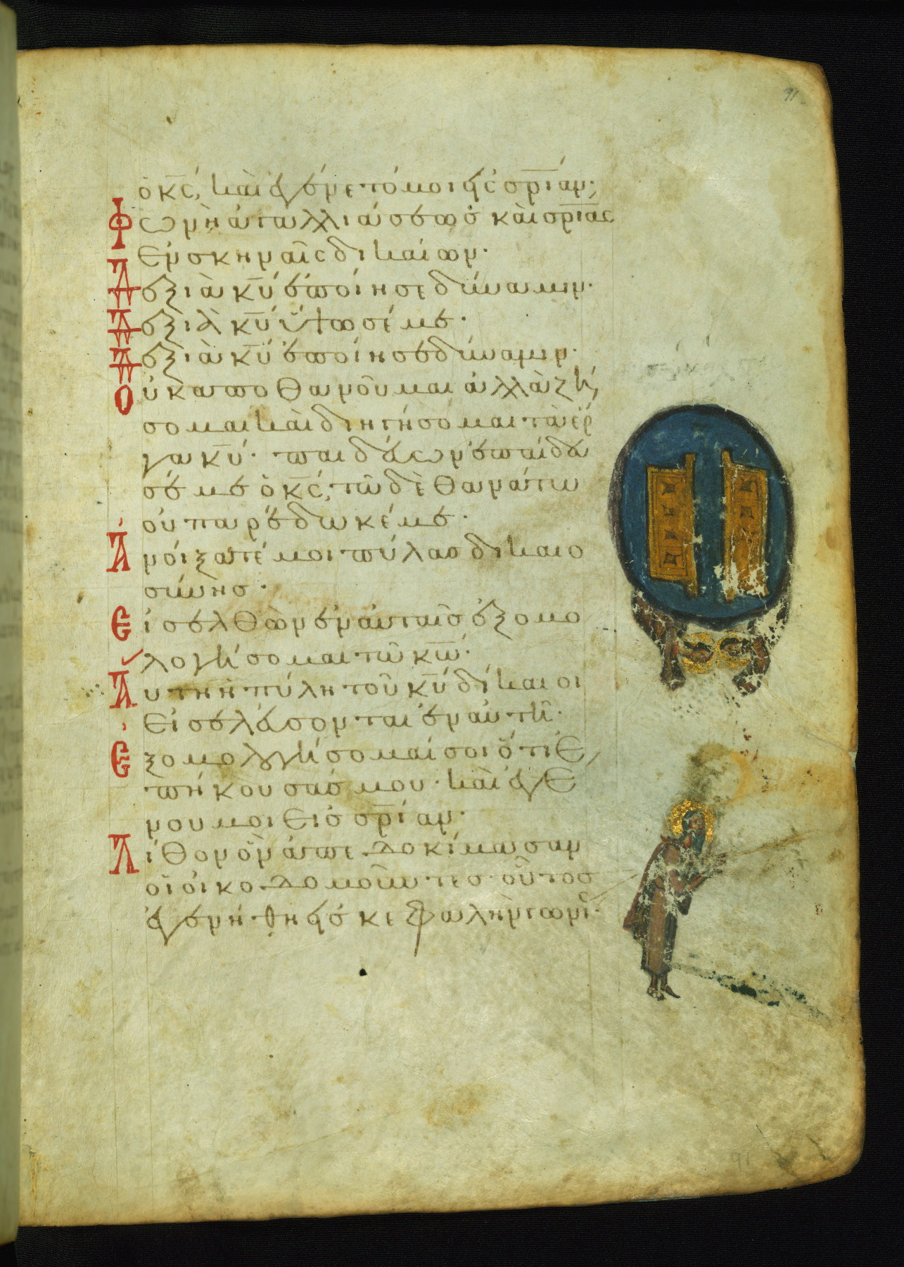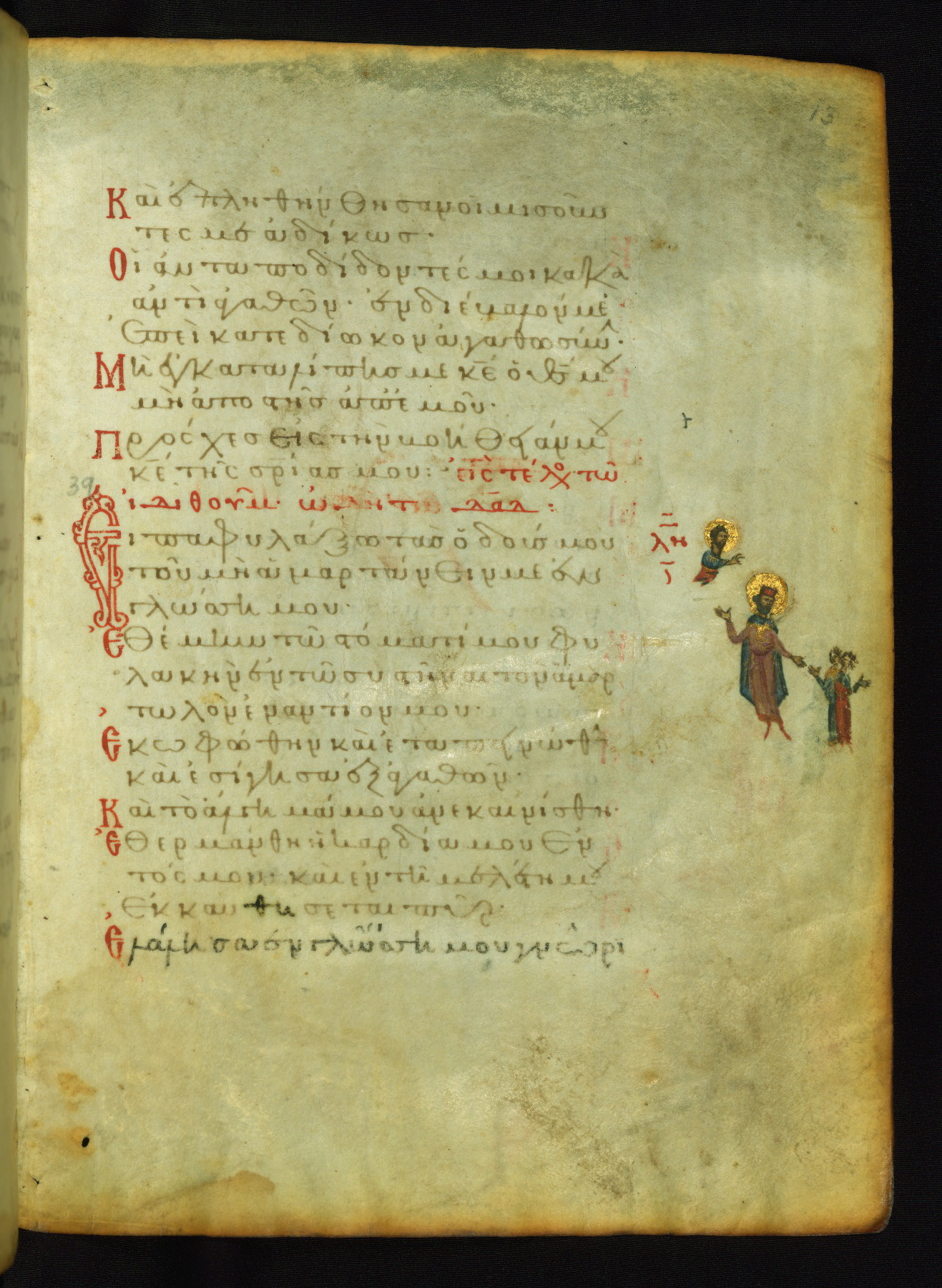 The lower of these two scenes illustrates the verse (marked with red dots) "But as for me, I hoped in the Lord; I will rejoice and be glad in your mercy, because you looked upon my humiliation." A saint clad in bishop's garments in shown raising his hands in prayer toward Christ. The medallion in which God is portrayed symbolically represents Heaven. A similar scene is repeated above, possibly with reference to the verse "so that my glory may make music to you" (NETS).