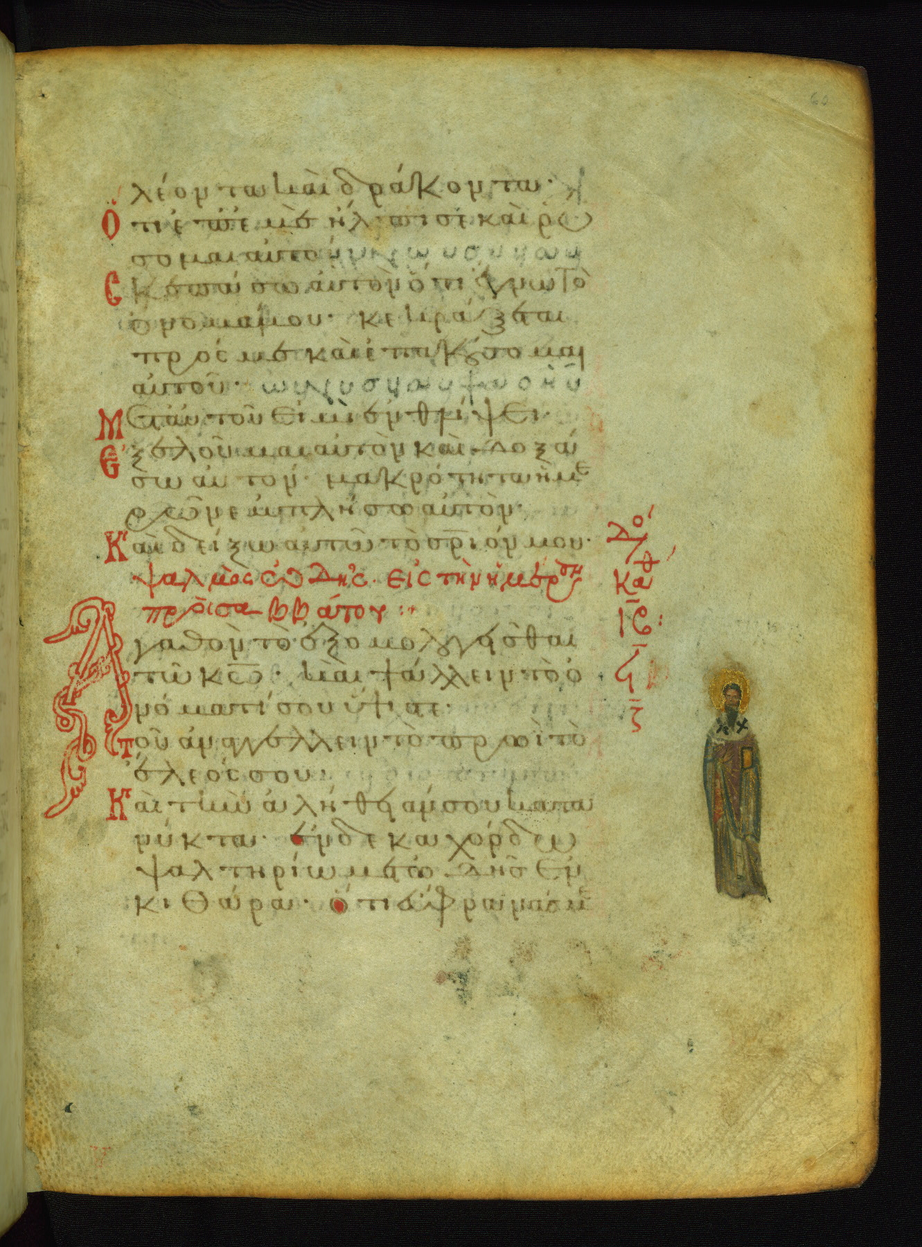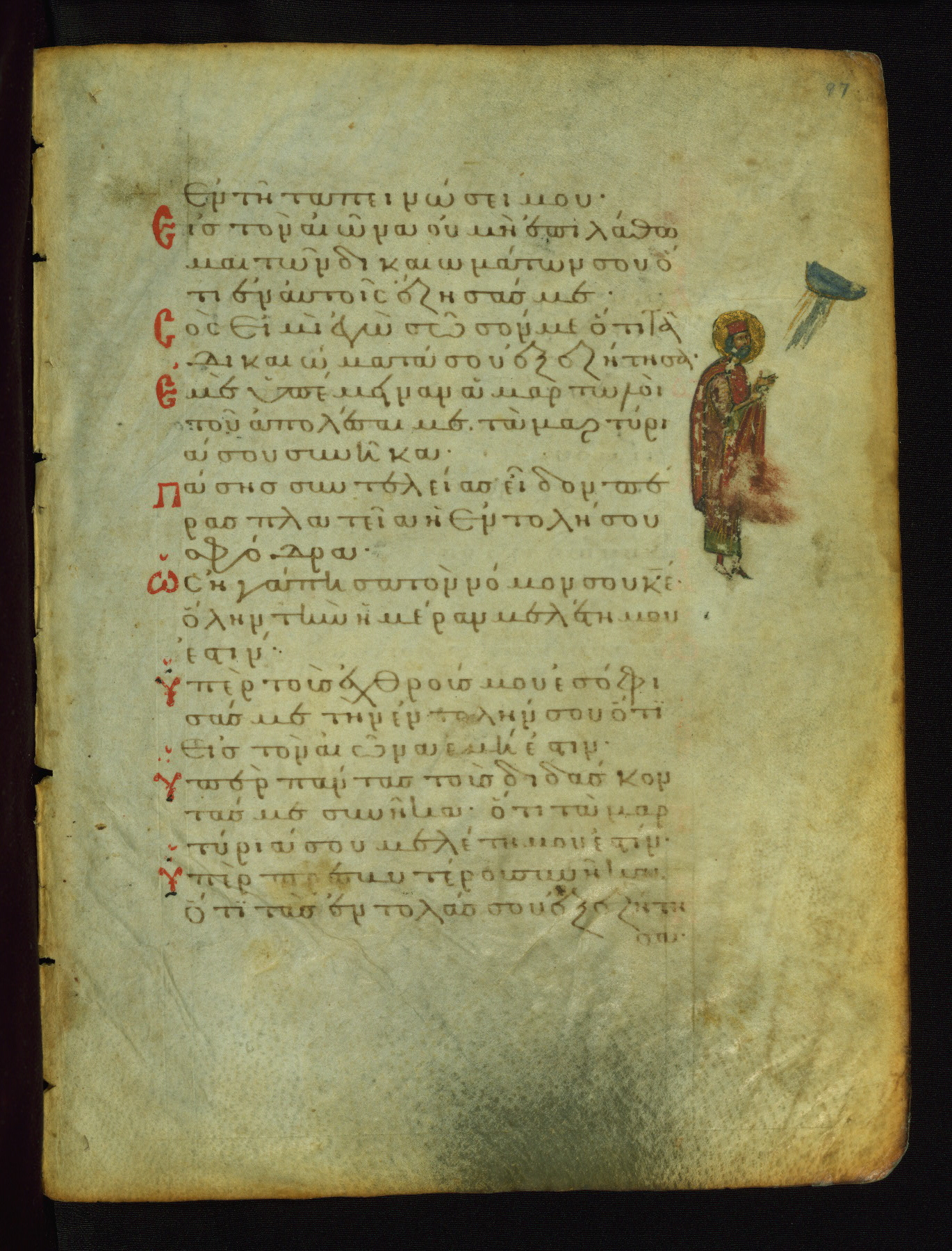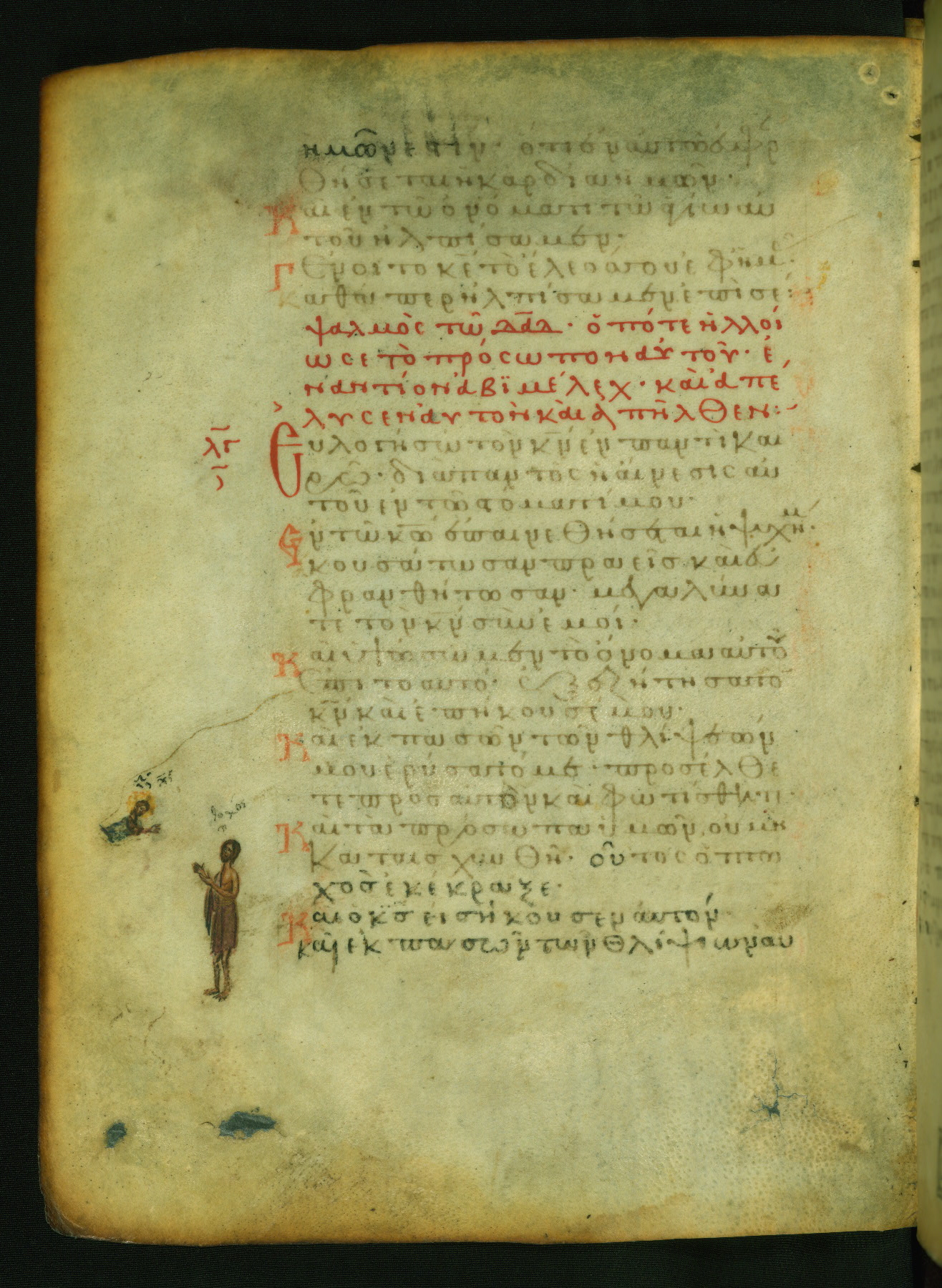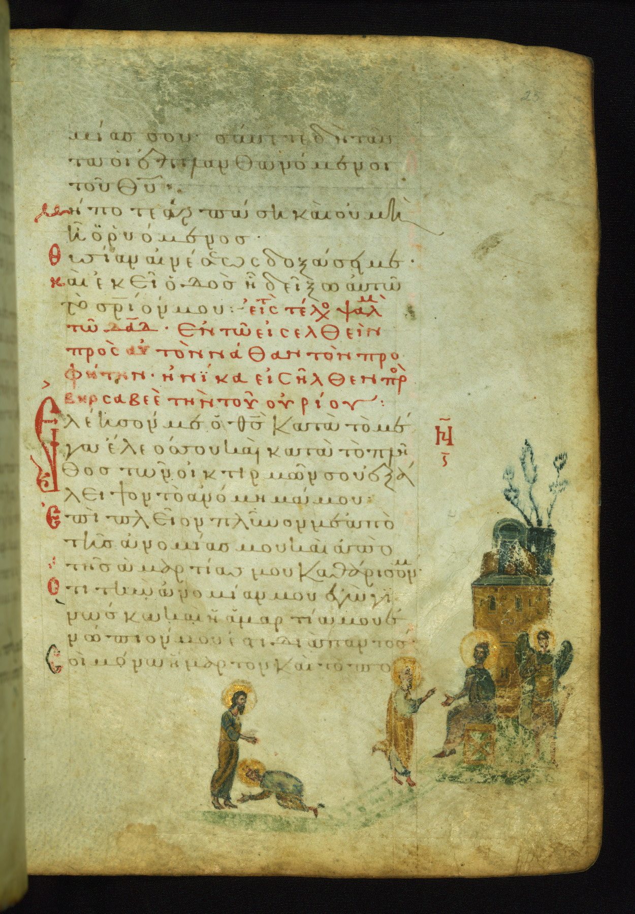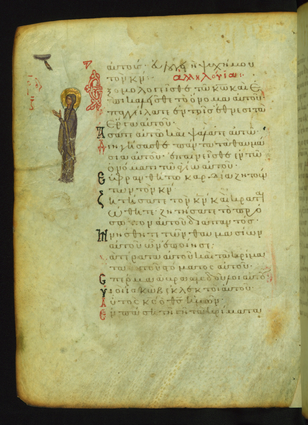 The lower of these two scenes illustrates the verse (marked with red dots) "But as for me, I hoped in the Lord; I will rejoice and be glad in your mercy, because you looked upon my humiliation." A saint clad in bishop's garments in shown raising his hands in prayer toward Christ. The medallion in which God is portrayed symbolically represents Heaven. A similar scene is repeated above, possibly with reference to the verse "so that my glory may make music to you" (NETS).