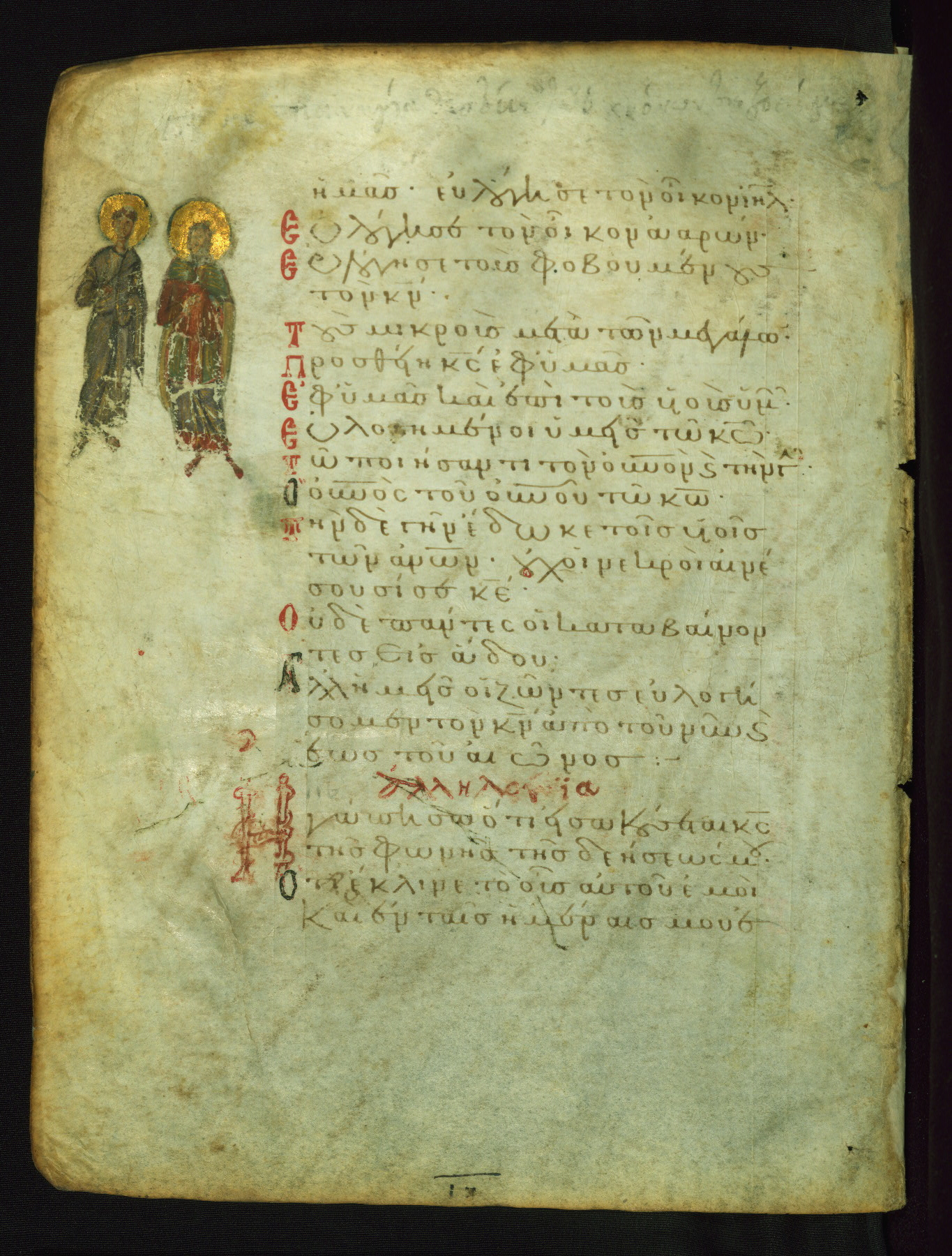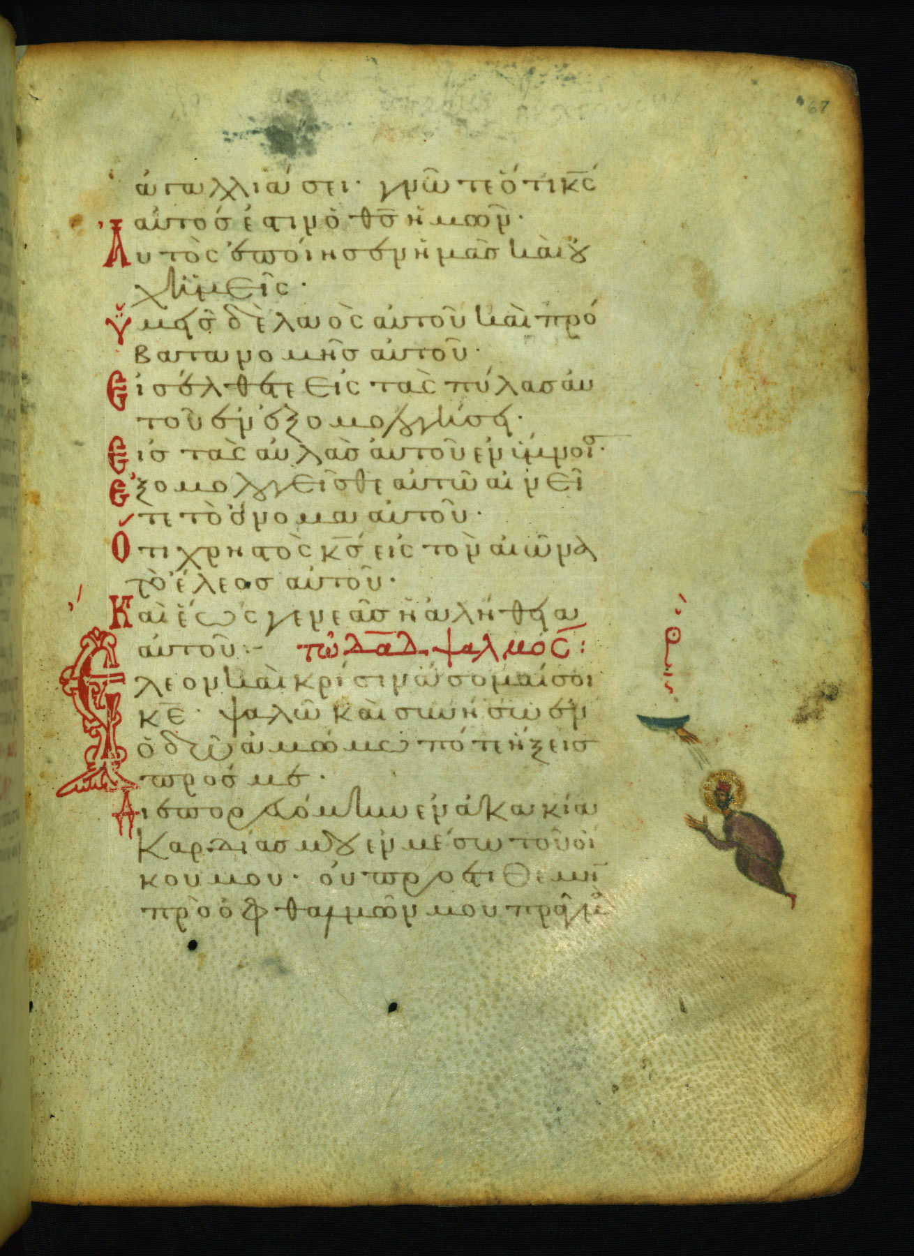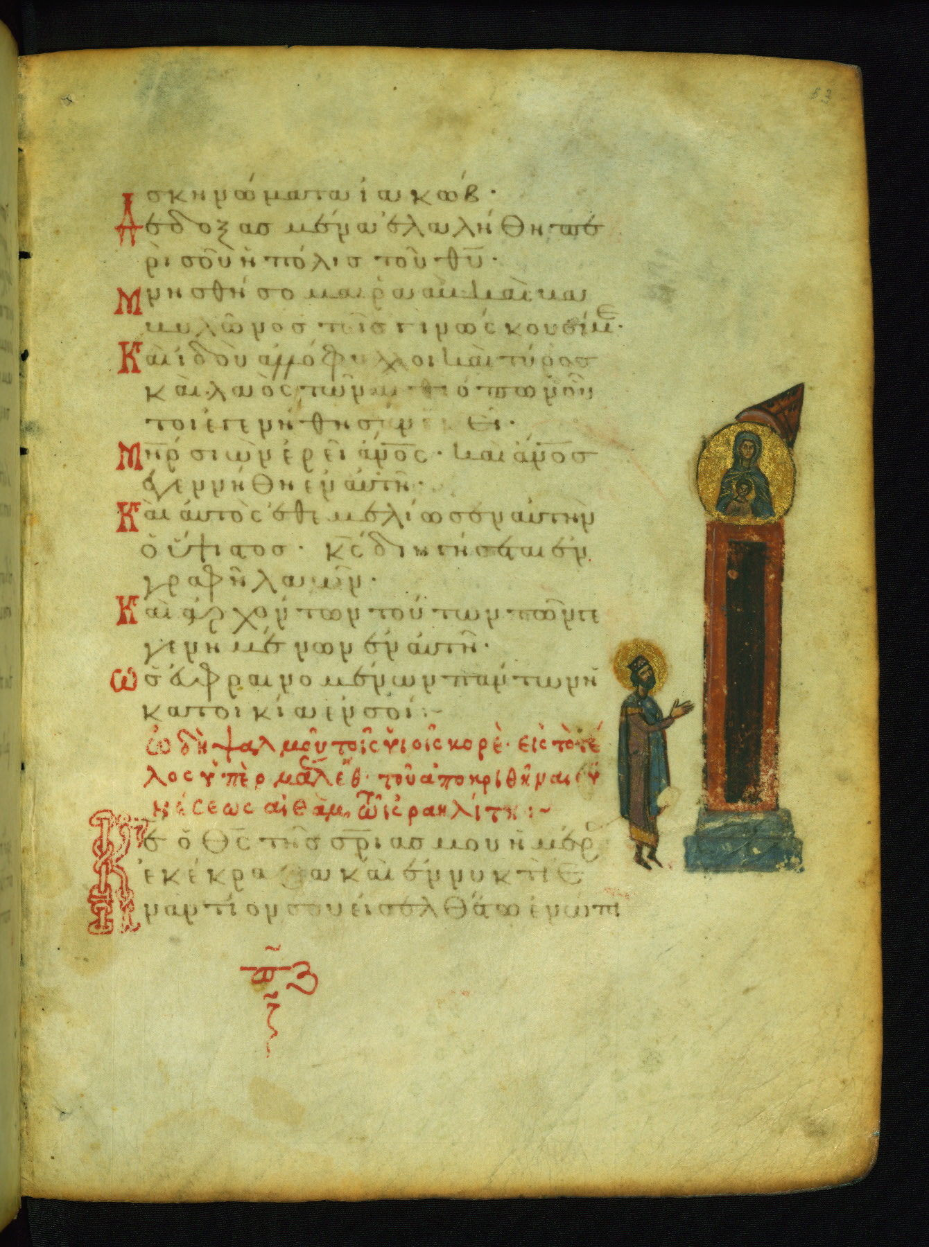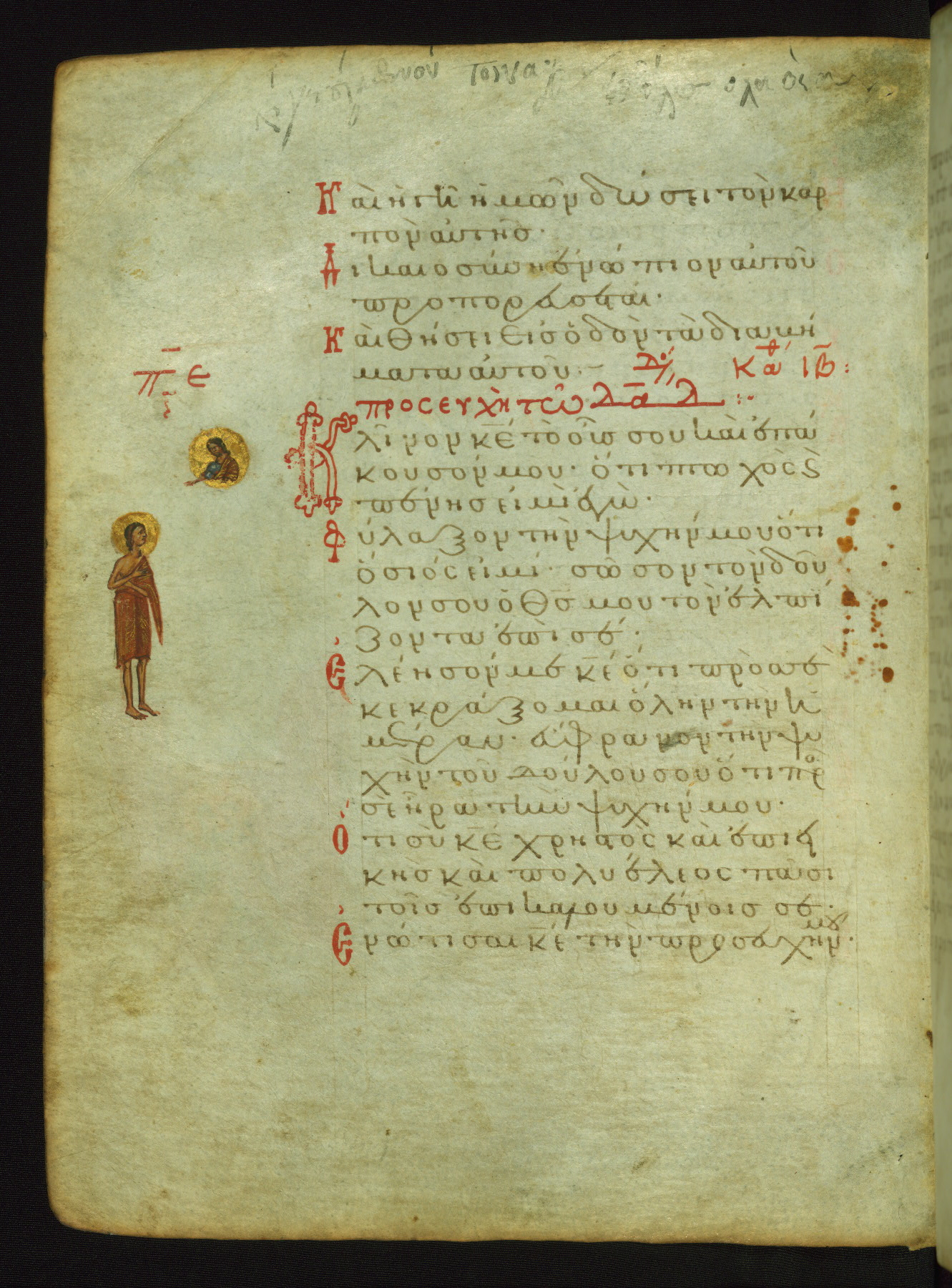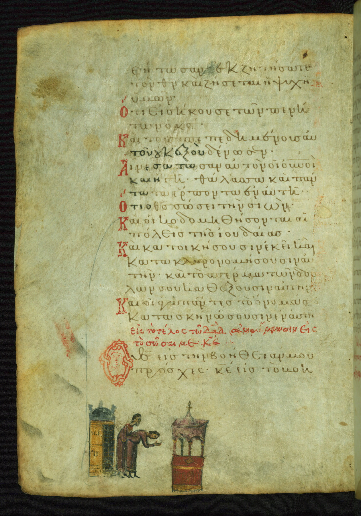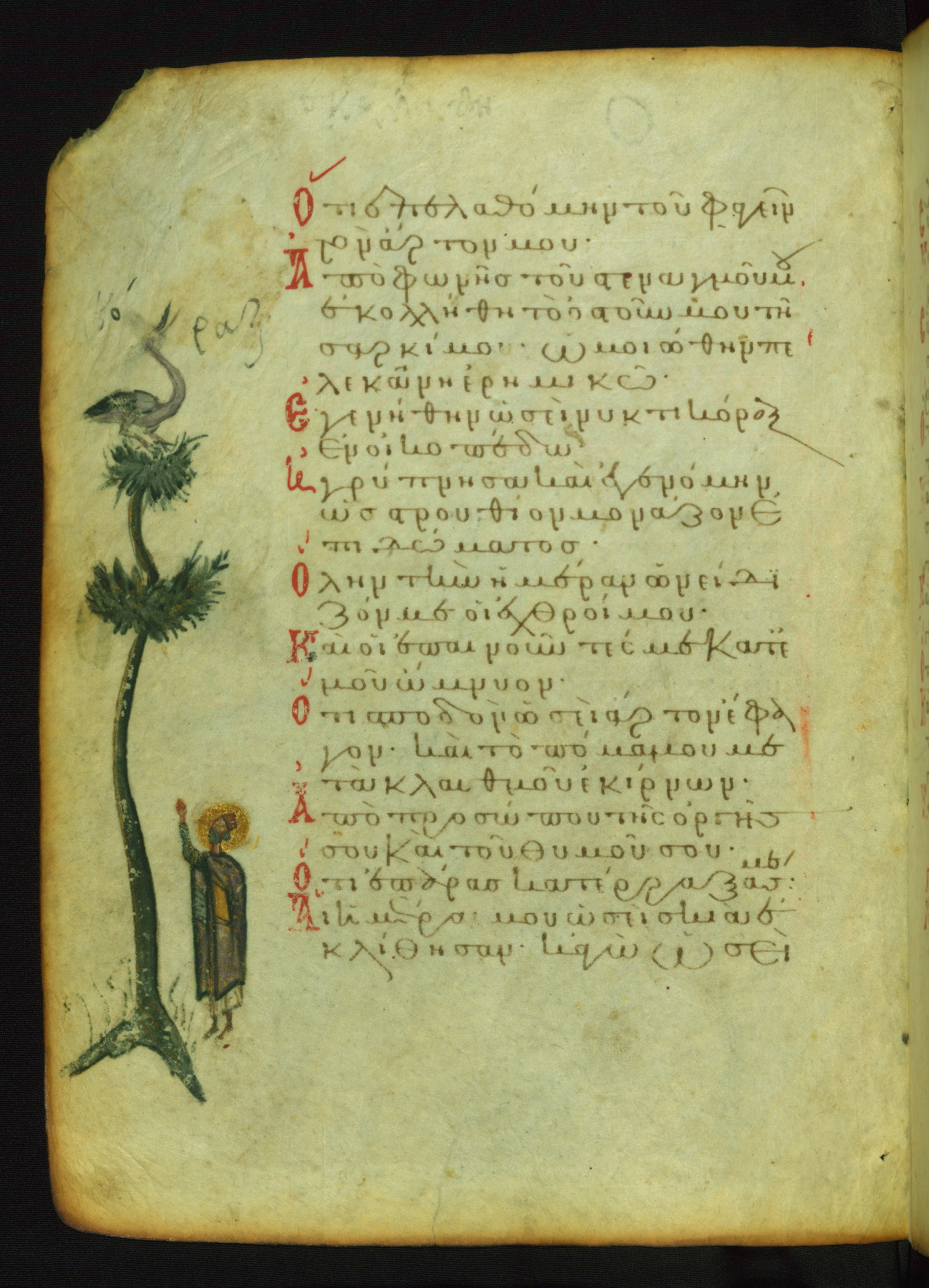 The lower of these two scenes illustrates the verse (marked with red dots) "But as for me, I hoped in the Lord; I will rejoice and be glad in your mercy, because you looked upon my humiliation." A saint clad in bishop's garments in shown raising his hands in prayer toward Christ. The medallion in which God is portrayed symbolically represents Heaven. A similar scene is repeated above, possibly with reference to the verse "so that my glory may make music to you" (NETS).