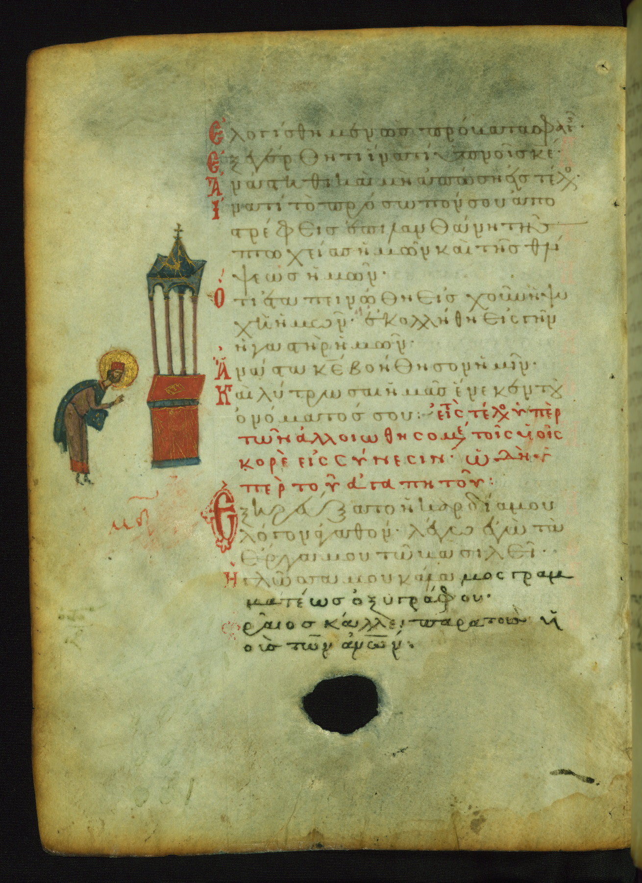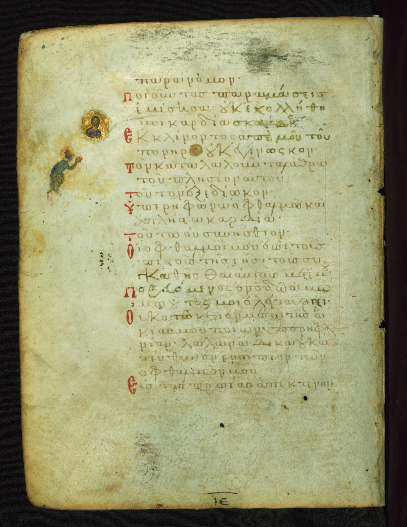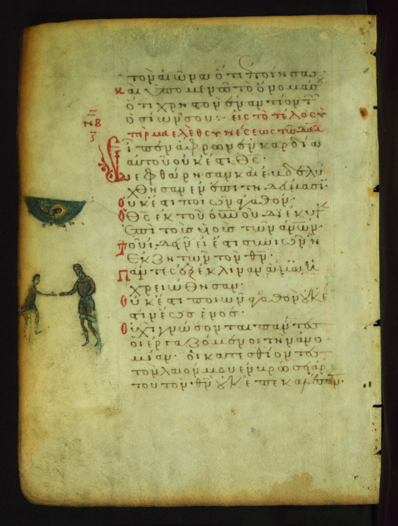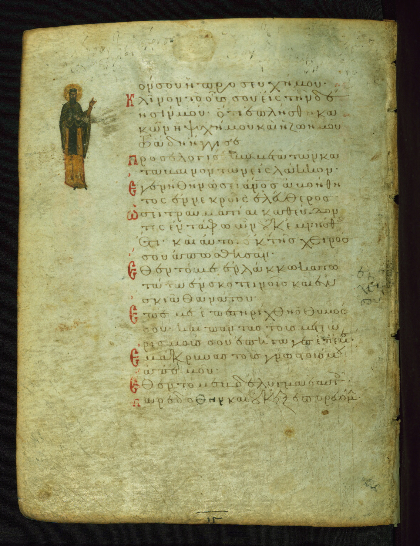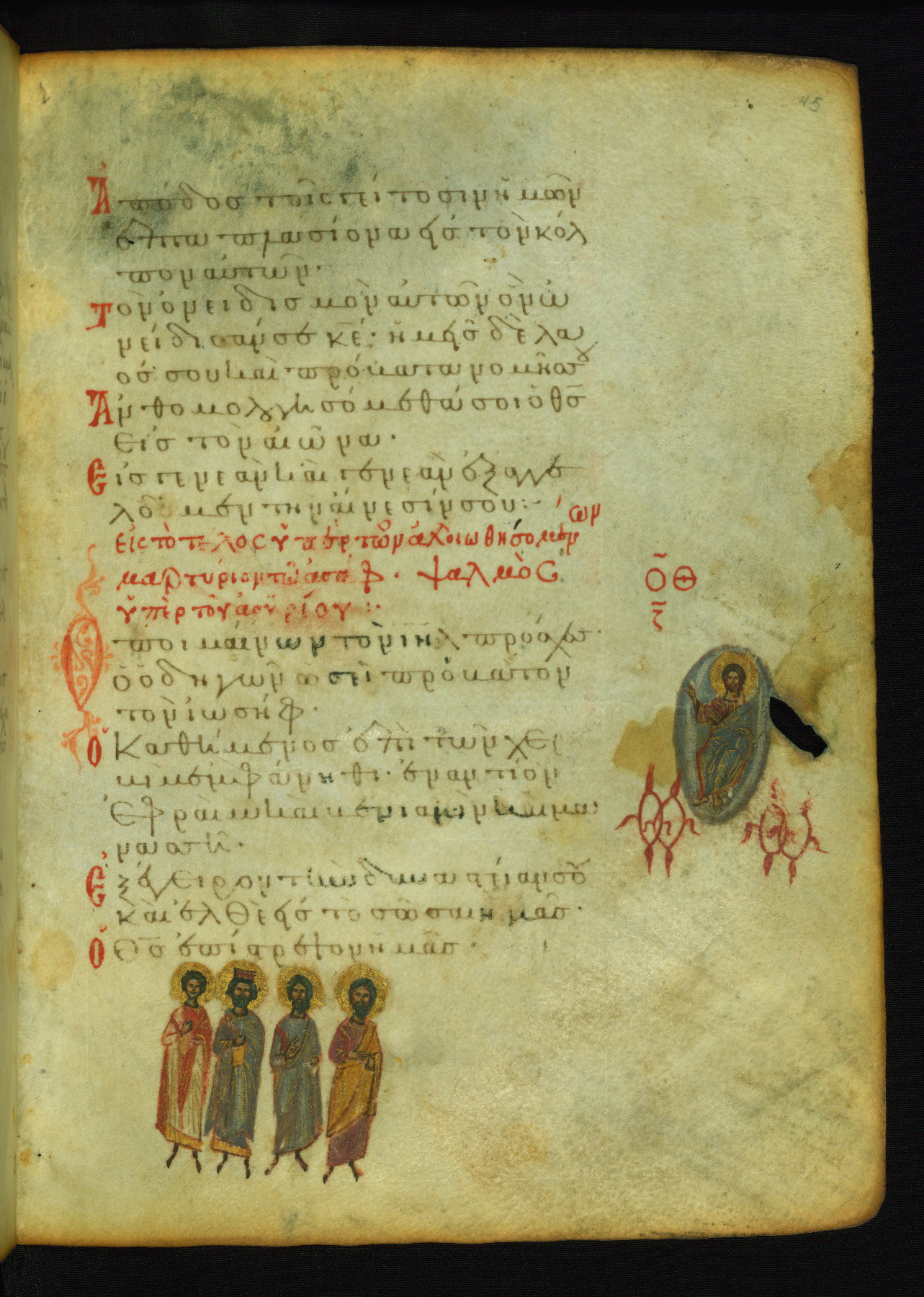 The lower of these two scenes illustrates the verse (marked with red dots) "But as for me, I hoped in the Lord; I will rejoice and be glad in your mercy, because you looked upon my humiliation." A saint clad in bishop's garments in shown raising his hands in prayer toward Christ. The medallion in which God is portrayed symbolically represents Heaven. A similar scene is repeated above, possibly with reference to the verse "so that my glory may make music to you" (NETS).