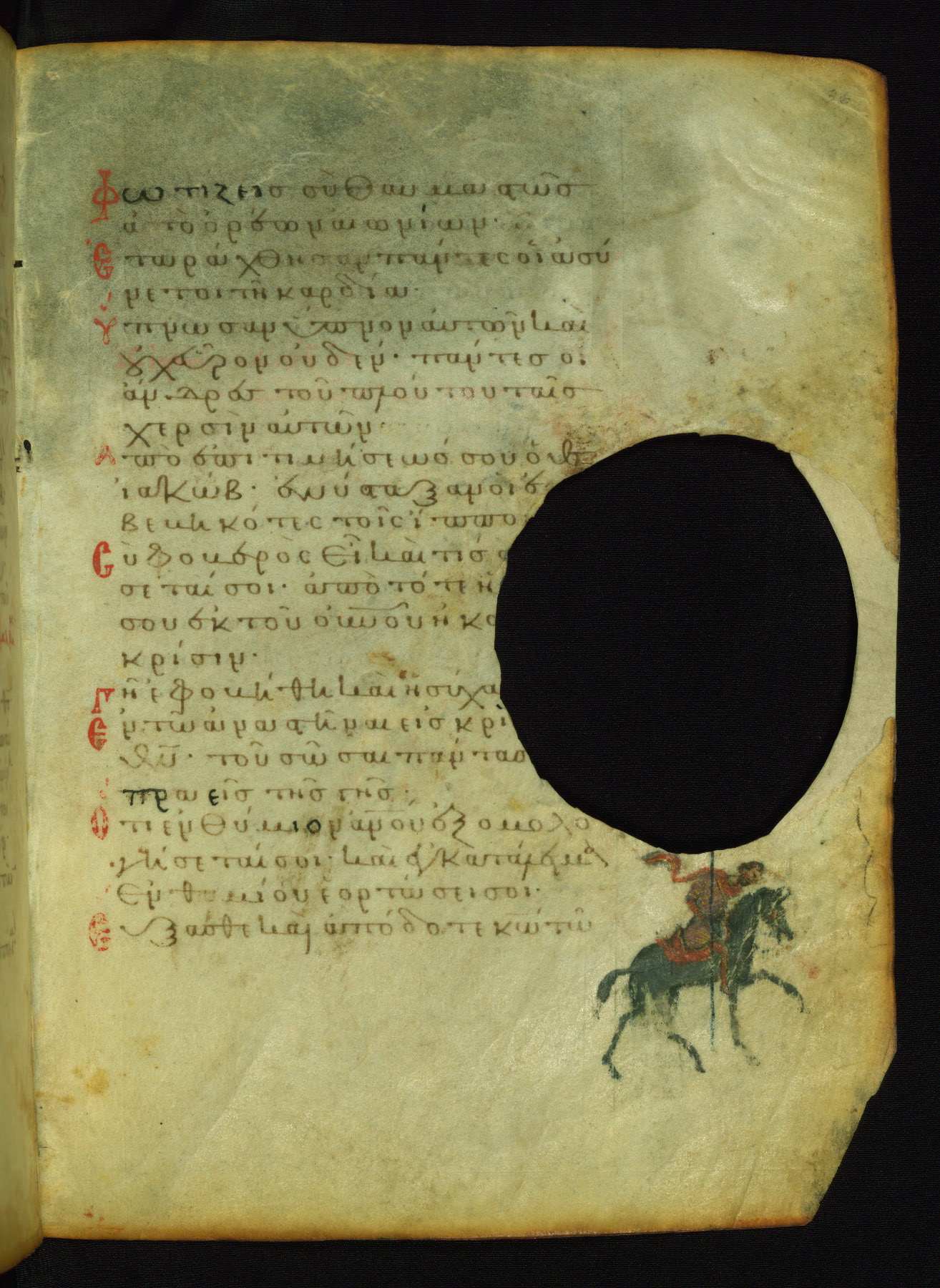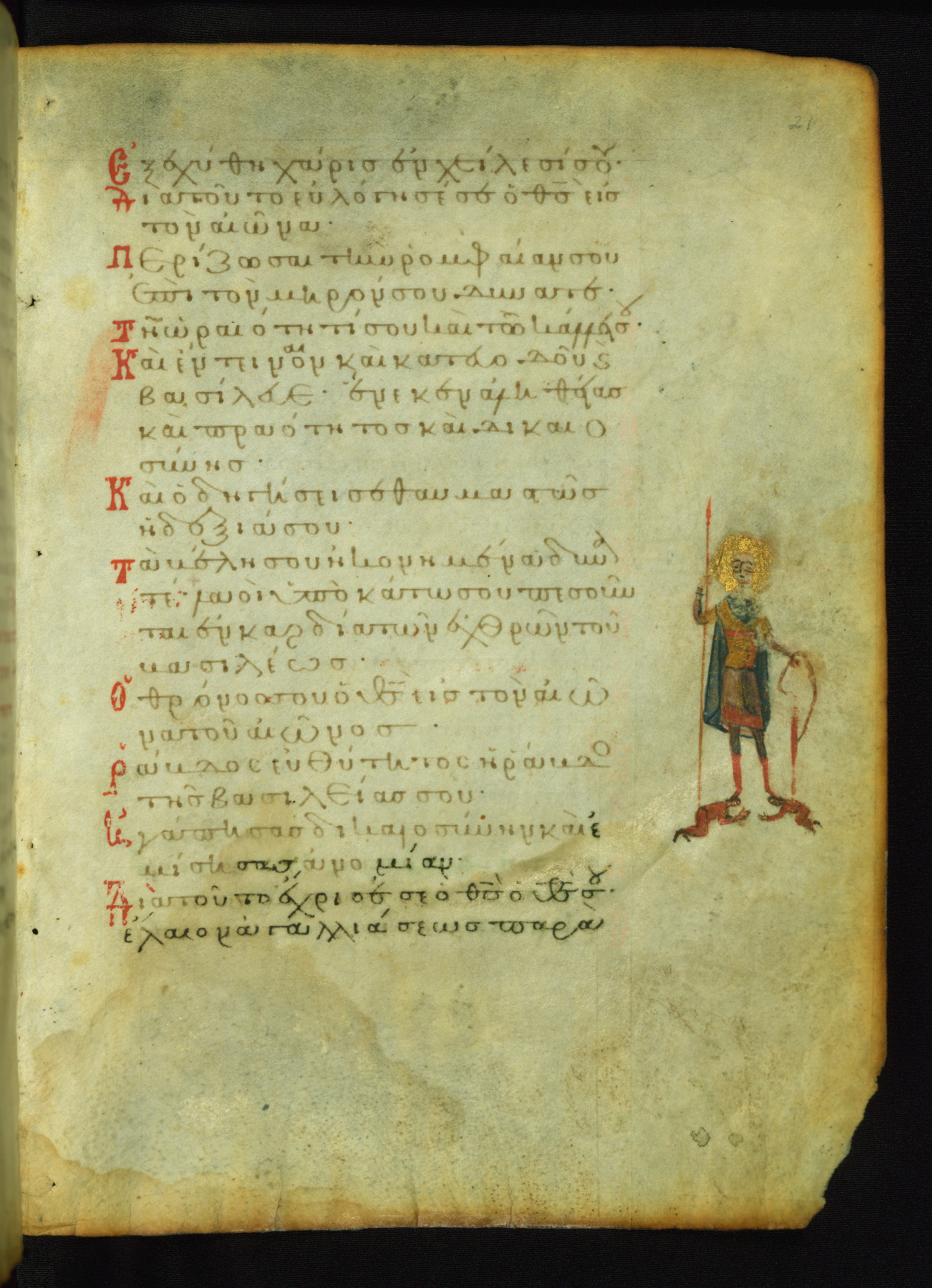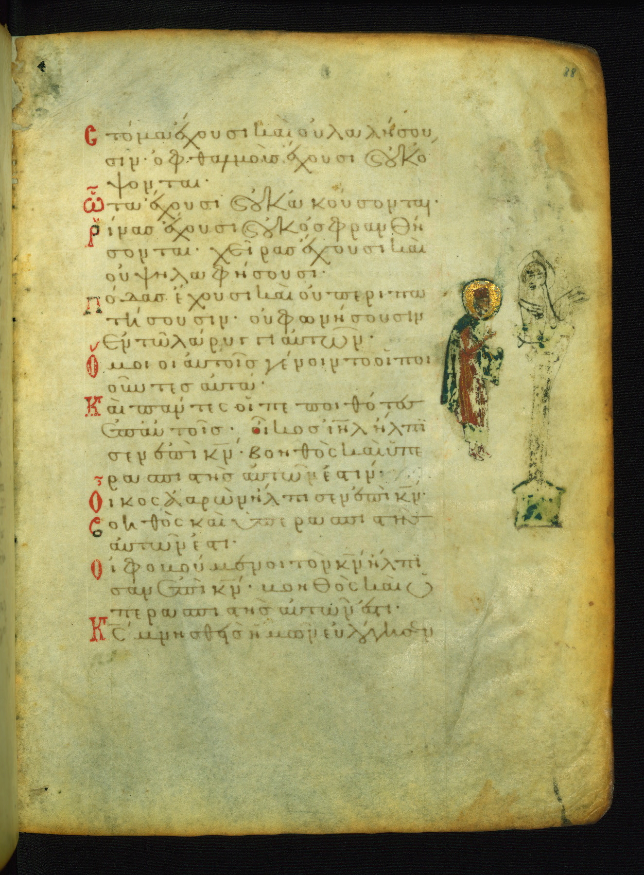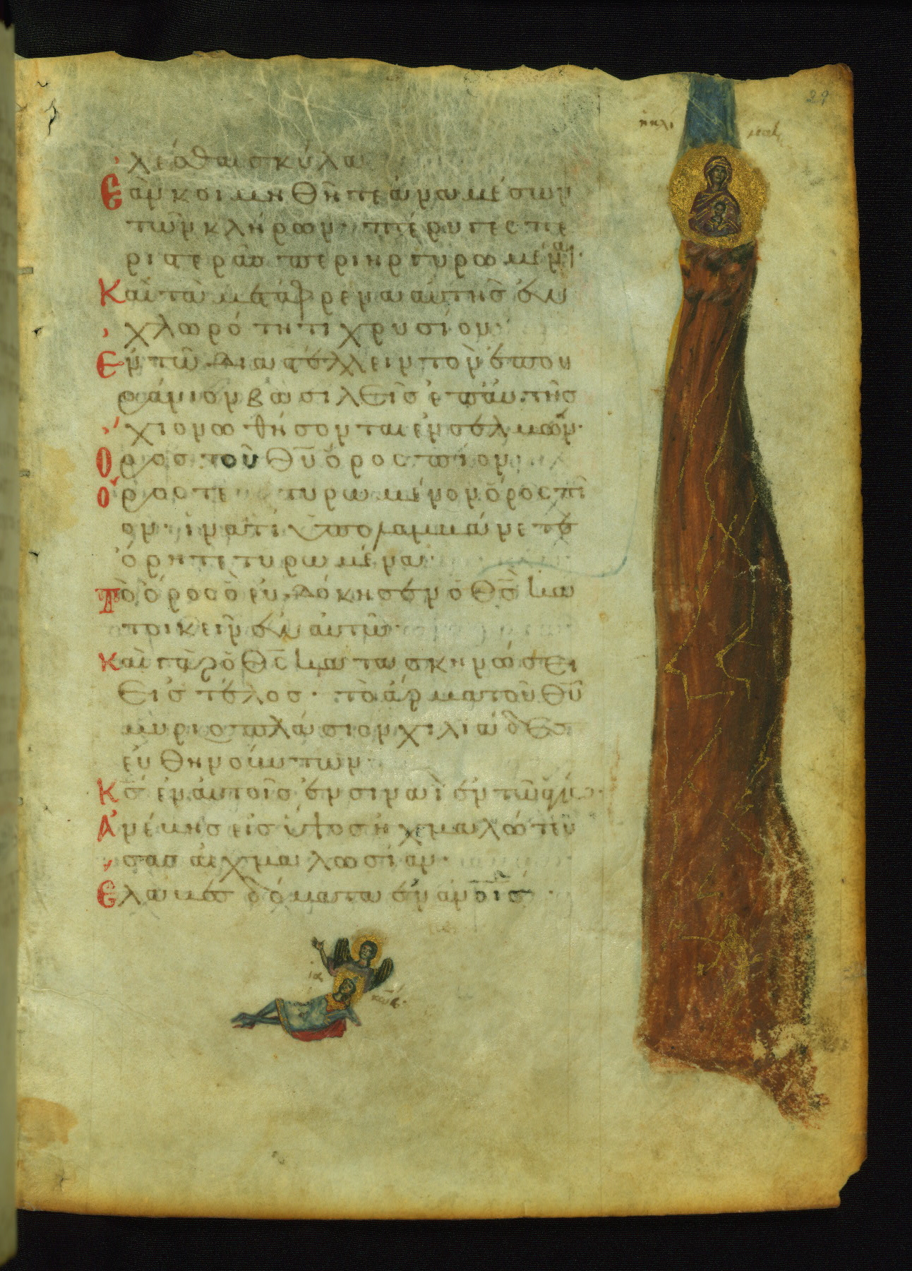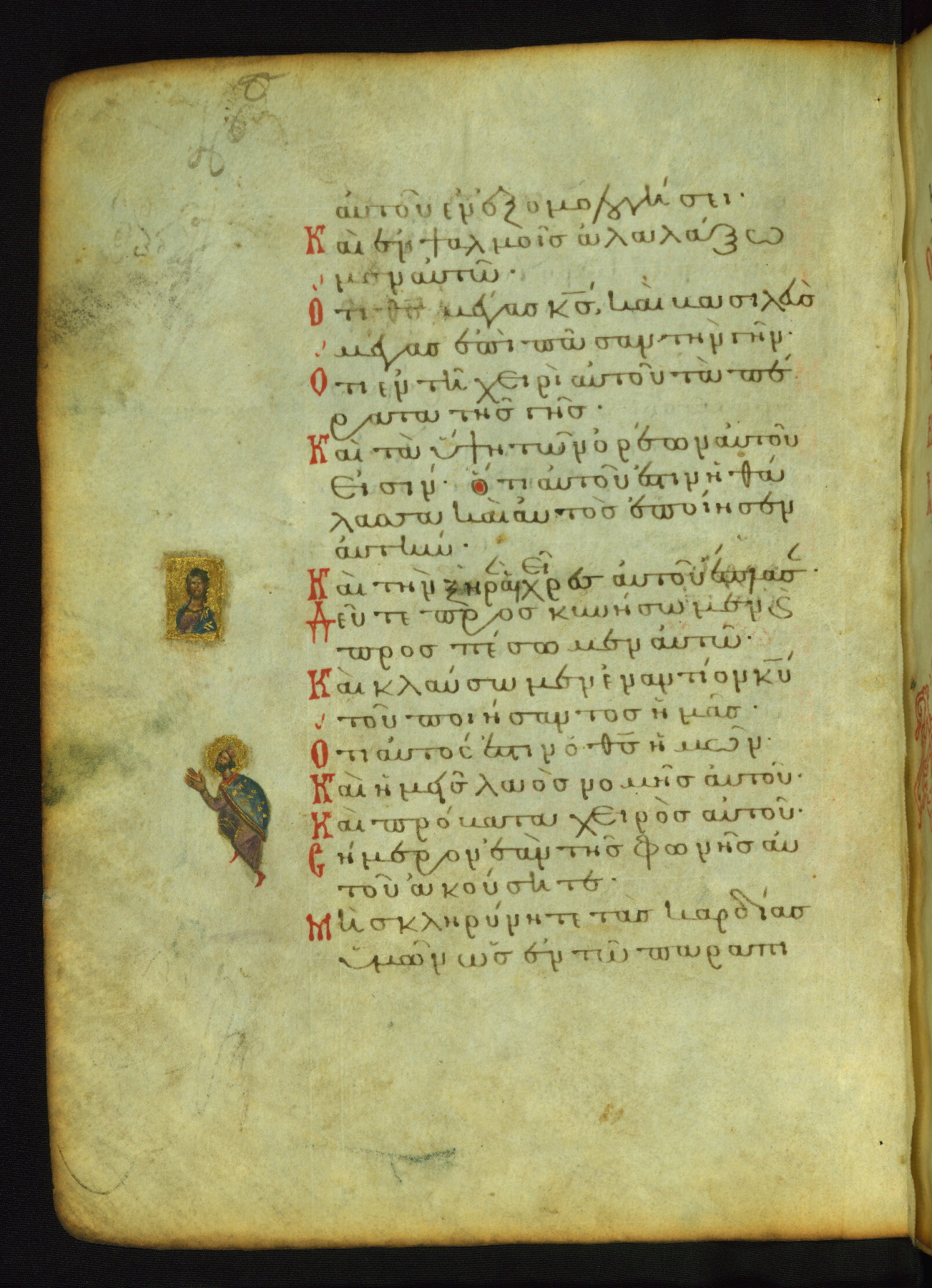 The lower of these two scenes illustrates the verse (marked with red dots) "But as for me, I hoped in the Lord; I will rejoice and be glad in your mercy, because you looked upon my humiliation." A saint clad in bishop's garments in shown raising his hands in prayer toward Christ. The medallion in which God is portrayed symbolically represents Heaven. A similar scene is repeated above, possibly with reference to the verse "so that my glory may make music to you" (NETS).