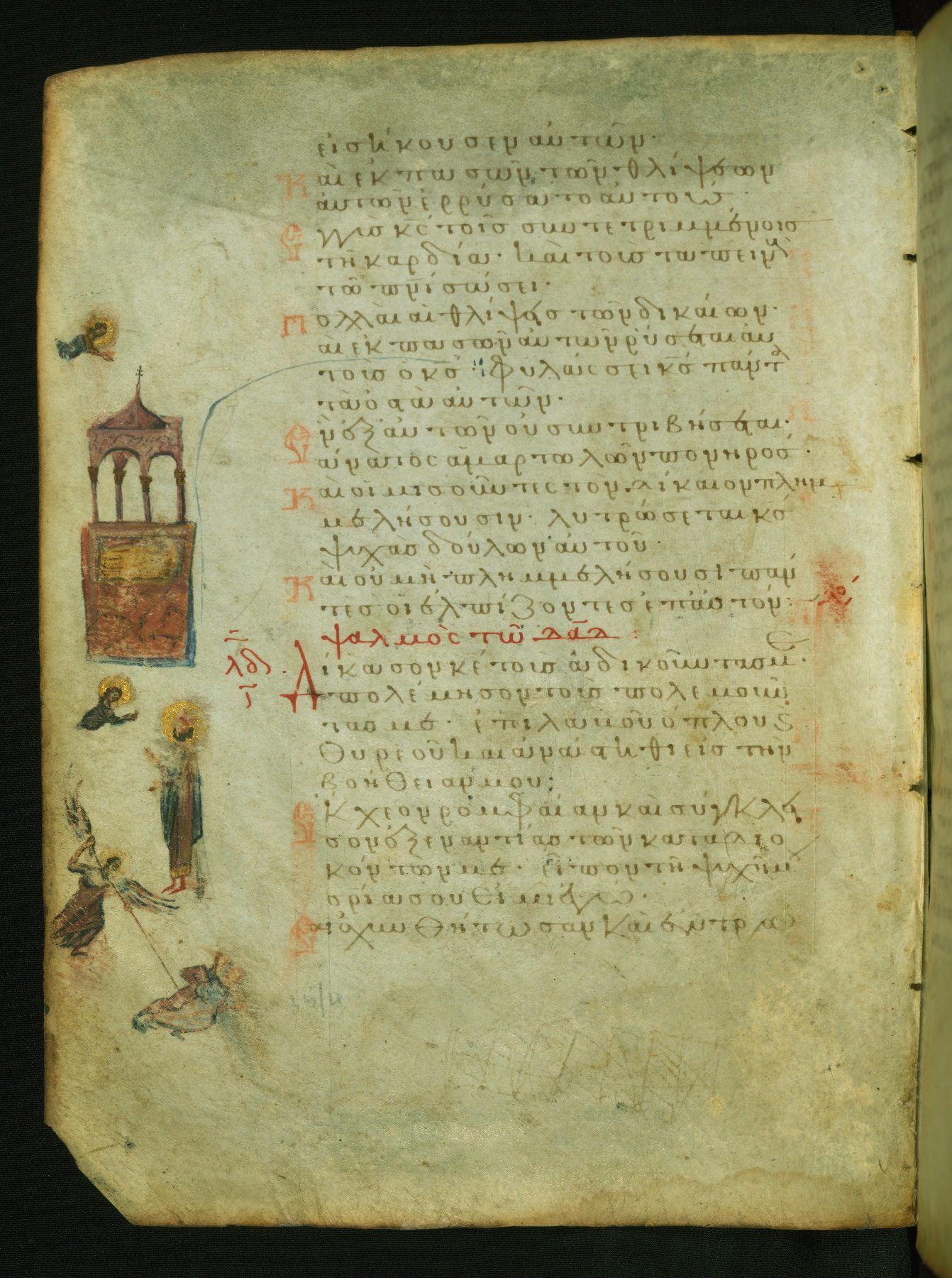 The picture here illustrates the psalm verse (marked with three red dots in the text, toward the bottom of the page) "O Lord, you brought up my soul from Hades" (NETS). Hades (Hell) is personified by a monstrous giant. An angel is pulling out a man (perhaps King David, the psalm's author) by his arms .