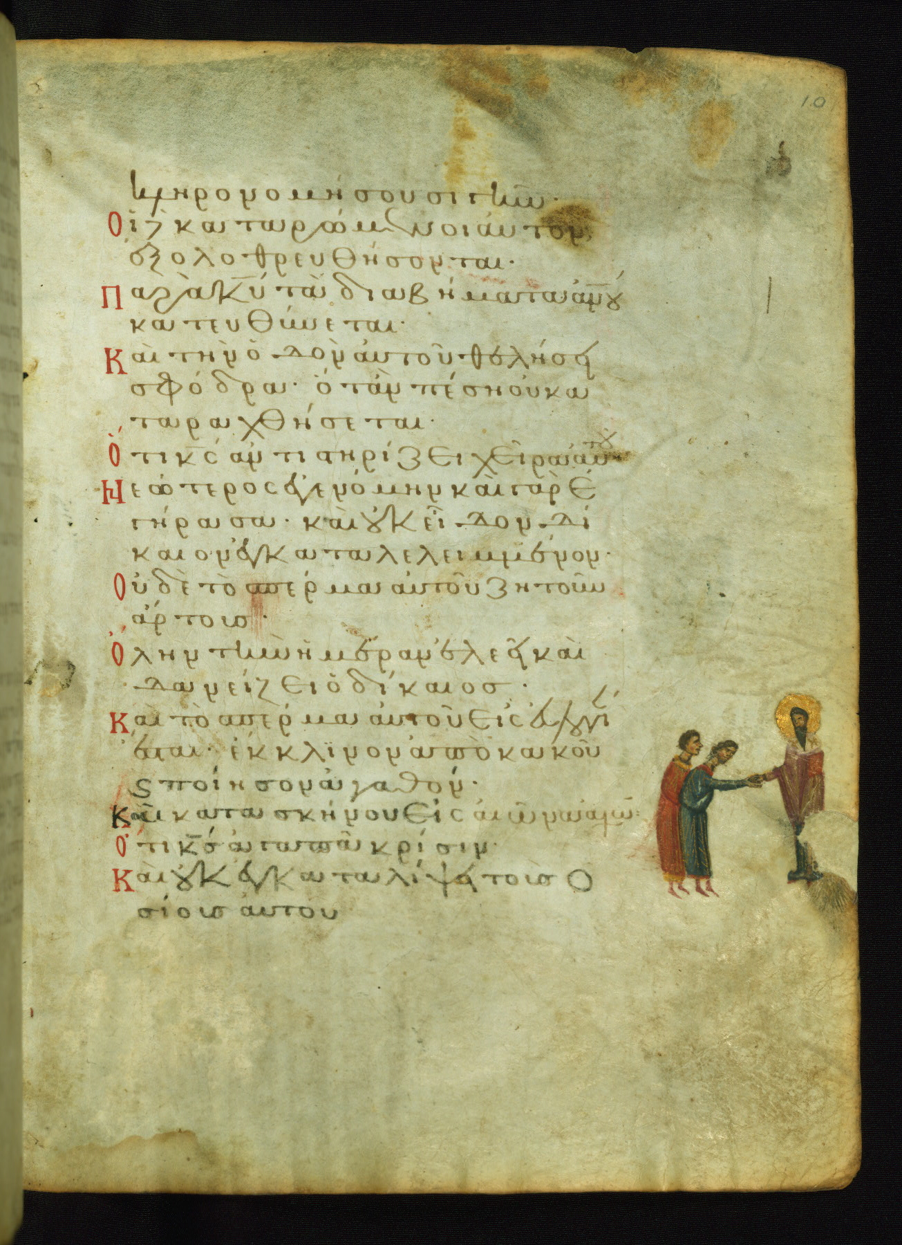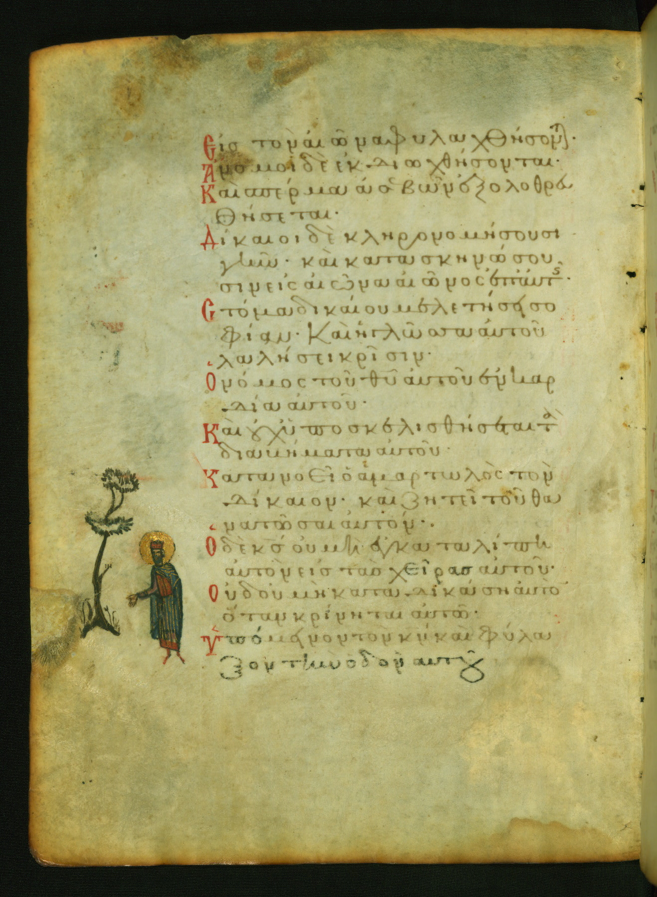 The image here evidently illustrates the words "all day long he is merciful and lends" (NETS). The "righteous man" of the psalm is represented by a bishop saint.