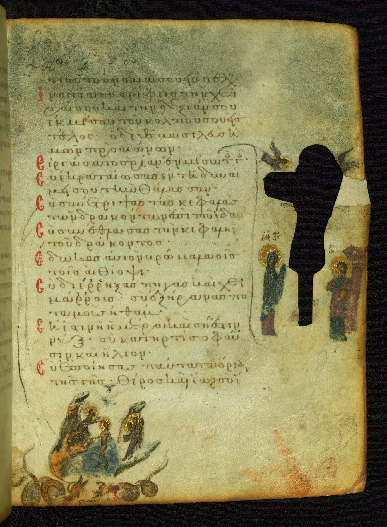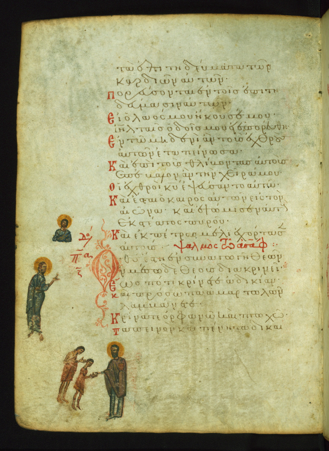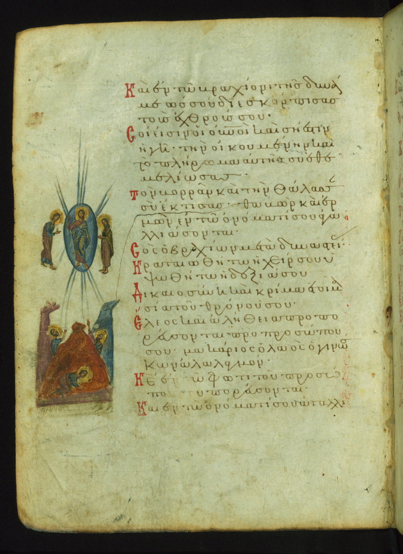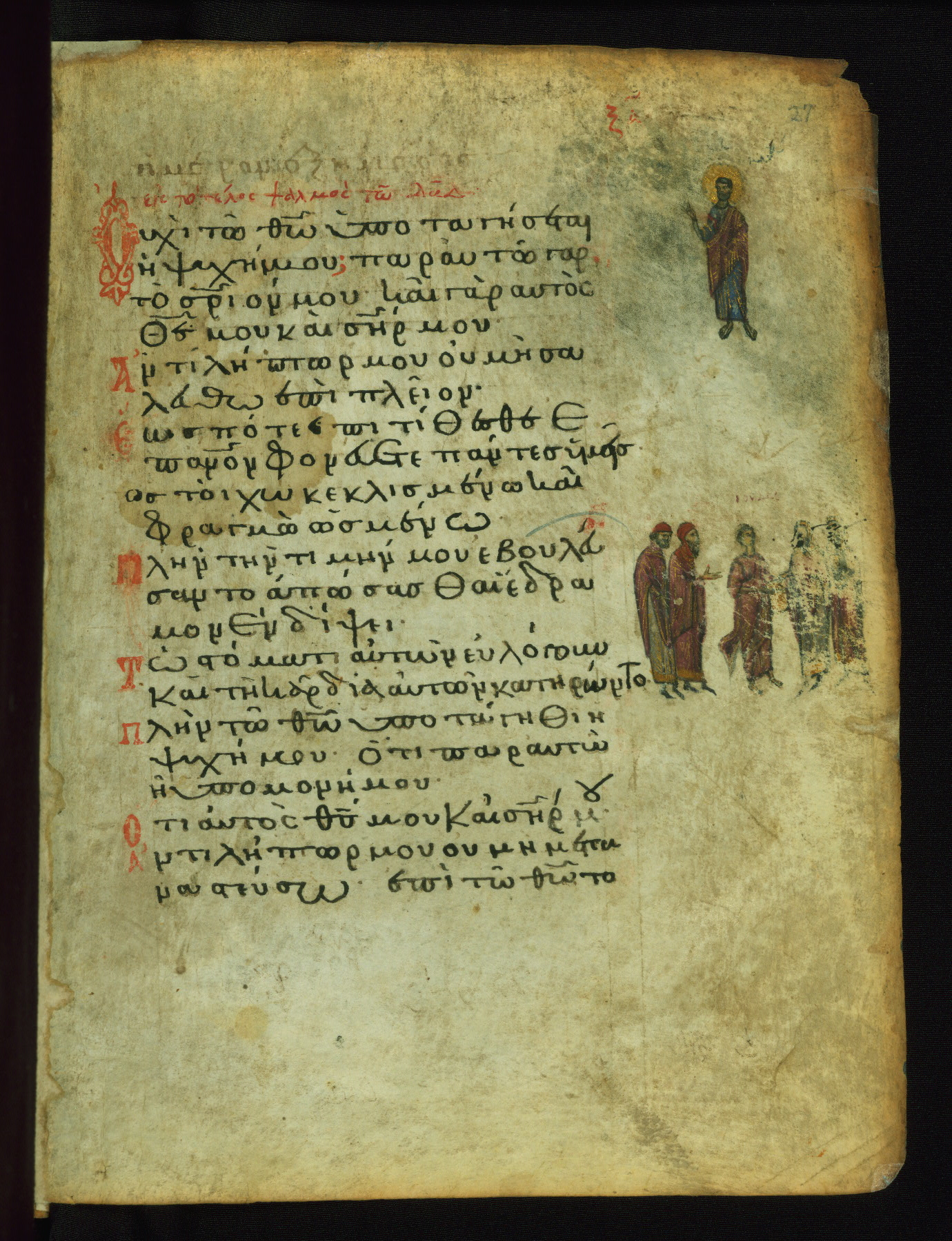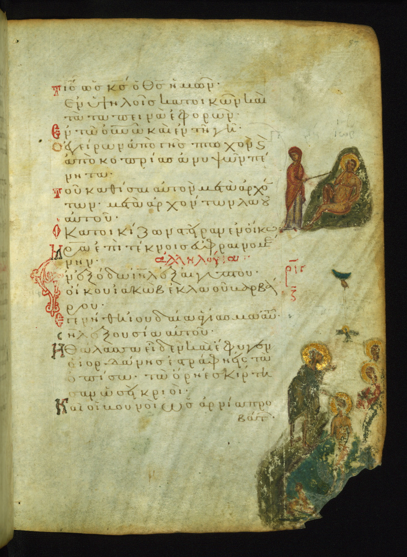 The miniature with Job and his wife (Job 2:7-10) illustrates the words "It is he [God] who raises a poor one from the ground, and from a trash heap he lifts a needy one" (NETS). The verse "The sea saw it and fled; Jordan was turned backwards" is accompanied by an image of Christ's baptism, including personifications of Jordan and the (now lost) Sea.