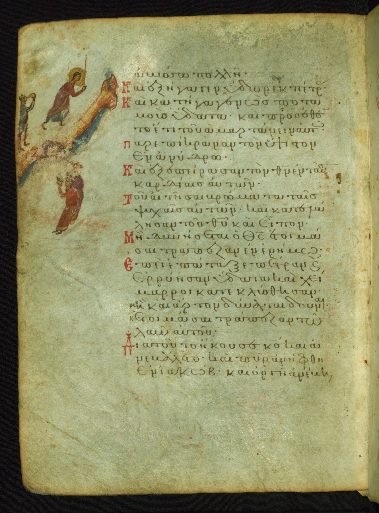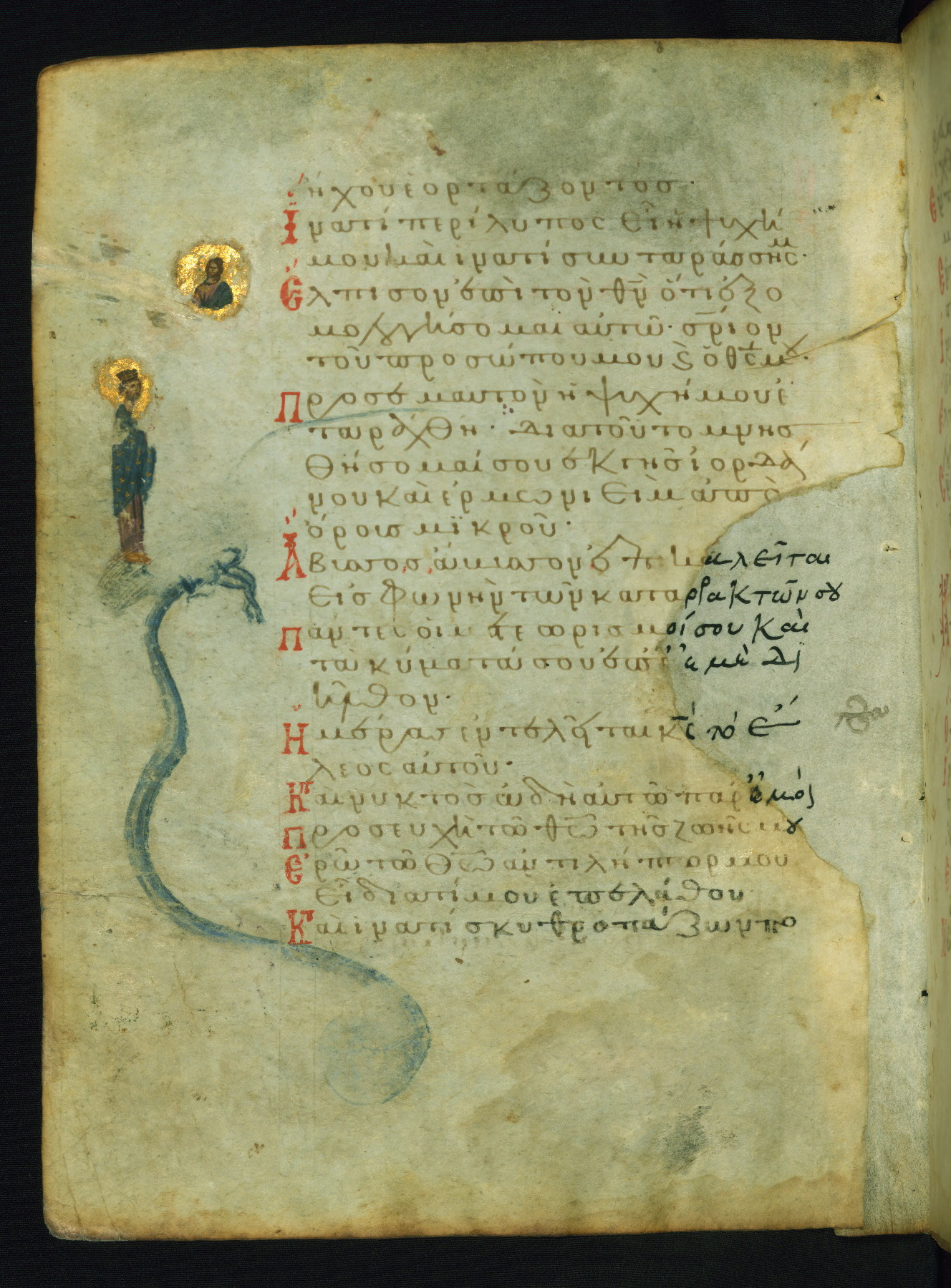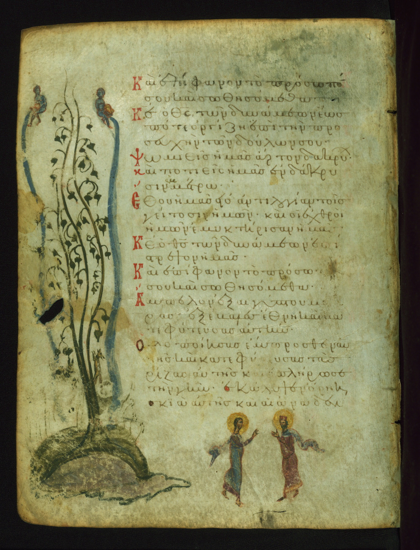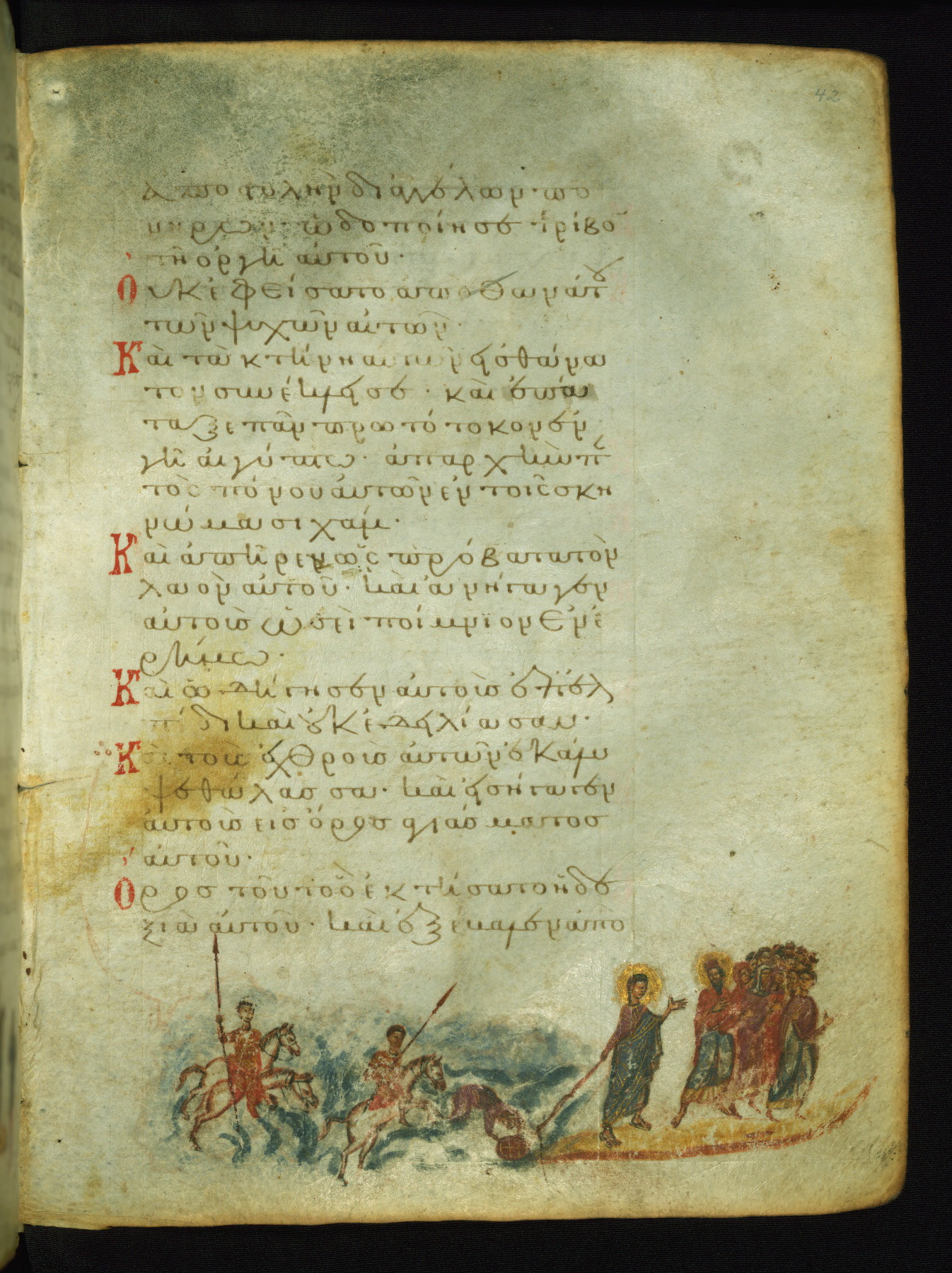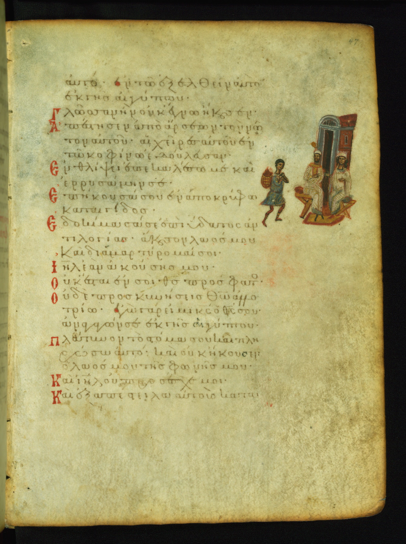 The miniature with Job and his wife (Job 2:7-10) illustrates the words "It is he [God] who raises a poor one from the ground, and from a trash heap he lifts a needy one" (NETS). The verse "The sea saw it and fled; Jordan was turned backwards" is accompanied by an image of Christ's baptism, including personifications of Jordan and the (now lost) Sea.