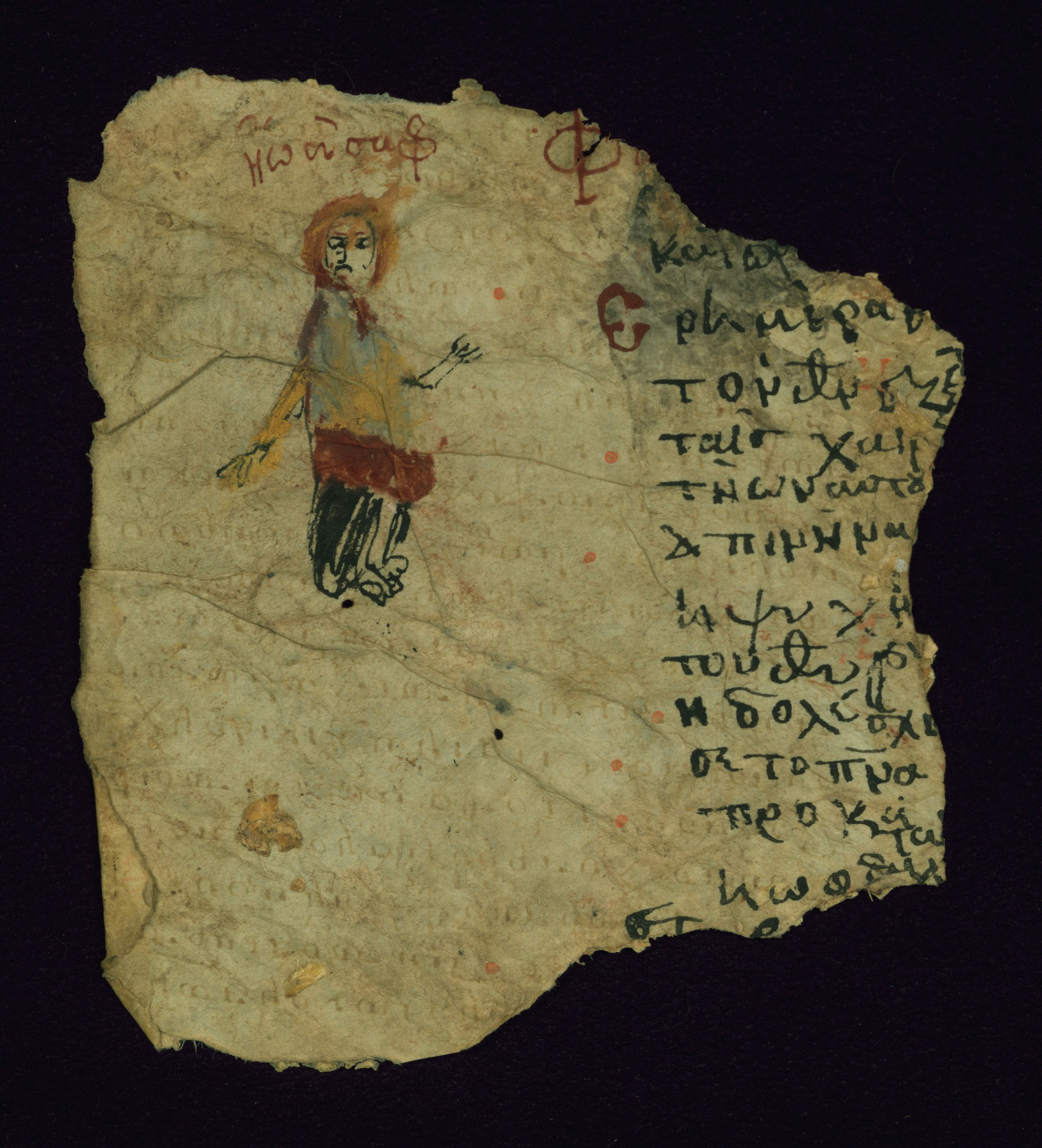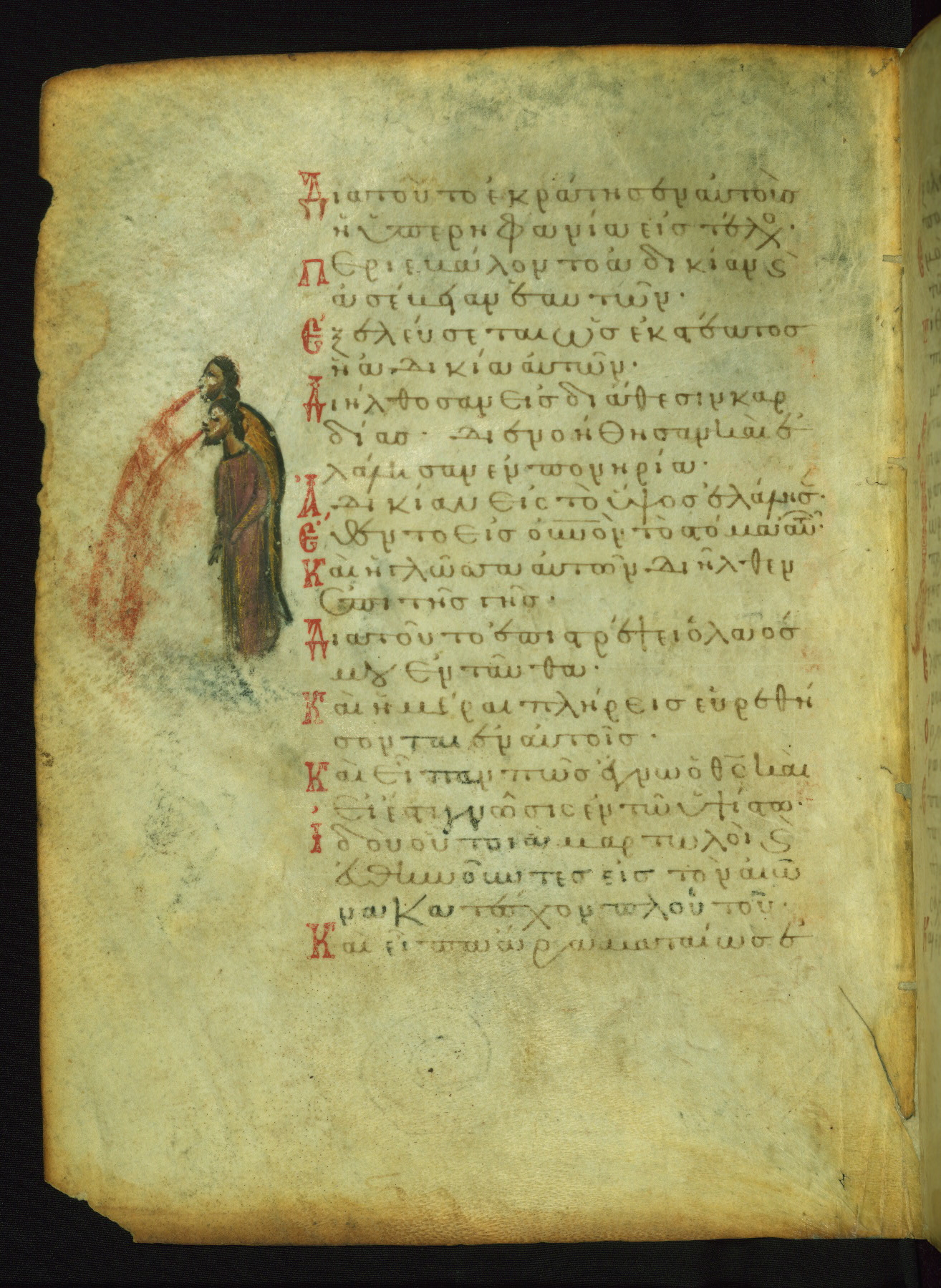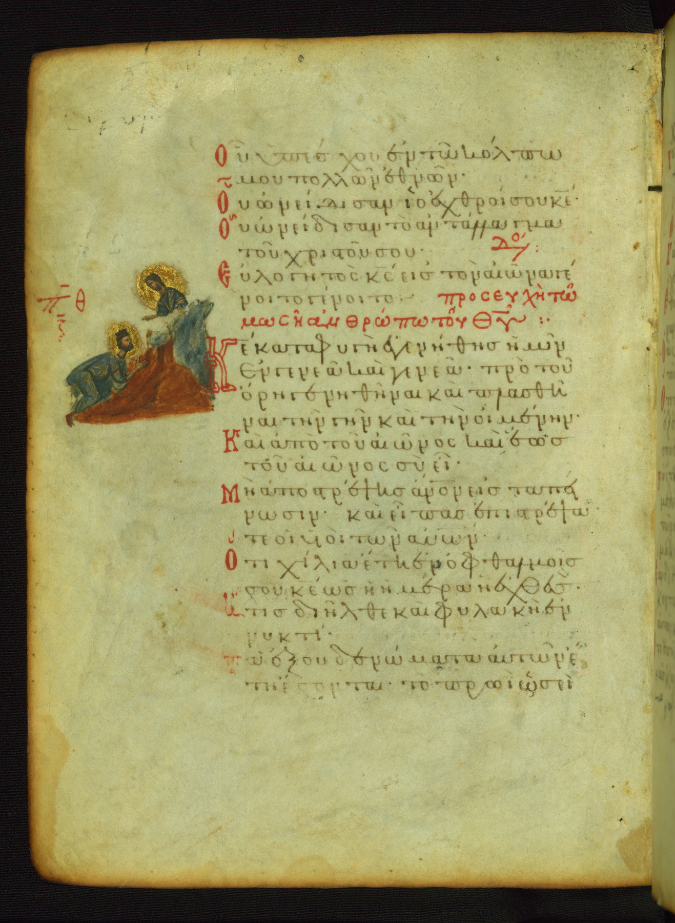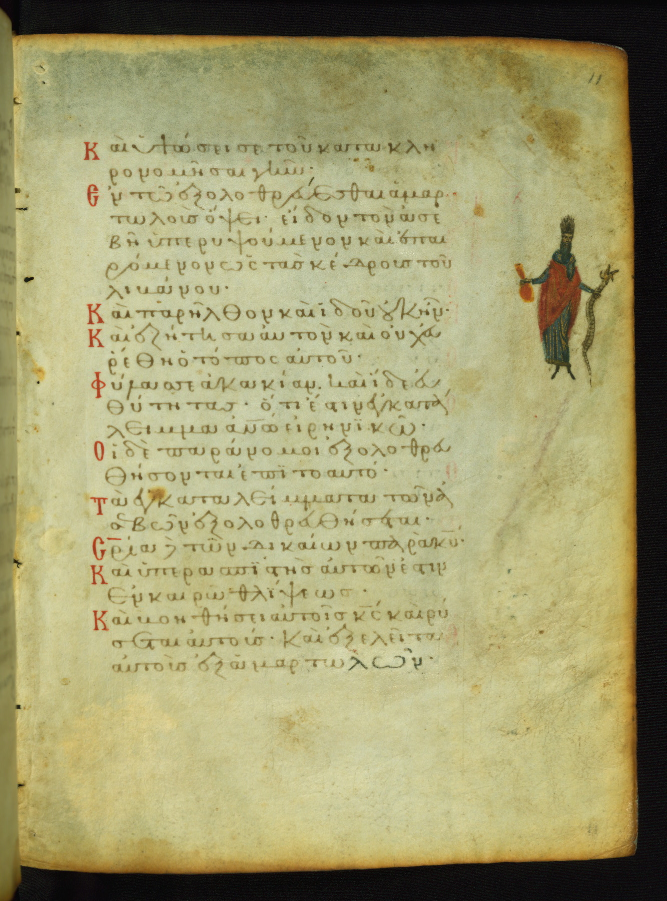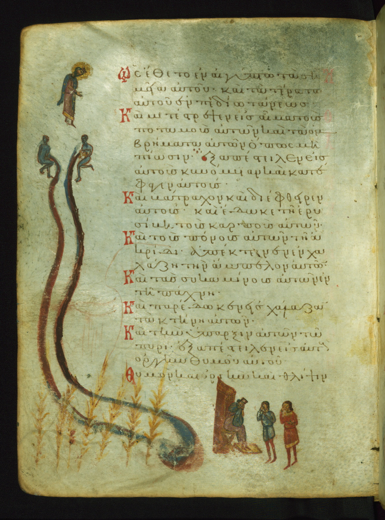 The miniature with Job and his wife (Job 2:7-10) illustrates the words "It is he [God] who raises a poor one from the ground, and from a trash heap he lifts a needy one" (NETS). The verse "The sea saw it and fled; Jordan was turned backwards" is accompanied by an image of Christ's baptism, including personifications of Jordan and the (now lost) Sea.