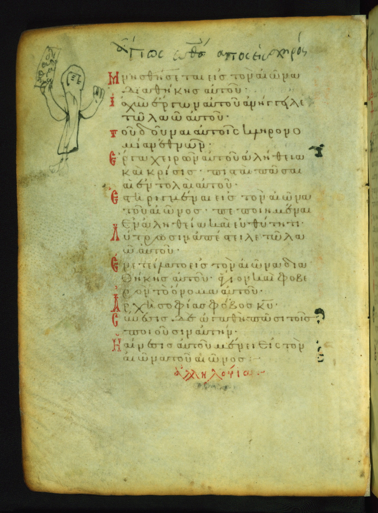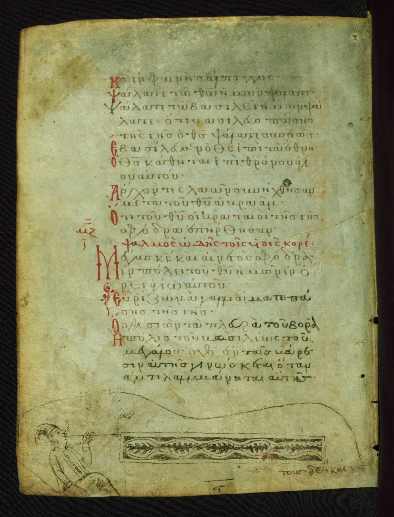 The person who added this naive drawing and the inscription in the upper margin clearly had problems with spelling. The text on the scroll which the unidentified figure holds probably reproduces, lamely, the word "covenant" found the first psalm verse on this page. The figure must have been meant to portray David, the author of most of the psalter.