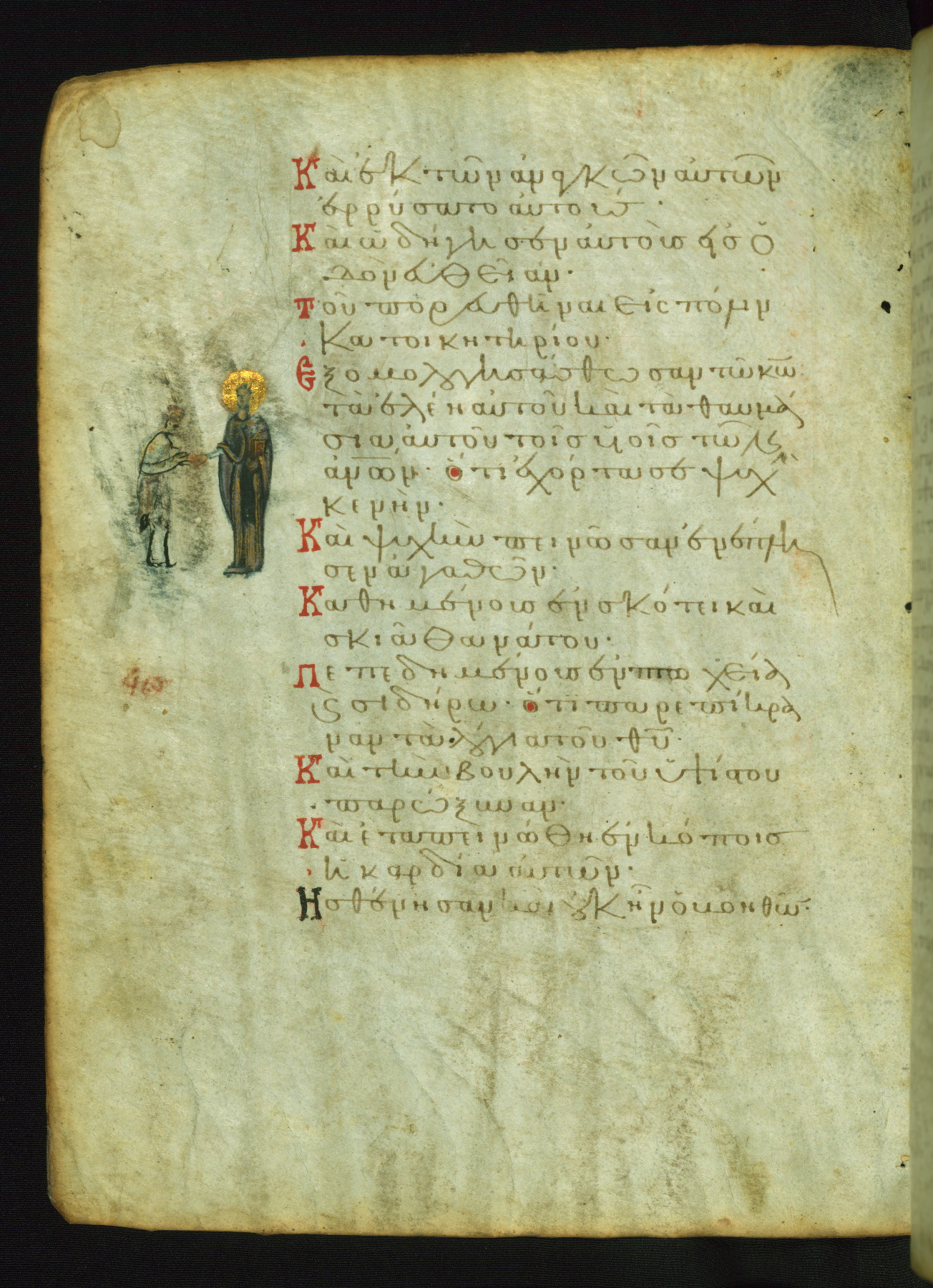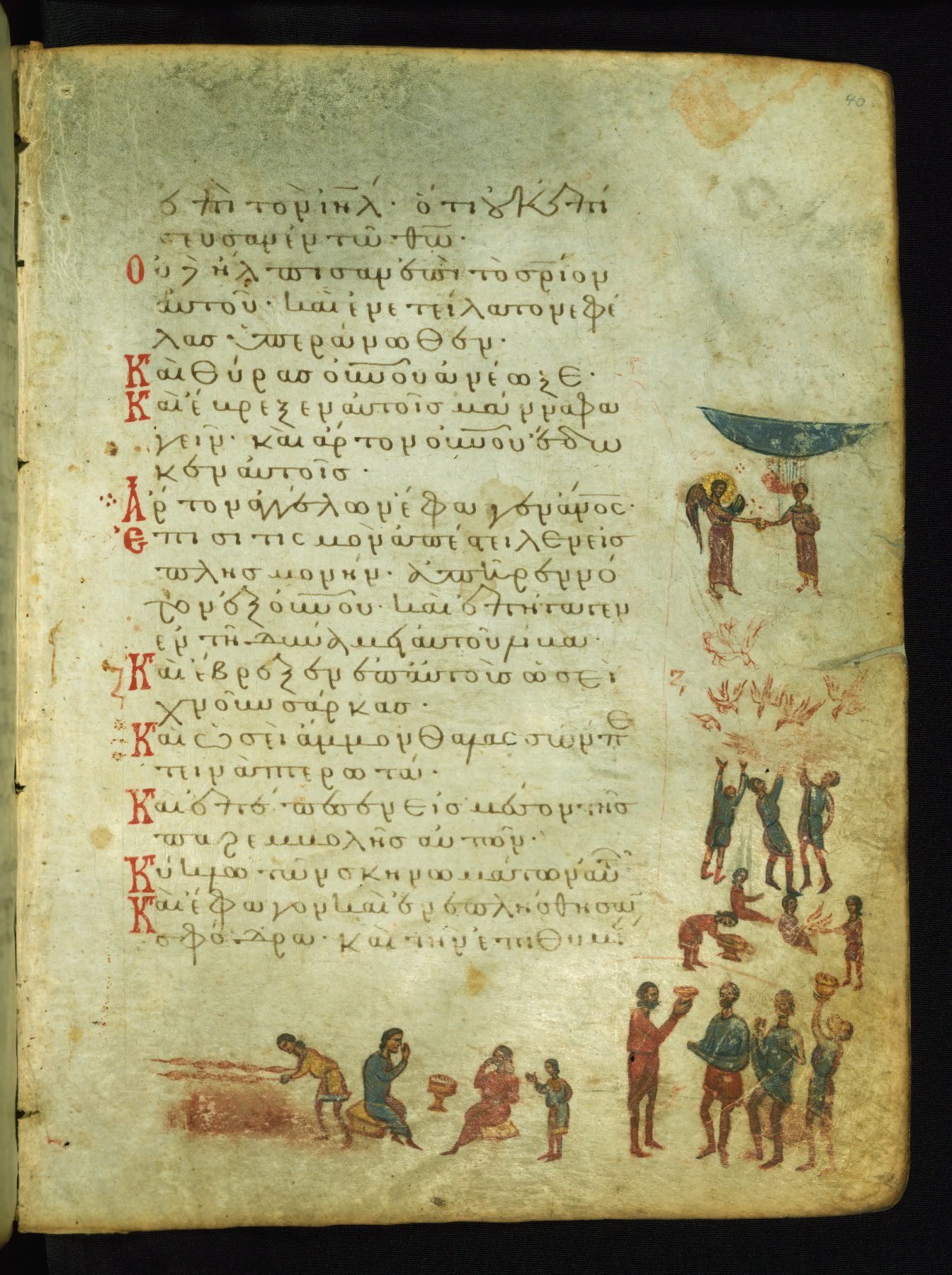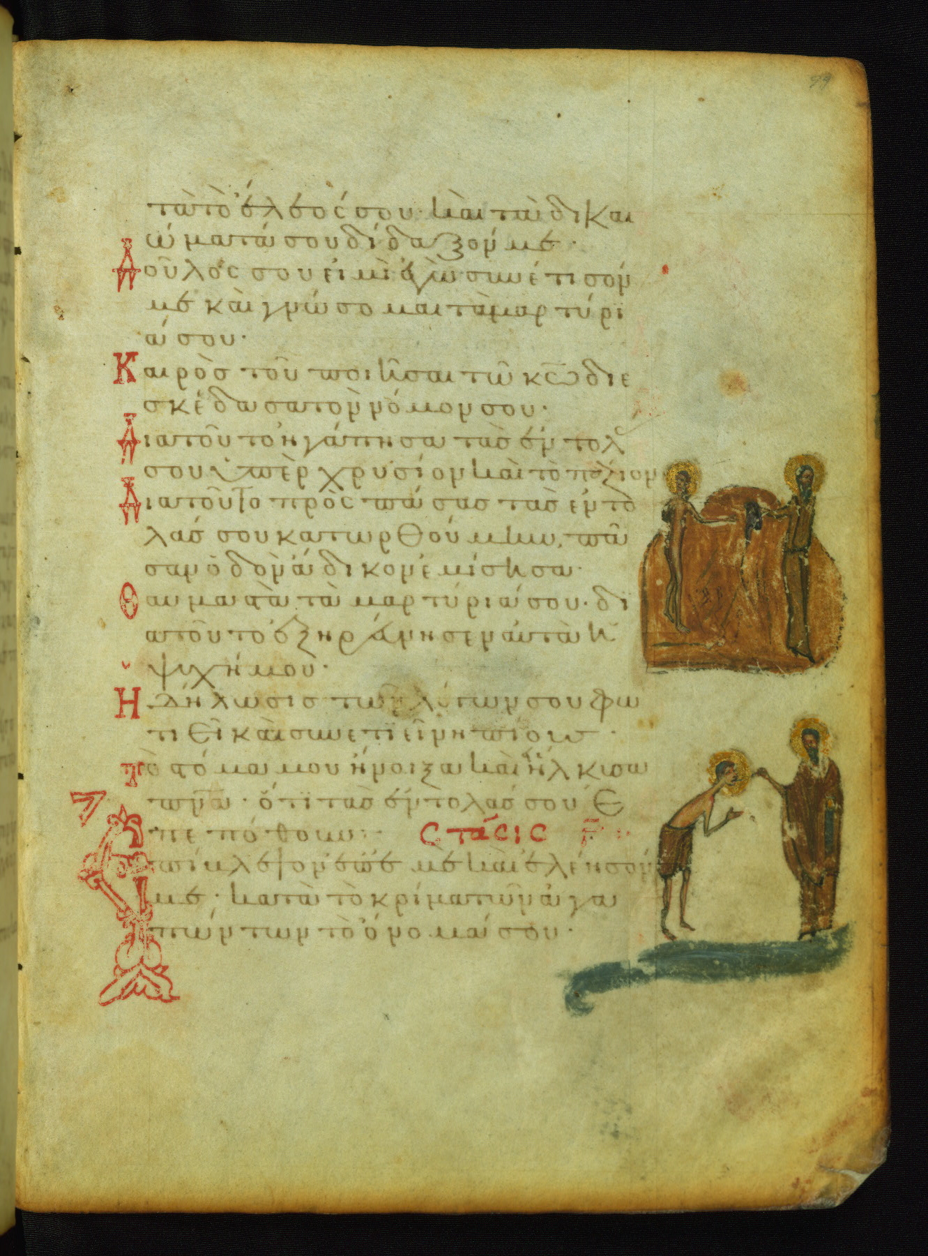 St. Mary of Egypt was a repentant harlot who became a solitary hermit. A priest named Zosimas accidentally found her in the desert and managed to bring Holy Communion to her shortly before her death. The upper miniature shows him handing Mary a cloak to hide her nudity. The scene of St. Mary's communion probably corresponds to the verse "I opened my mouth and drew breath, because I was longing for your commandments" (NETS).