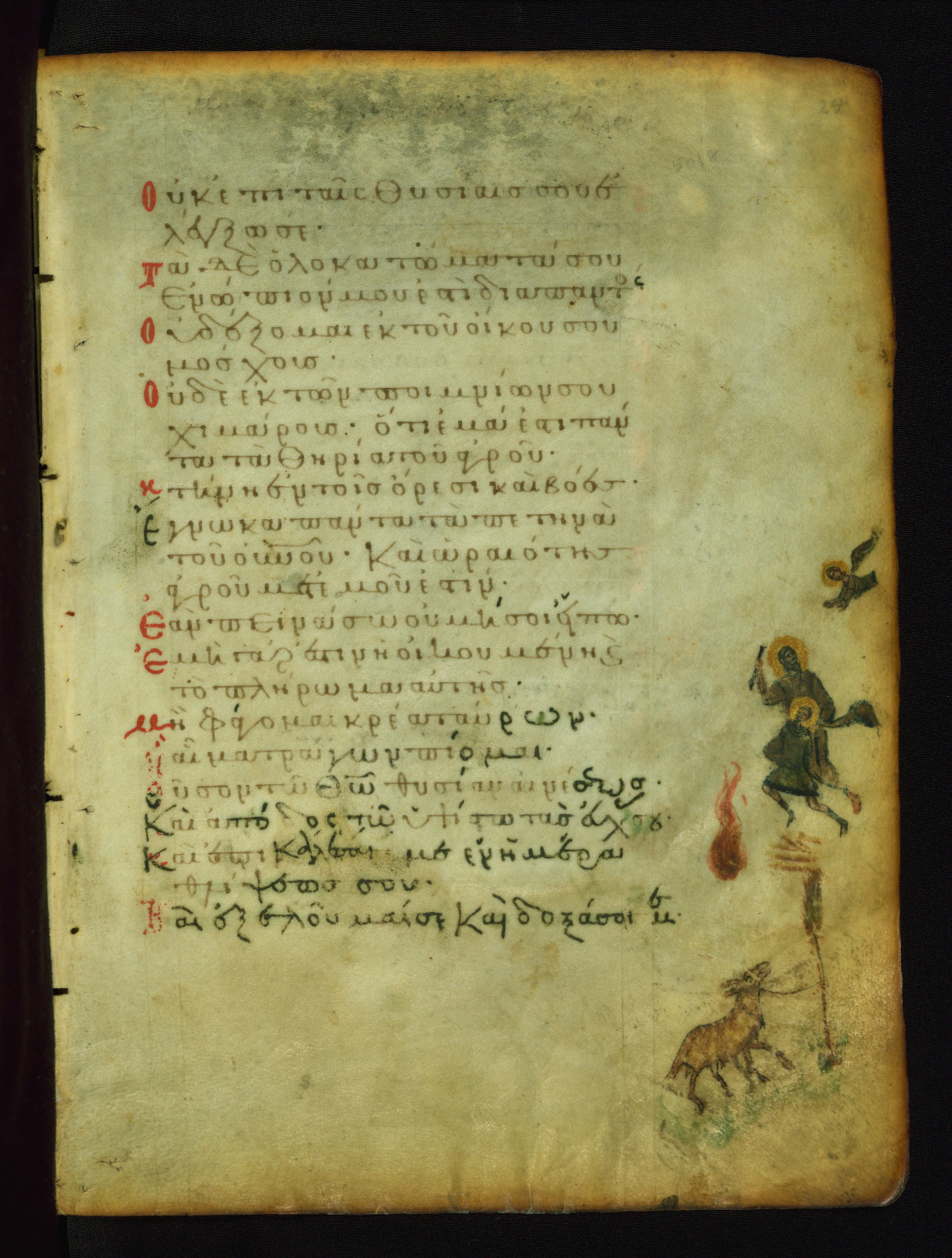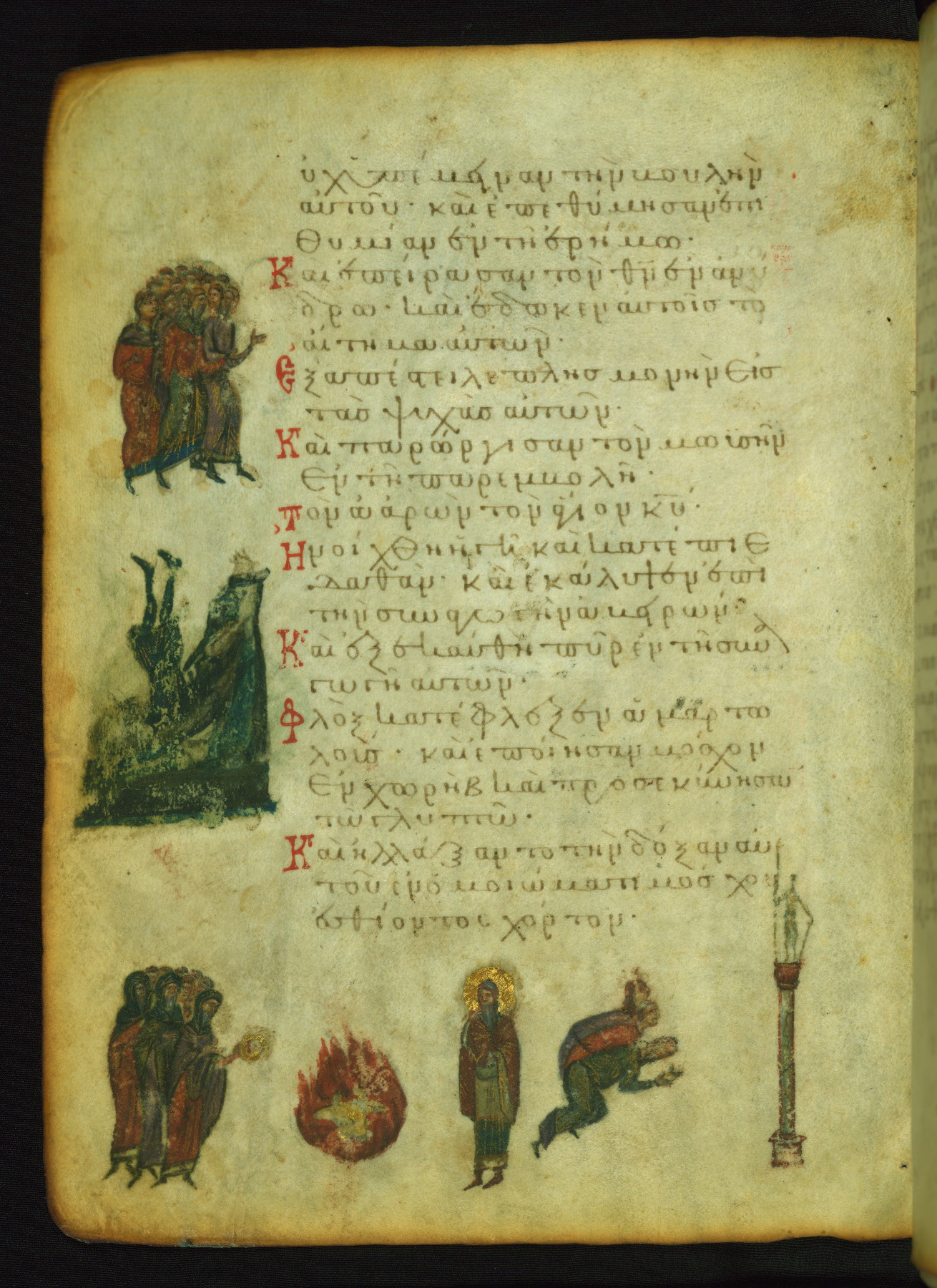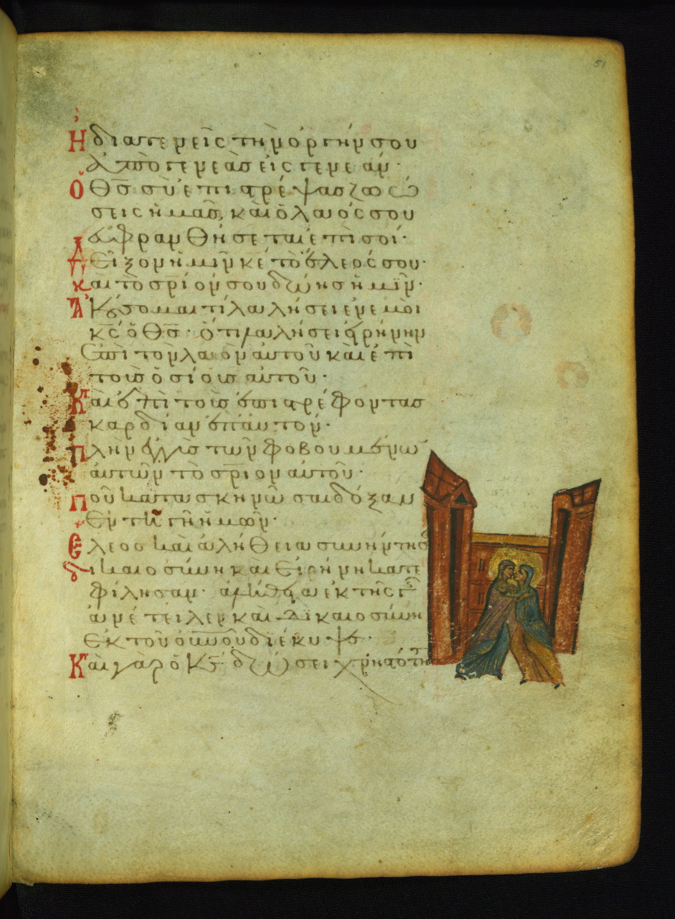 St. Mary of Egypt was a repentant harlot who became a solitary hermit. A priest named Zosimas accidentally found her in the desert and managed to bring Holy Communion to her shortly before her death. The upper miniature shows him handing Mary a cloak to hide her nudity. The scene of St. Mary's communion probably corresponds to the verse "I opened my mouth and drew breath, because I was longing for your commandments" (NETS).