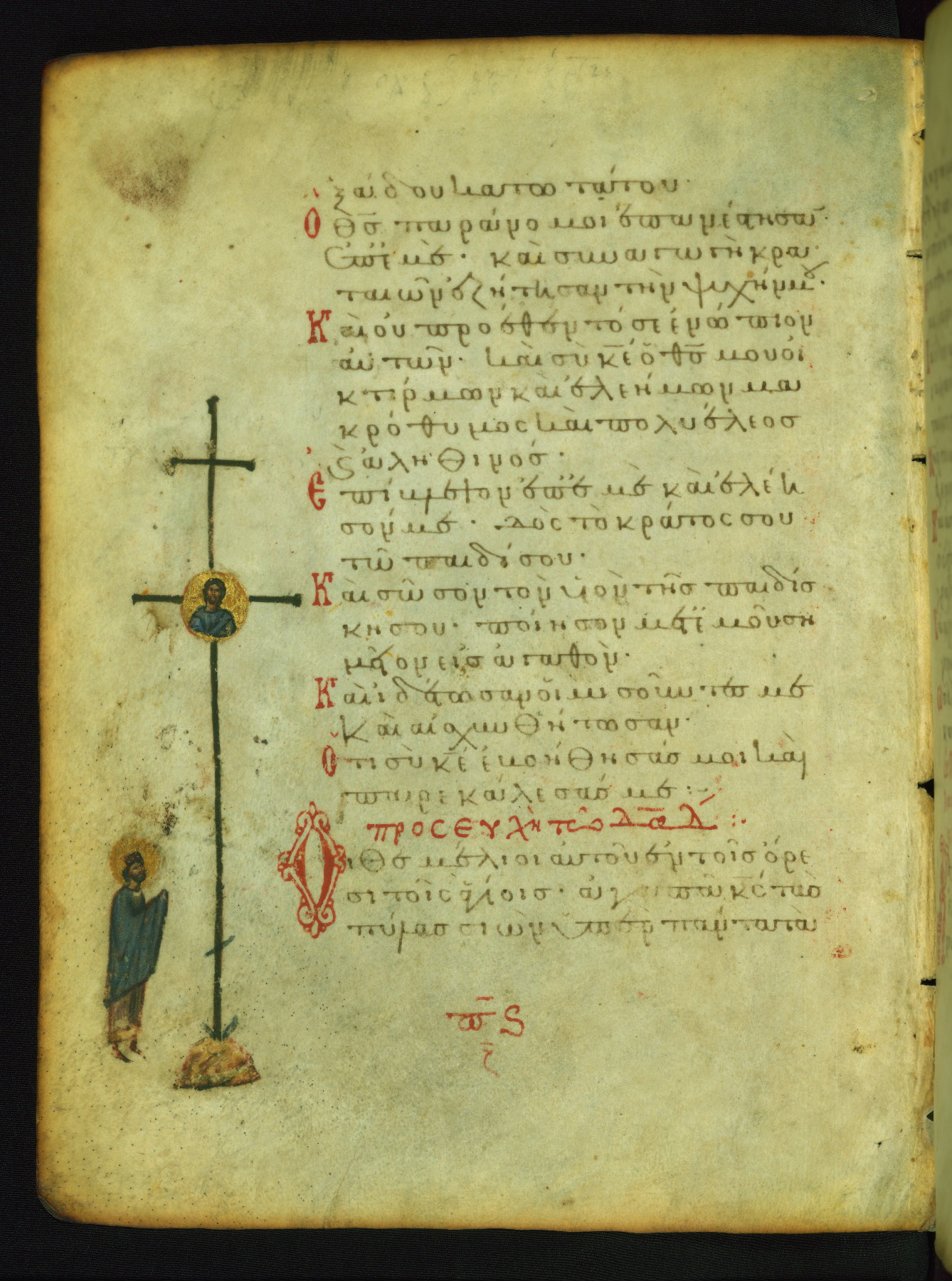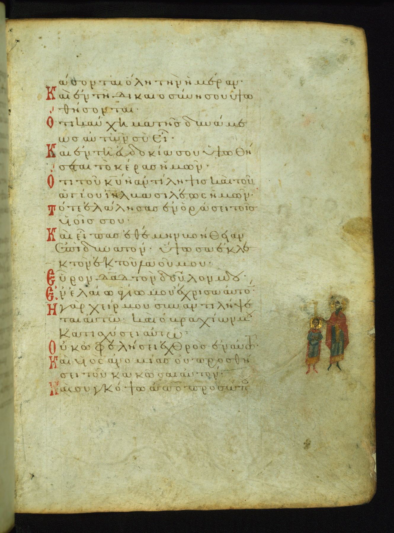 The image of David praying to an image of Christ superimposed upon a cross probably corresponds to the first verse on the page: "because with you is life's fountain" (NETS). The cross is traditionally termed "a fount (or source) of life." Below is a largely re-inked image of a bishop saint, whose precise connection to the first verses of Psalm 36 is unclear.