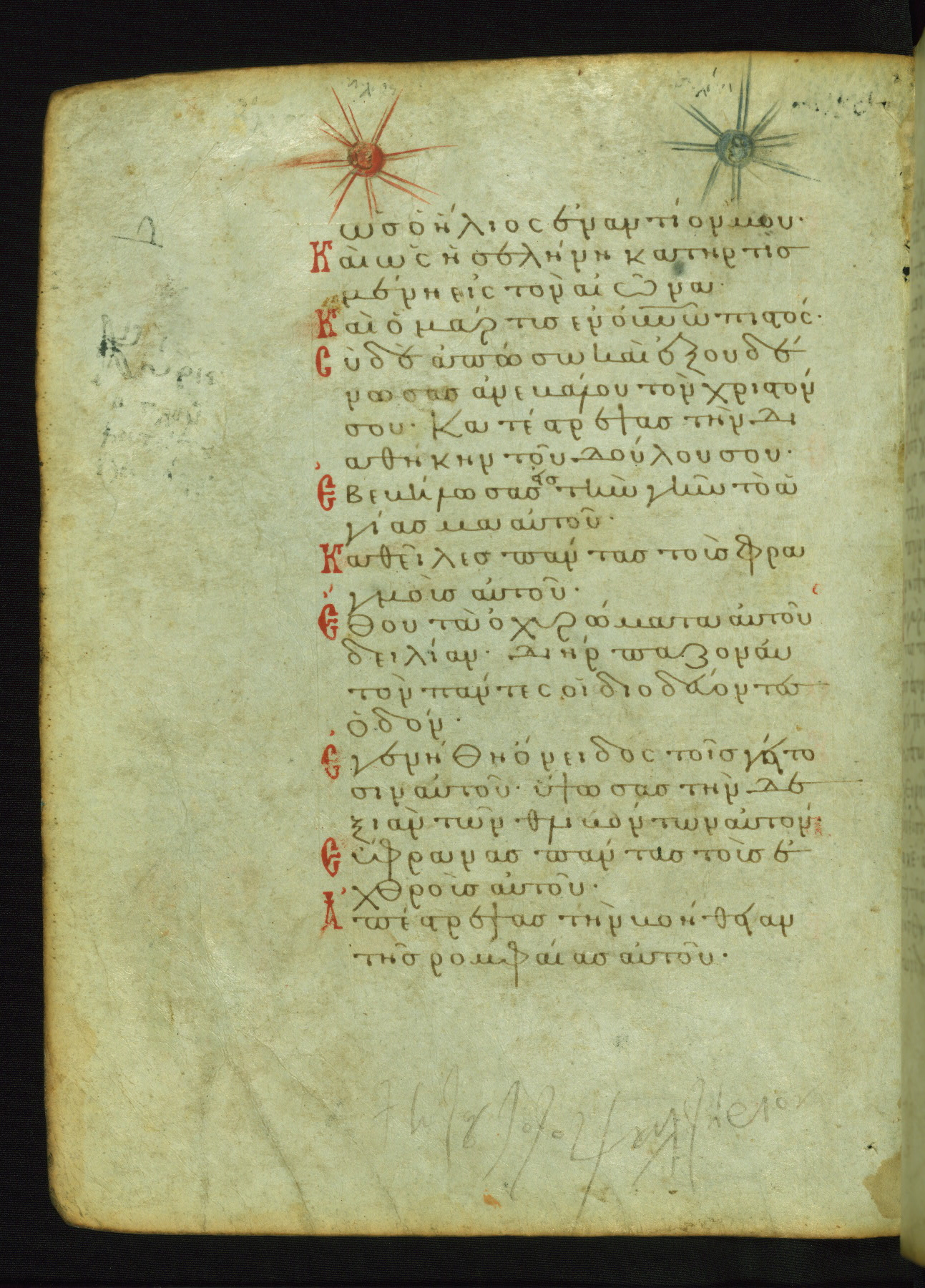 Later inscriptions in black ink identify the figures here as "Jesus Christ" and "a poor man," referring to the verse "This poor one cried, and the Lord listened to him" (NETS). However, a line connects the figure of Christ to the words "and let us exalt his name together" in the text.